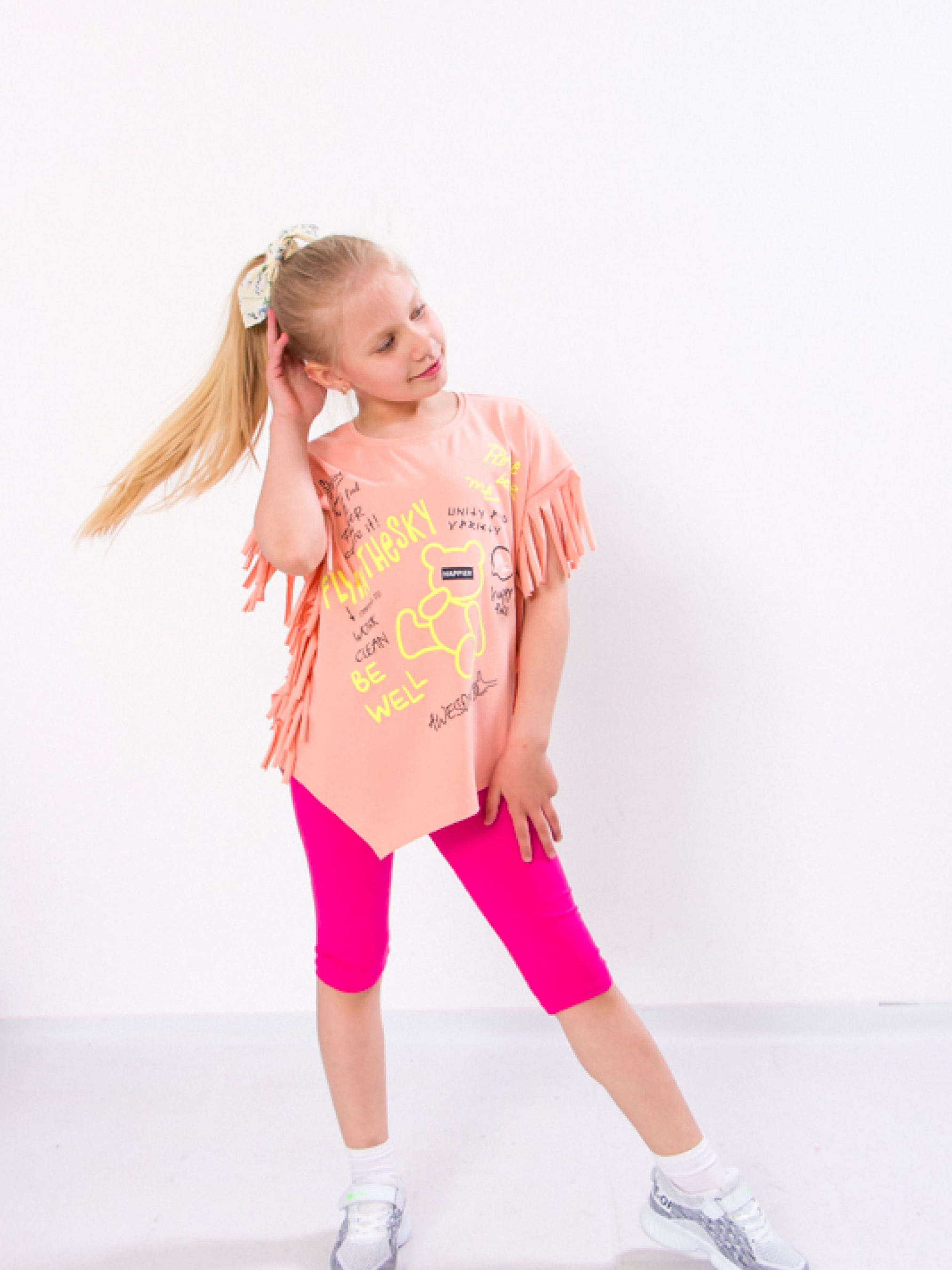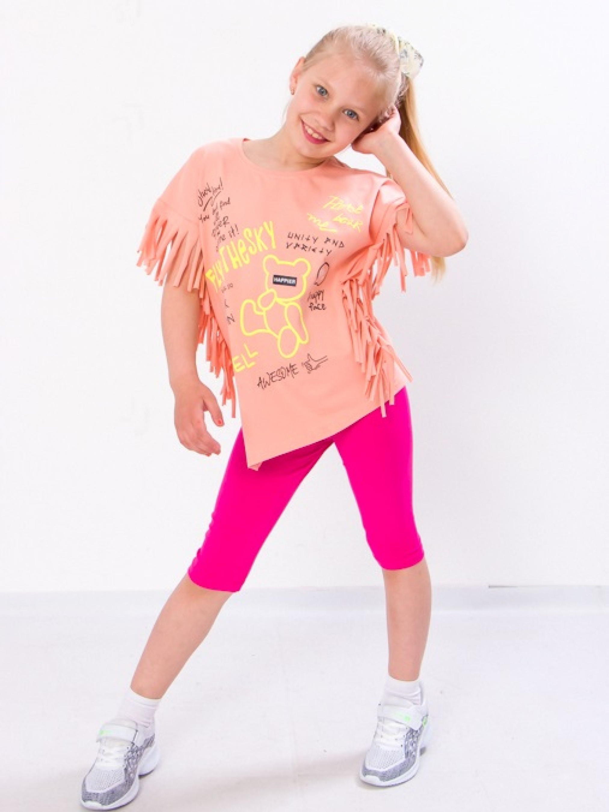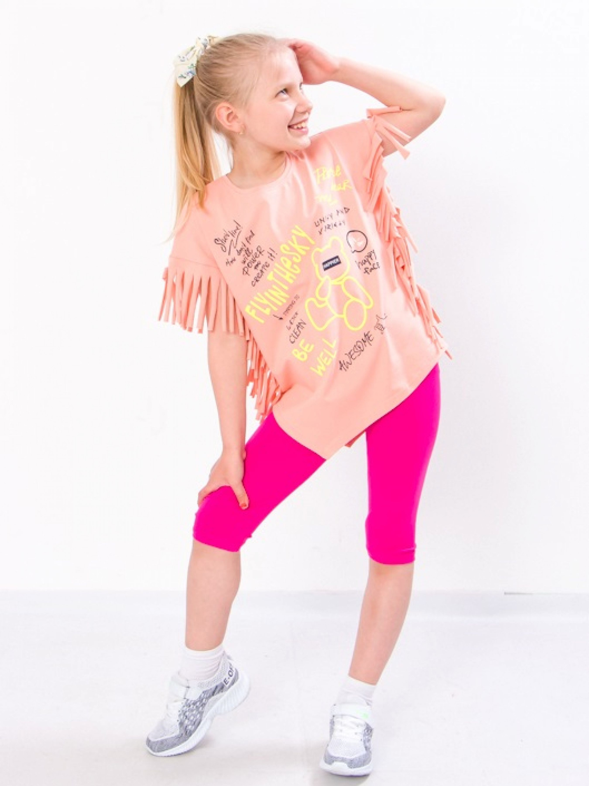 Полотно: фулікра однотонна Склад полотна: 95% бавовни 5% лайкри Зріст: 98-134 Комплект для дівчинки створений дизайнерами українського бренду Носи Своє для красивих і стильних маленьких принцес. Це практичне рішення для розваг на свіжому повітрі походу в дитячий сад або вечірніх прогулянок на березі моря. У набір входять футболка-туніка і треси. Футболка підкорить навіть найвимогливіших маленьких модниць оскільки вона декорована оригінальним і барвистим принтом і рукавами-бахрома. Завдяки застосуванню еластичних полотен для пошиття модель не сковує рухів дитини тому навіть під час активних ігор або бігу дитині буде комфортно. Треси щільно облягають і фіксуються на талії за допомогою еластичної резинки але при цьому не тиснуть і не провокують дискомфортних відчуттів. Комплект зшитий з м'якого легкого і приємного на дотик бавовняного полотна з невеликим додаванням еластану. Комбінація натуральних і синтетичних волокон визначає експлуатаційні характеристики. Тканина ніжно торкається шкіри пропускає повітря відводить вологу не провокує алергічні реакції а також відрізняється міцністю еластичністю і зносостійкістю не втрачаючи насиченість відтінків і початкову форму навіть після численних пранів. Догляд: прати при температурі 30-40 °. Для кольорового - краще підібрати делікатний миючий засіб рідкий пральний порошок для кольорових речей. Сушити костюм краще в природних умовах без прямого попадання прямих сонячних променів. Весь одяг вироблений фабрикою строго відповідає розмірній сітці. На бірочці вказано орієнтовний ріст дитини а в таблиці - реальні виміри які зробили наші менеджери. Приємних Вам покупок!