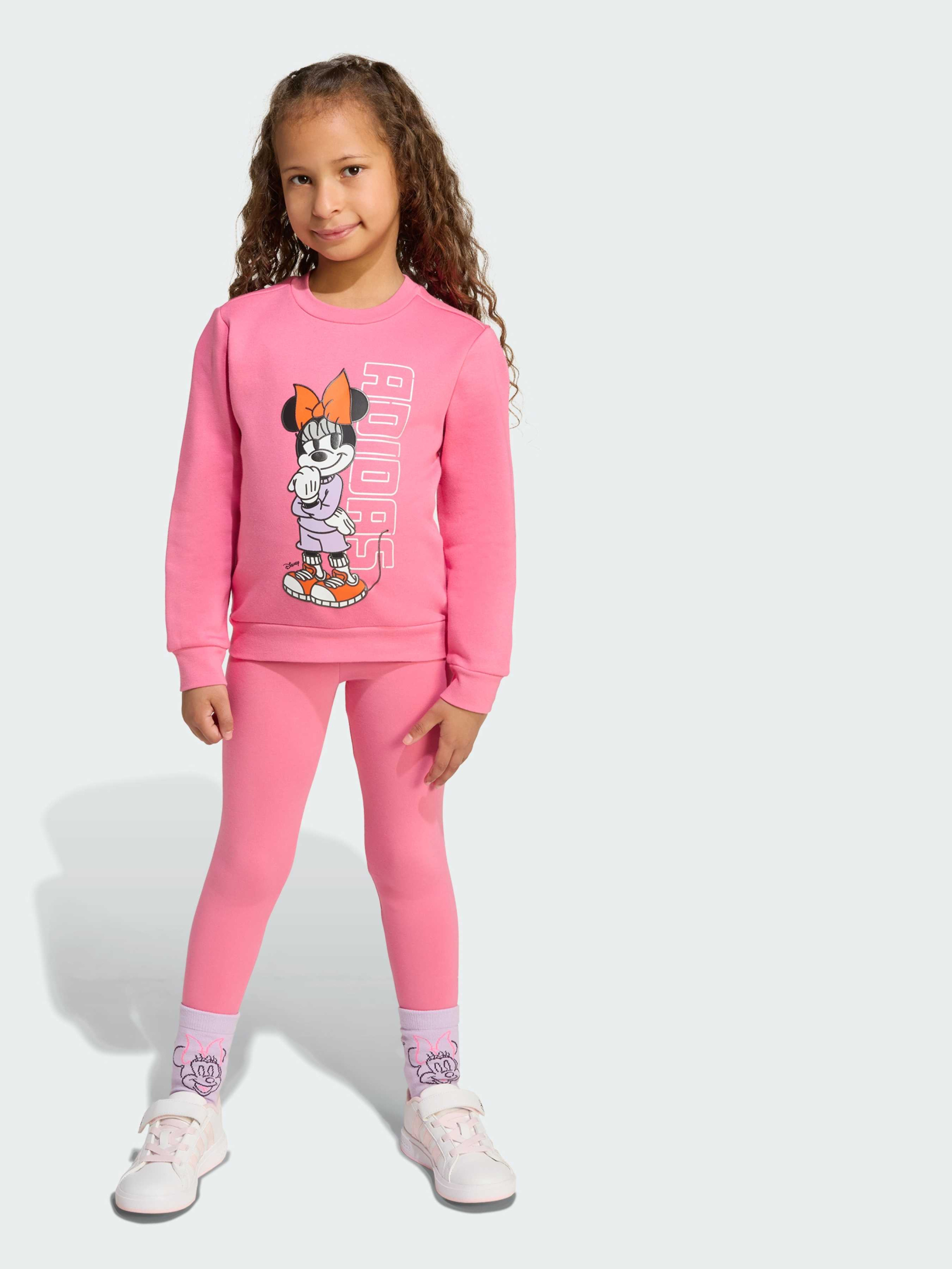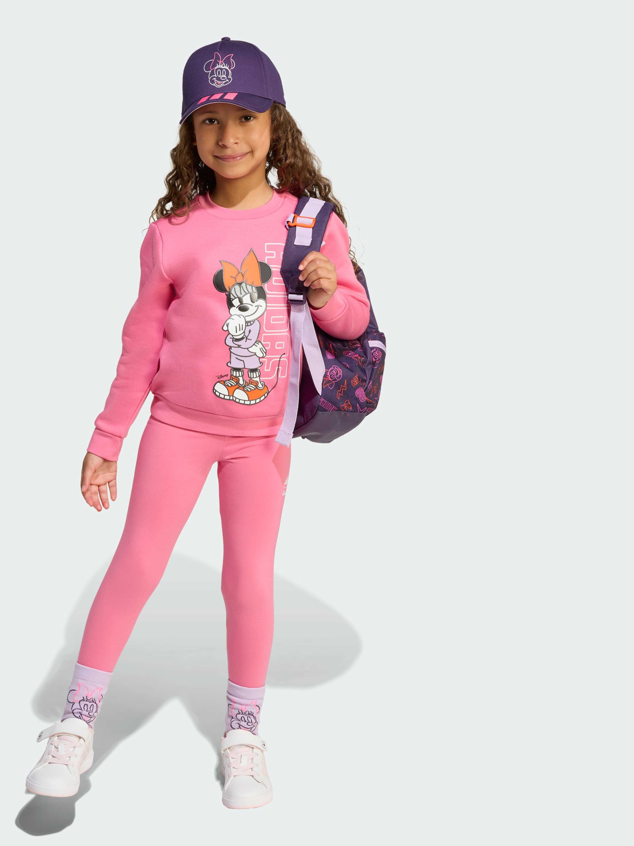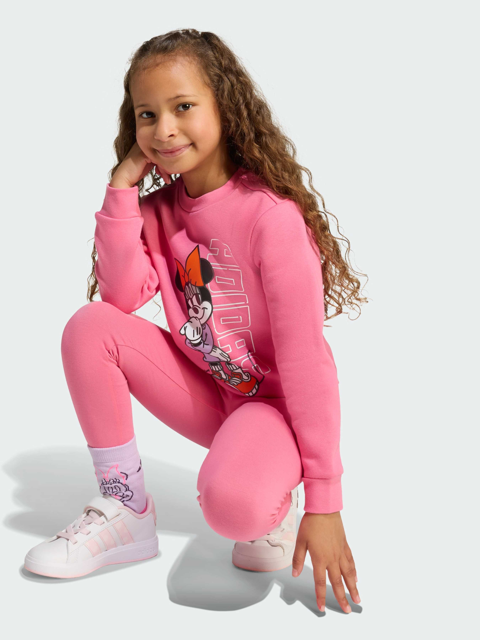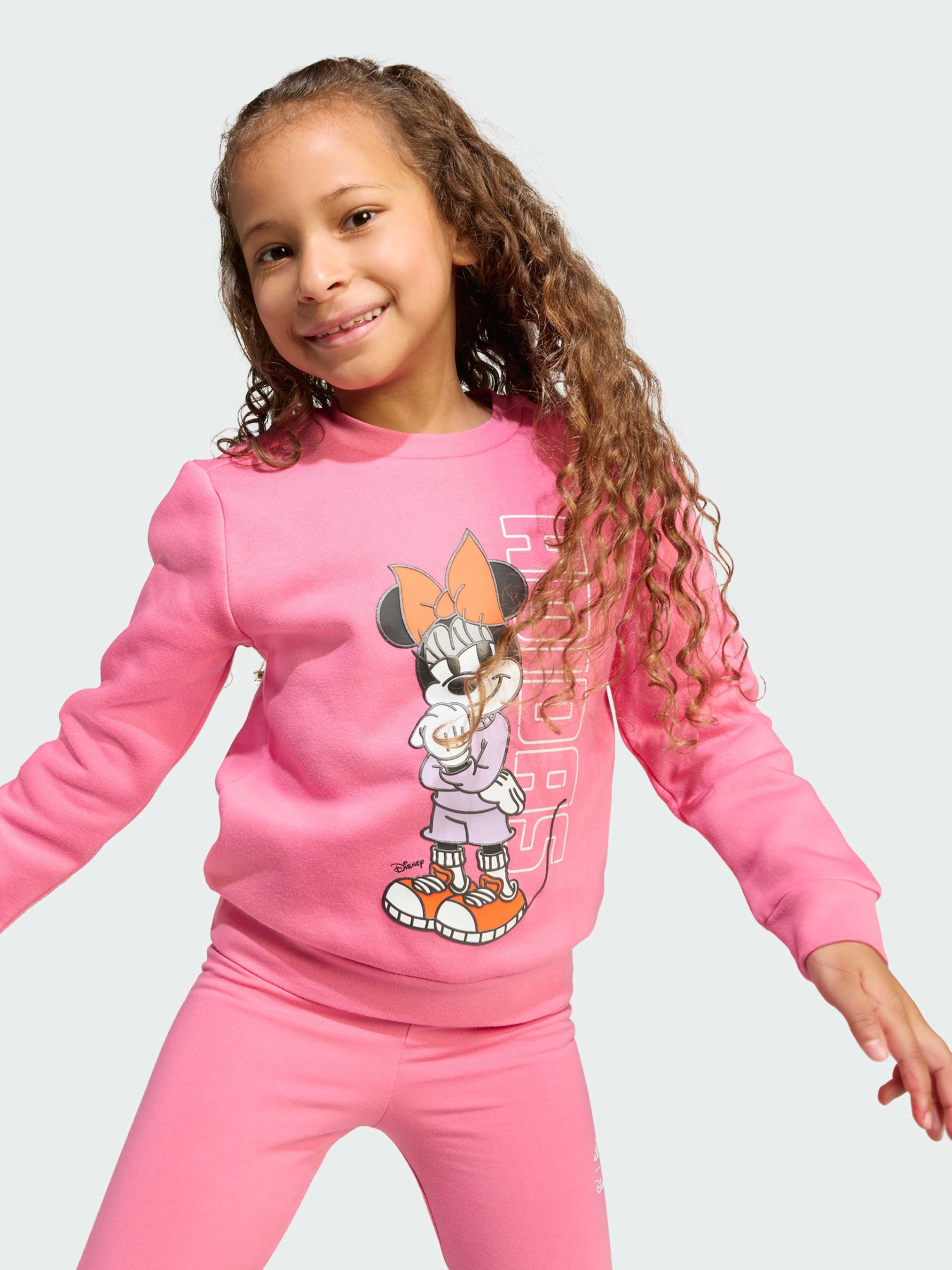 Характеристики 55% бавовна, 36% перероблений поліестер, 9% віскоза Круглий виріз горловини Прямий верх, облягаючий низ Опис Додай чарівності Disney в кожен день з дитячим комплектом джогерів adidas з Мінні Маус. М'яка і еластична тканина ідеально підходить для активних ігор, бігу, стрибків і танців, а яскравий принт робить образ веселим і стильним. Ідеальний вибір для маленьких шанувальників Disney, які люблять рух і пригоди.