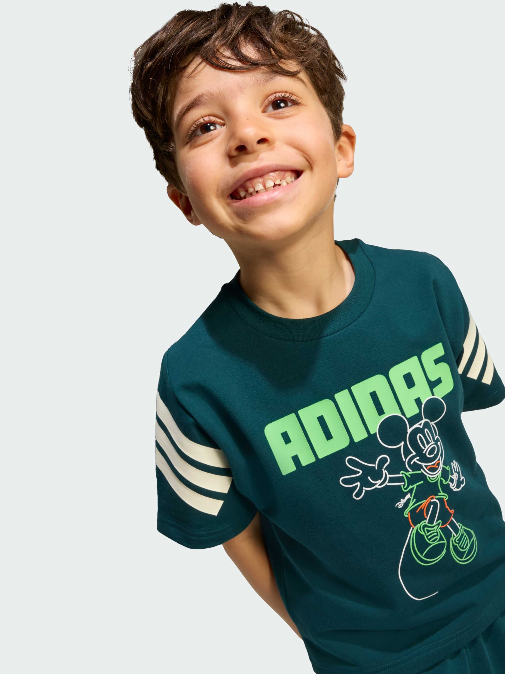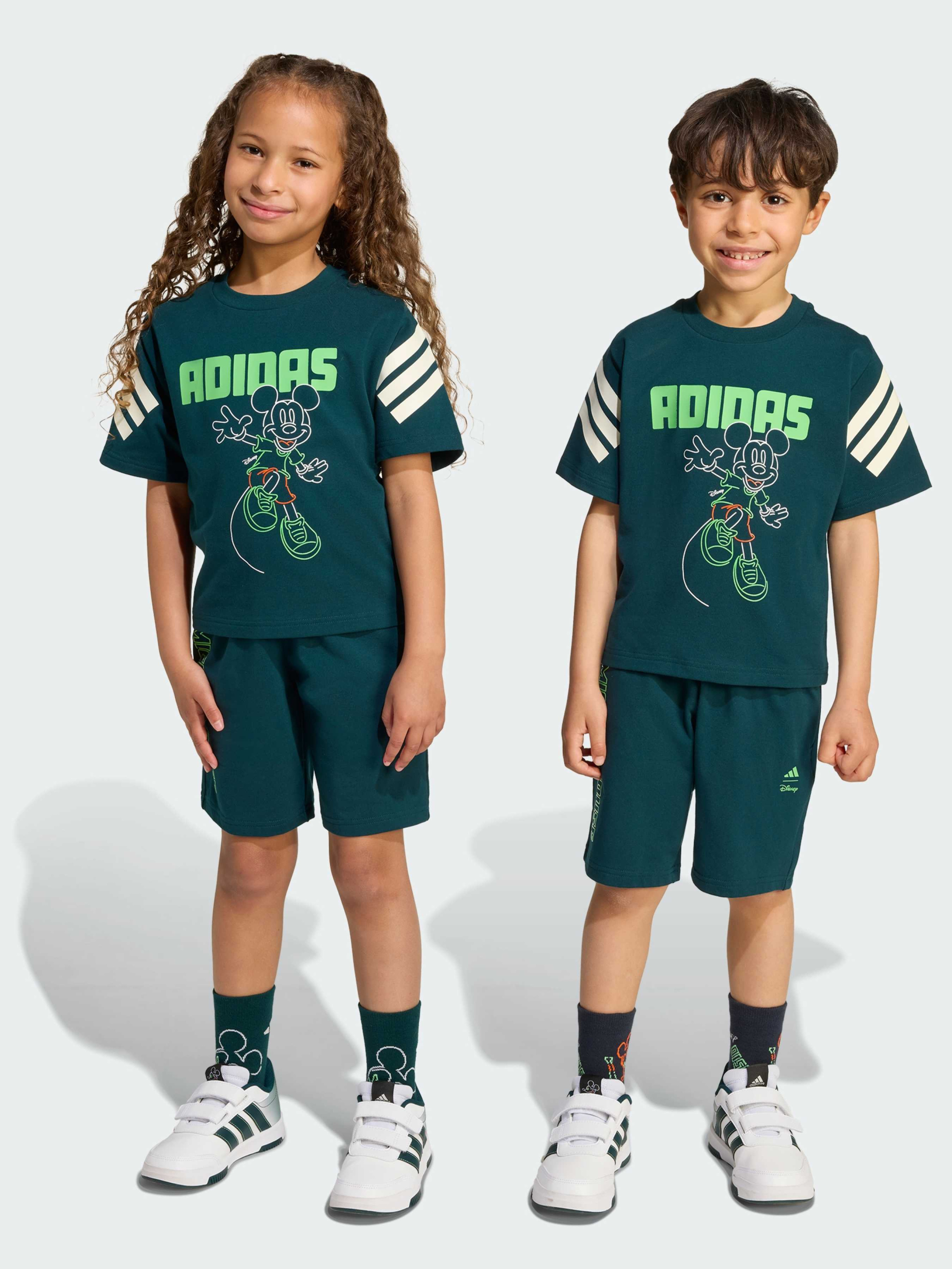 Характеристики 93% бавовна, 7% еластан Круглий виріз горловини Стандартний крій Опис adidas і Disney об'єдналися, щоб створити ідеальний комплект для активних дітей. До нього входять футболка з круглим вирізом з м'якої, еластичної бавовняної тканини і шорти з комфортною еластичною талією. Яскравий графічний малюнок з Міккі Маусом, в поєднанні з яскравими літерами і культовими трьома смужками adidas, надають комплекту стиль і індивідуальність. Відмінний вибір для гри на свіжому повітрі або повсякденних прогулянок - твоя дитина буде в захваті.