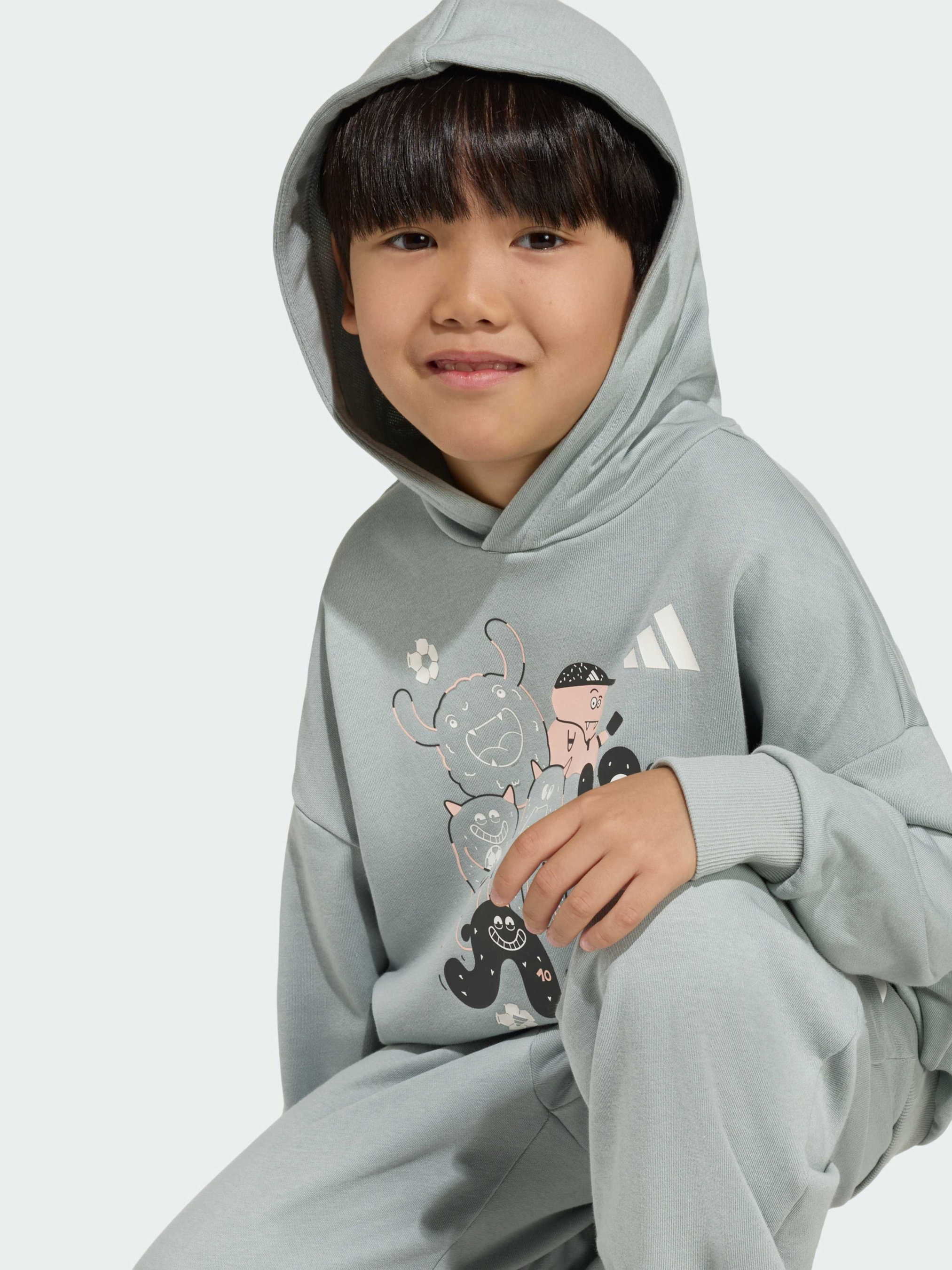 Характеристики Крій оверсайз Принт футбольного монстра Френч-террі: 70% бавовна, 30% поліестер Наклейка із зображенням монстра Опис Комплект TIRO_NSTER заряджає грою та фантазією. Натхненний атмосферою чемпіонату світу з футболу 2026 року, він поєднує спортивну енергію та веселих монстрів - воротаря, нападника, захисника та тренера, які разом символізують командний дух. М'який френч террі дарує комфорт щодня, а вільний крій забезпечує легкість рухів - для ігор, прогулянок і тренувань. Фірмовий логотип adidas на грудях і штанині підкреслює оригінальність, а яскраві принти і колекційний стікер додають настрою. Цей комплект створений для активних дітей, які грають, рухаються і перемагають з adidas.