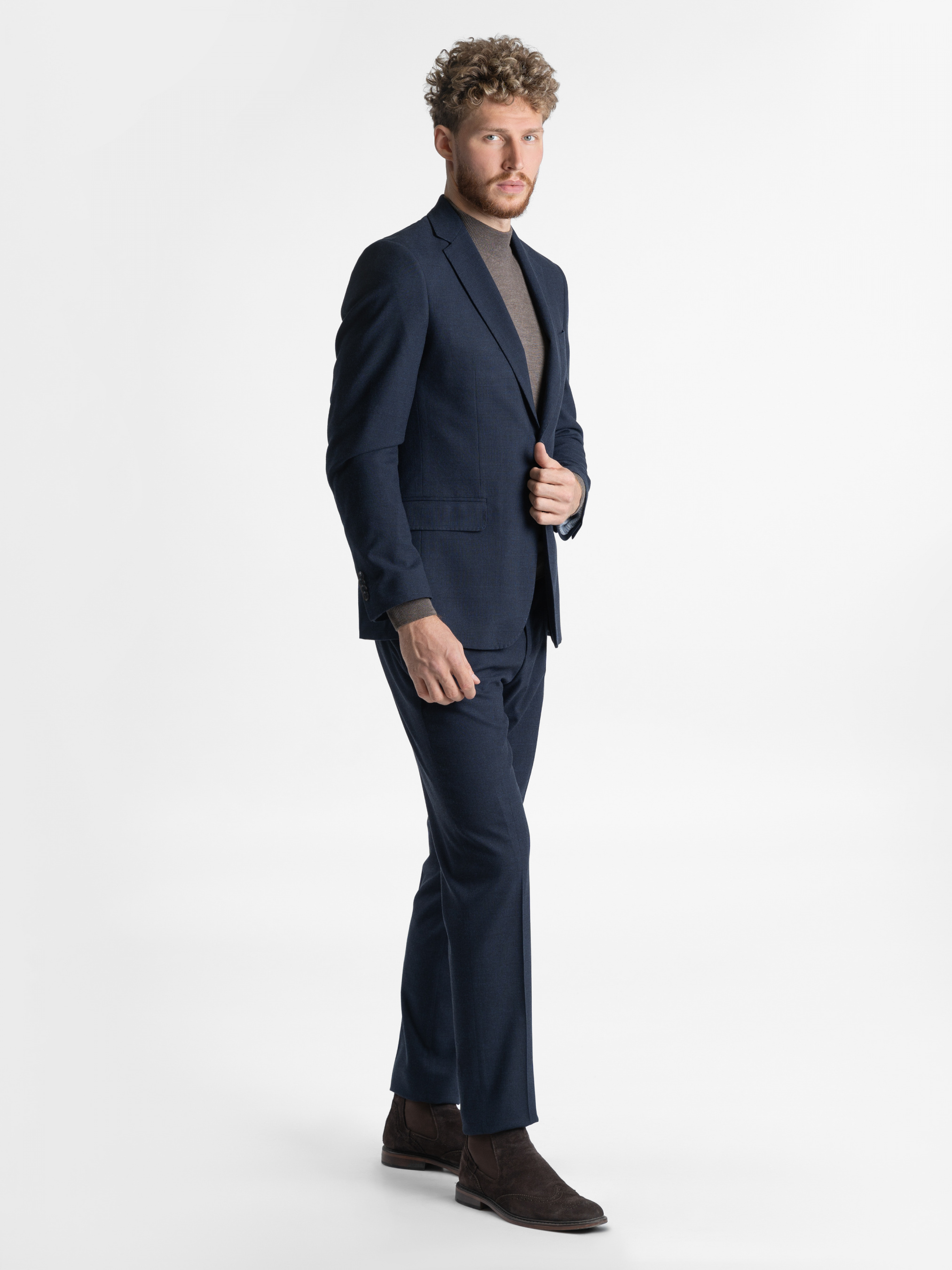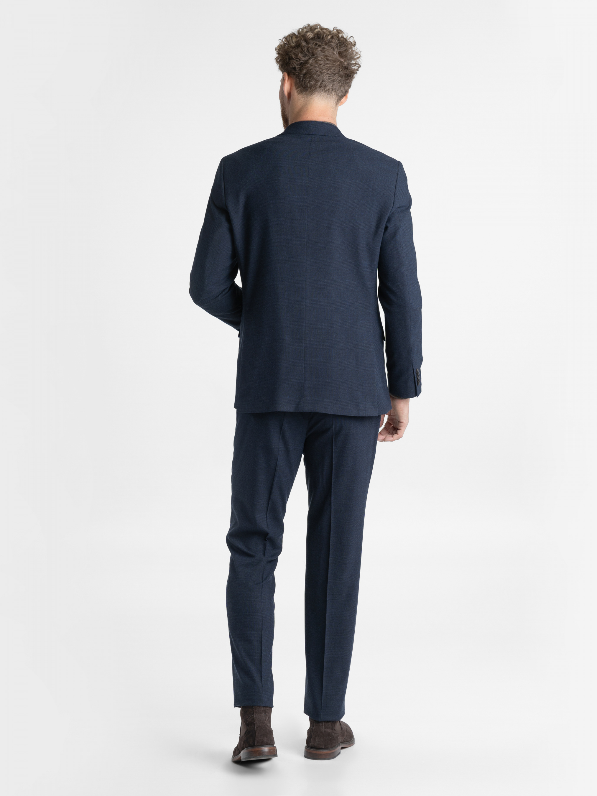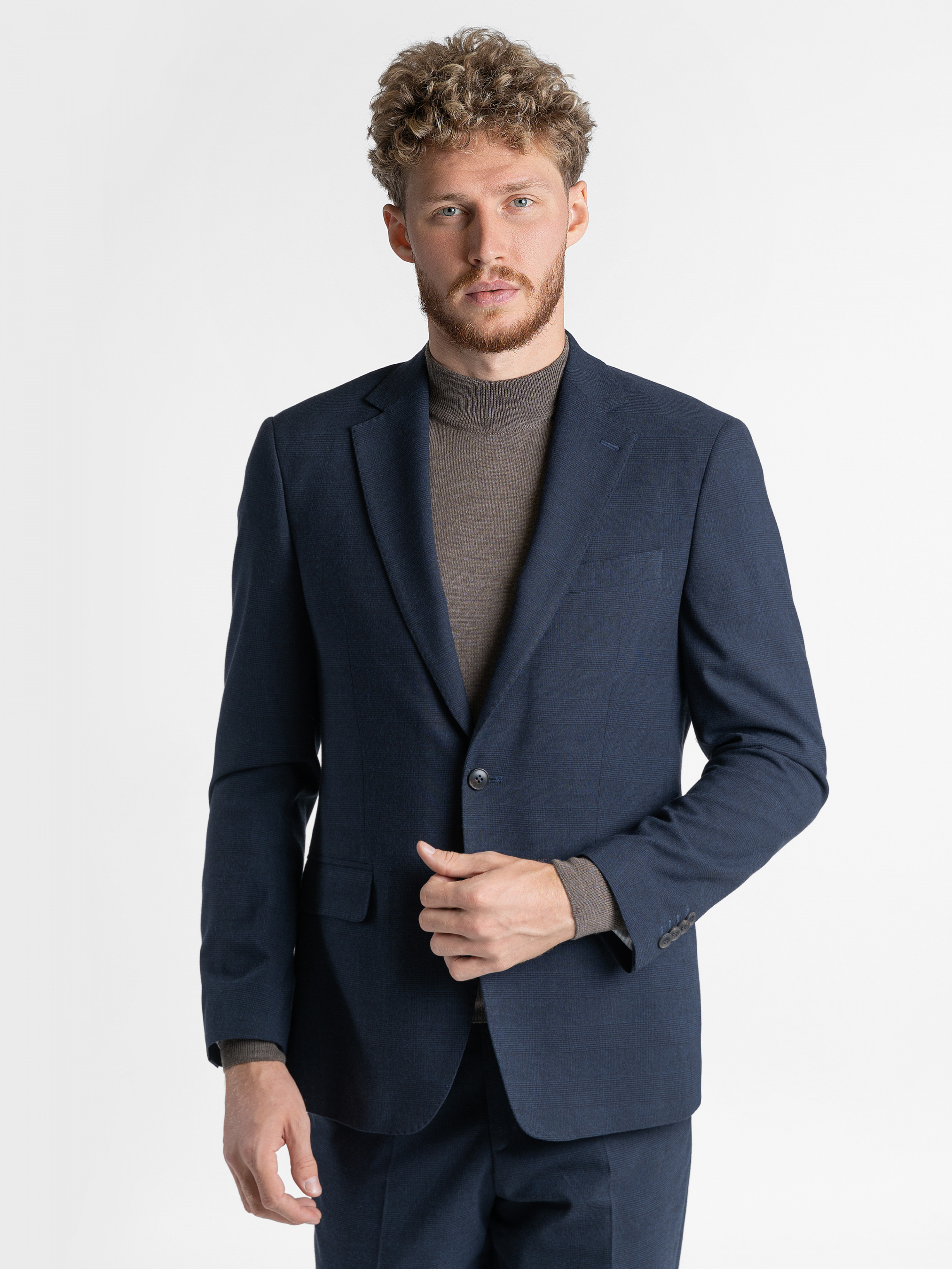 Темно-синій костюм Arber, створений з темно-синьої тканини в клітину, інноваційна тканина з додаванням еластану, робить його комфортним та стійким до зносу. Модель піджака прилеглого силуету, однобортний на 2 ґудзики, з двома кишенями з клапаном та двома шліцами. Штани середньої посадки, завужені до низу. Цей костюм стане незамінним у ситуації, коли треба мати бездоганний вигляд. Такий костюм прекрасно підходить для робочих буднів та офіційних зустрічей. Можна доповнити комплект жилетом з такої ж тканини, M20.09.09.233,отримавши модний та елегантний костюм-трійку.