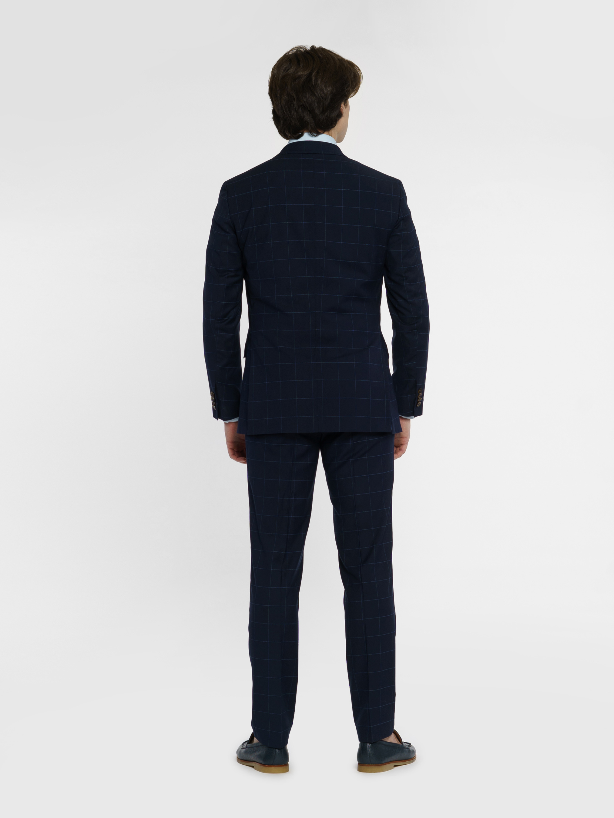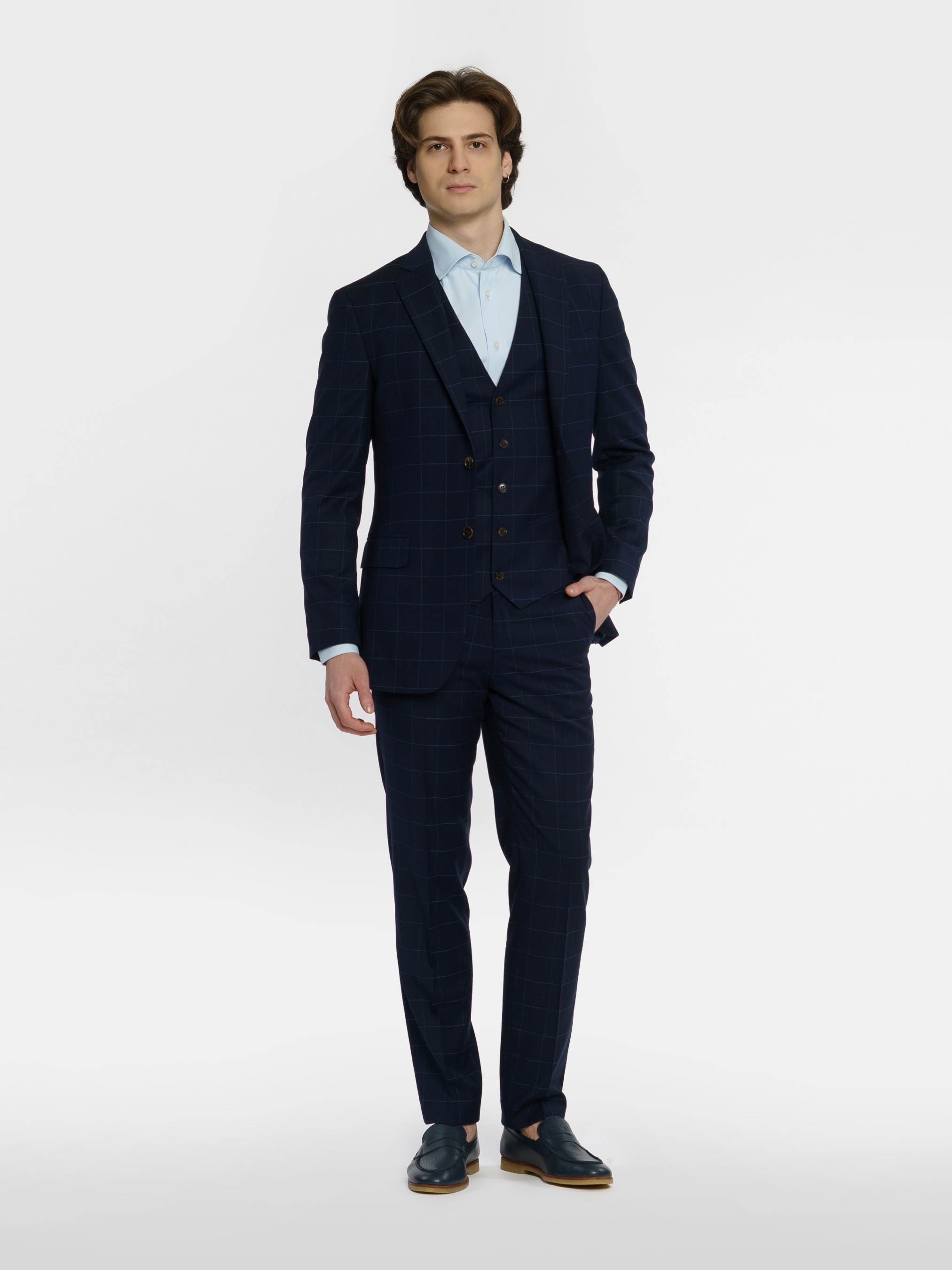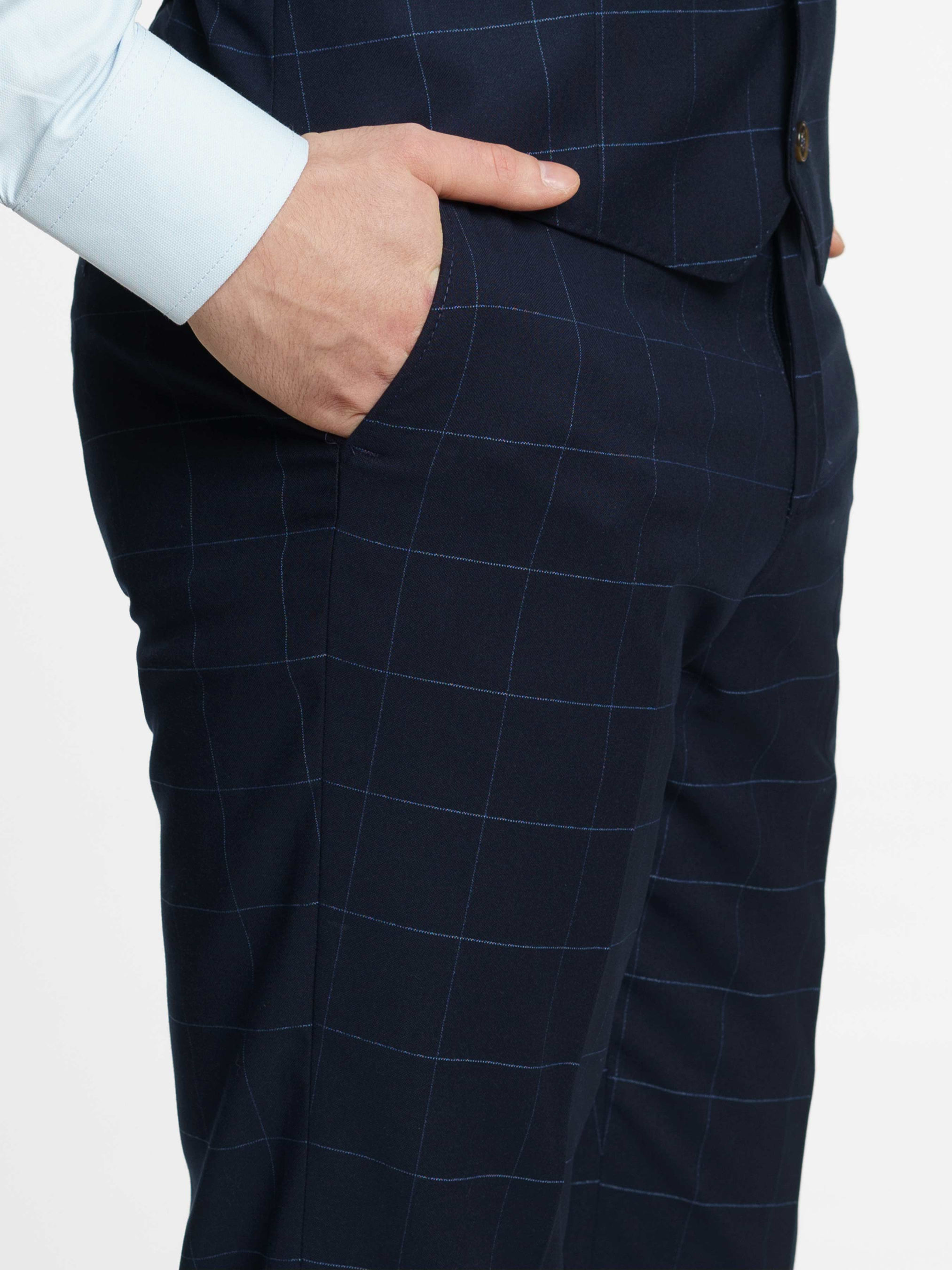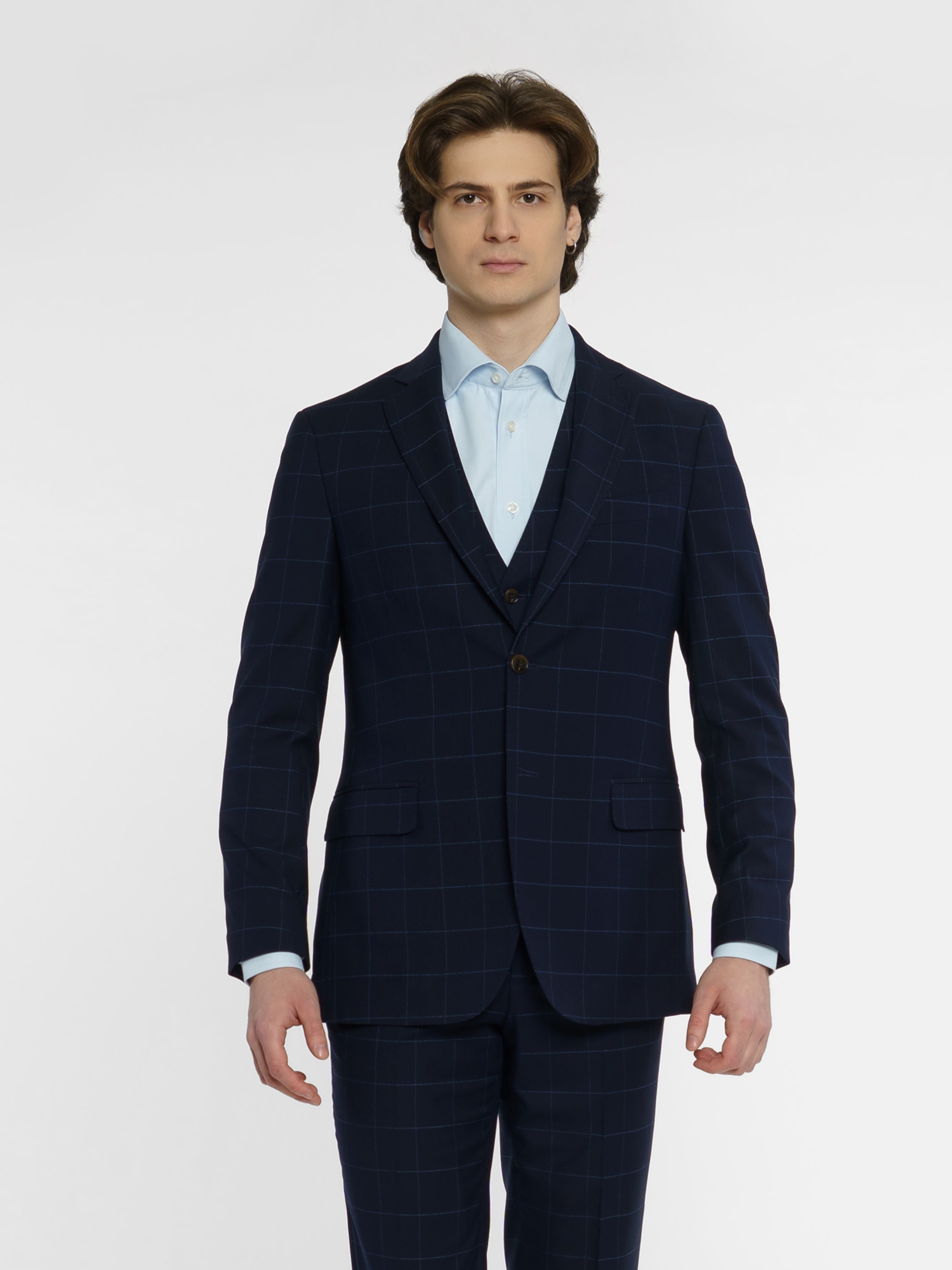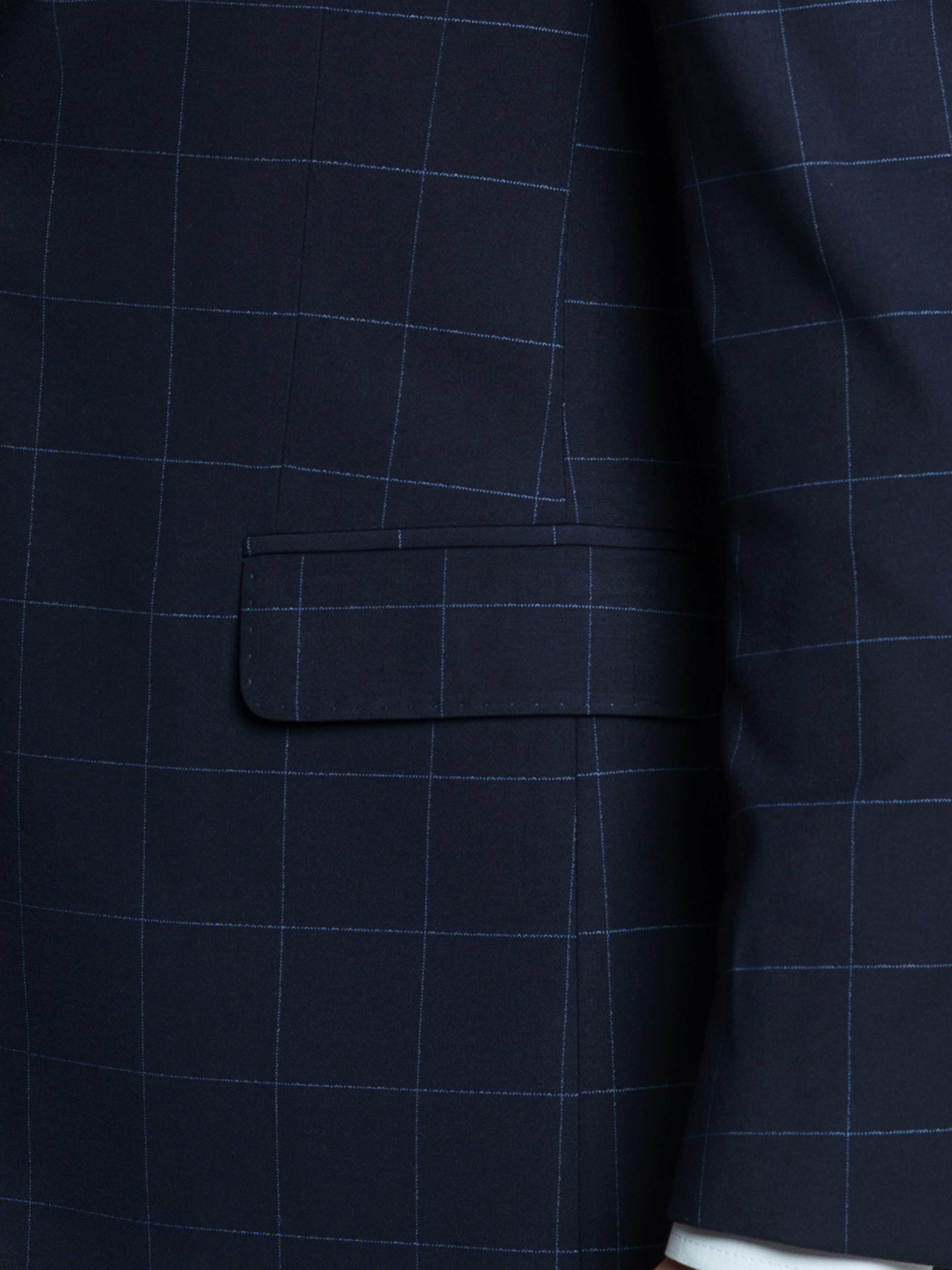 Чоловічий синій костюм Arber в клітину, напівприлеглого силуету, ідеально сідає по фігурі. Піджак однобортний, із застібкою на два гудзики, з двома кишенями із клапаном та двома шліцами, легкий та комфортний, з плавним плечем. Костюмні брюки з середньою посадкою, завужені до низу. Інноваційна тканина в клітину з додаванням еластану, робить його комфортним та стійким до зносу. Цей костюм буде відмінним варіантом для офіційних зустрічей та свят. Можна доповнити комплект жилетом з такої самої тканини, M20.01.09.411,отримавши модний та елегантний костюм-трійку.