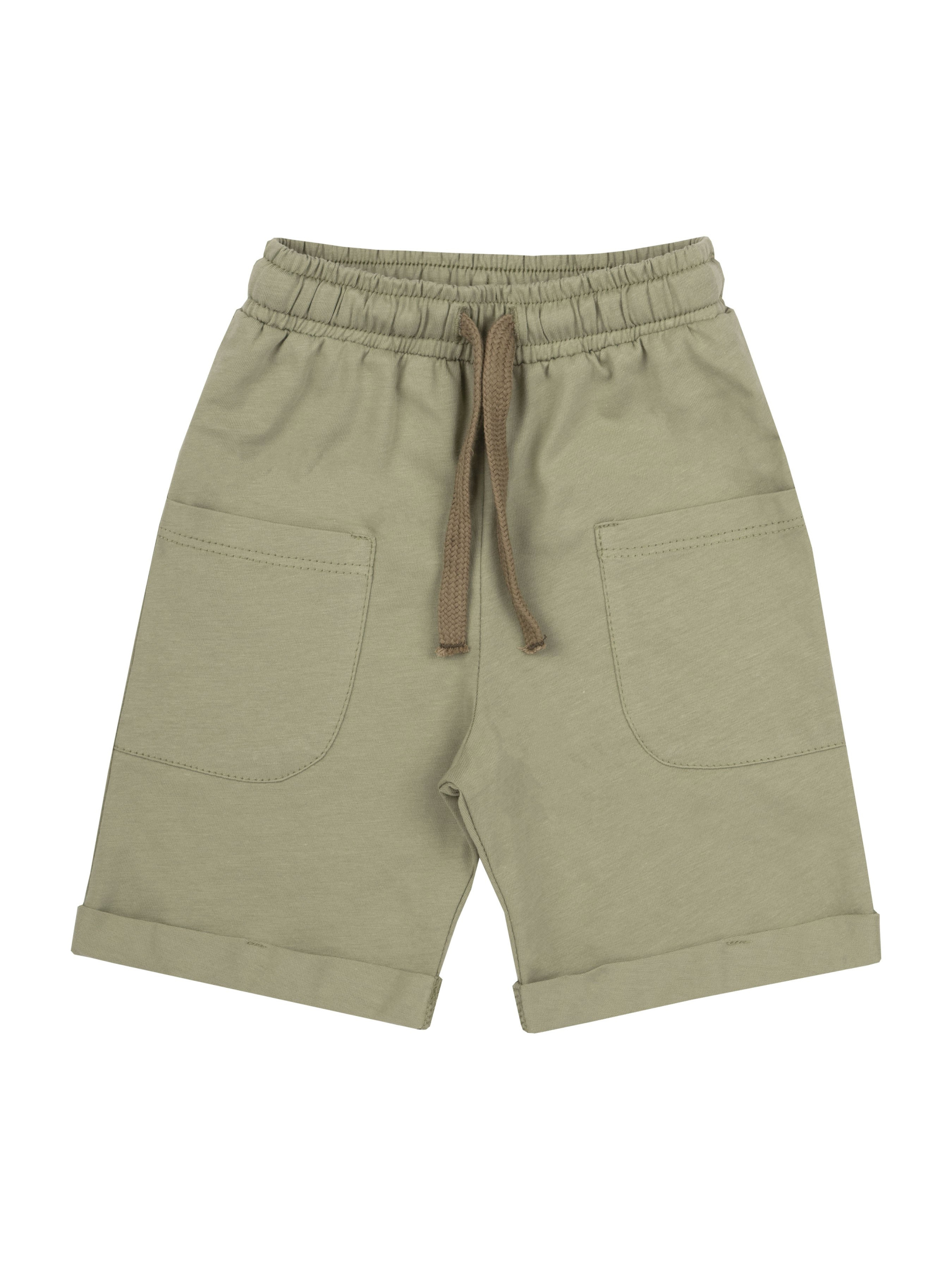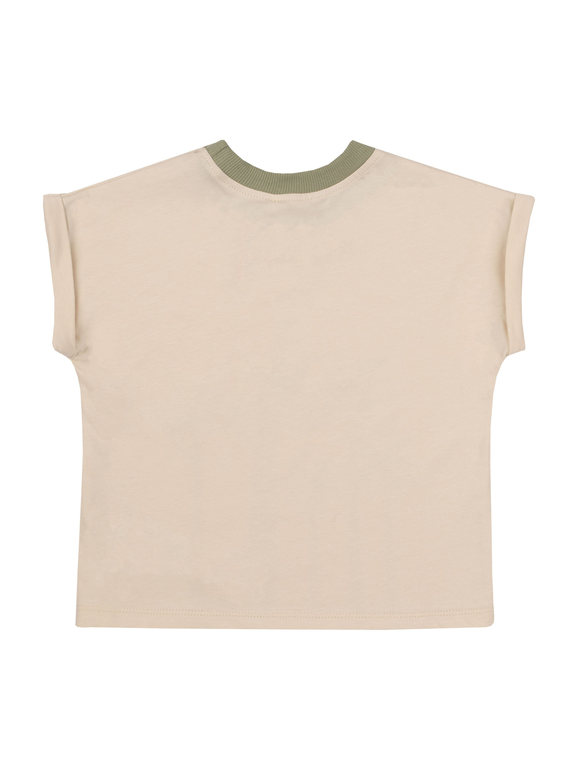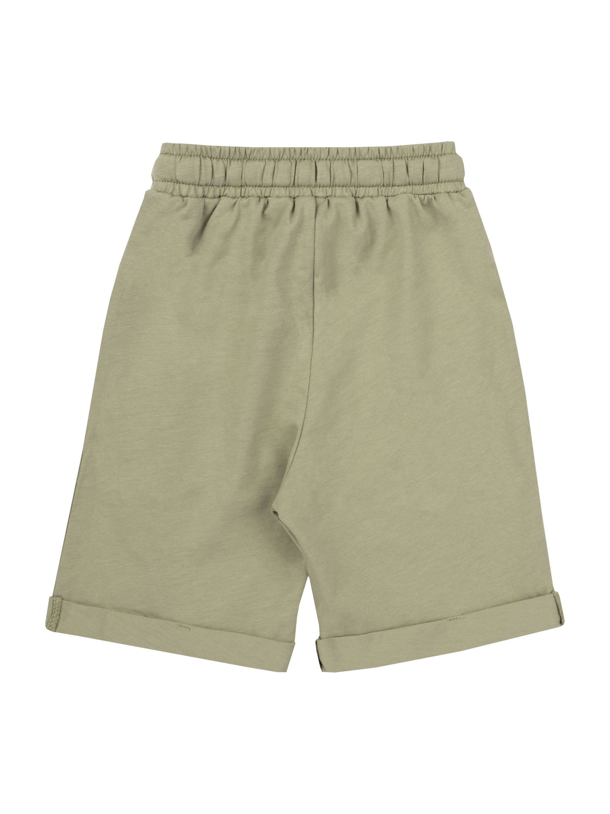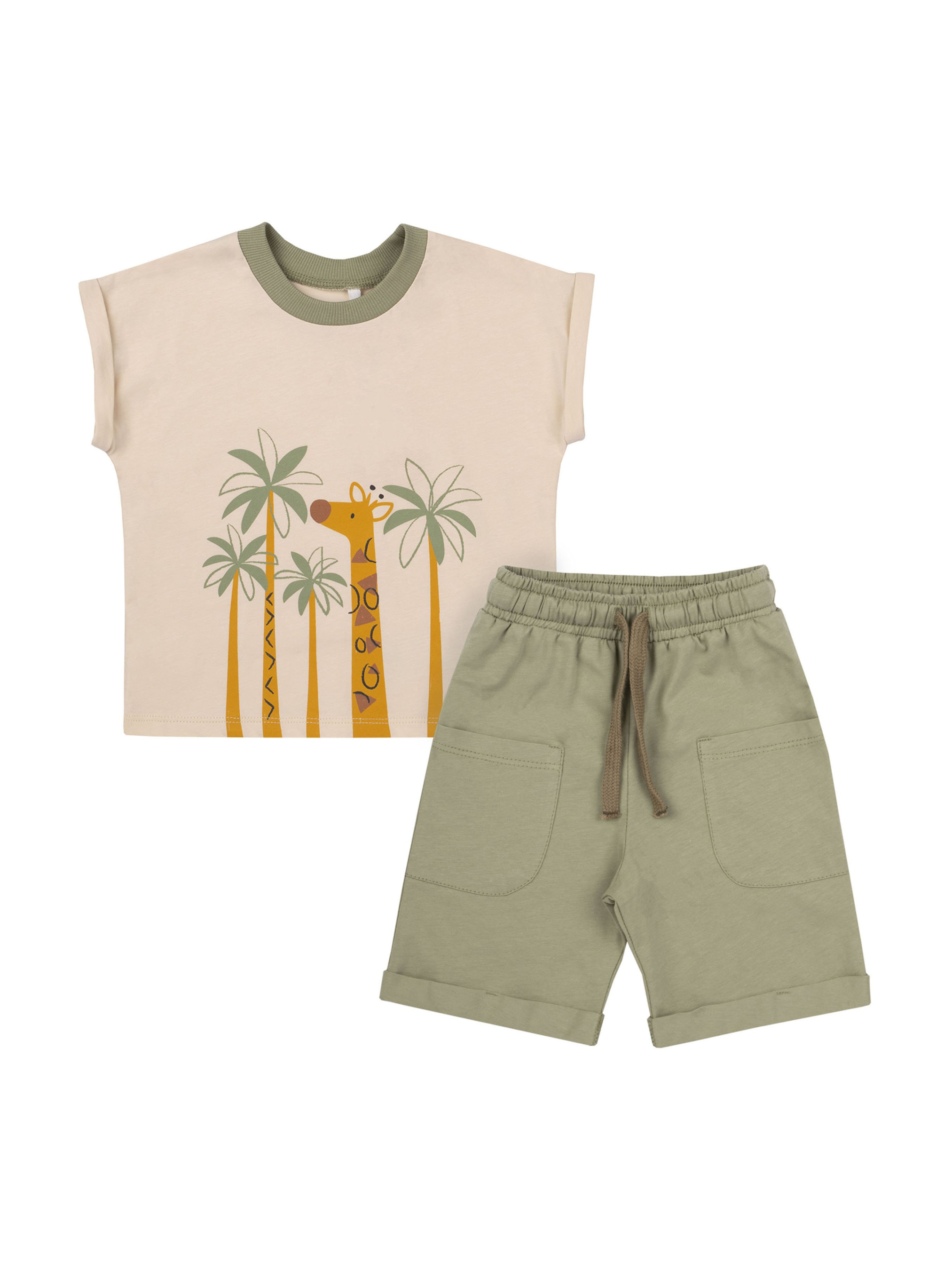 Костюм прямого силуету: футболка та шорти. Перед футболки оздоблений друком. Горловина оброблена коміром. Рукав суцільнокроений, короткий, з манжетом. Довжина шортів - до колін, верхній зріз - на пришивному поясі з резинкою та шнуром всередині. Передні половинки з боковими накладними кишенями та відворотами по низу. бавовна.