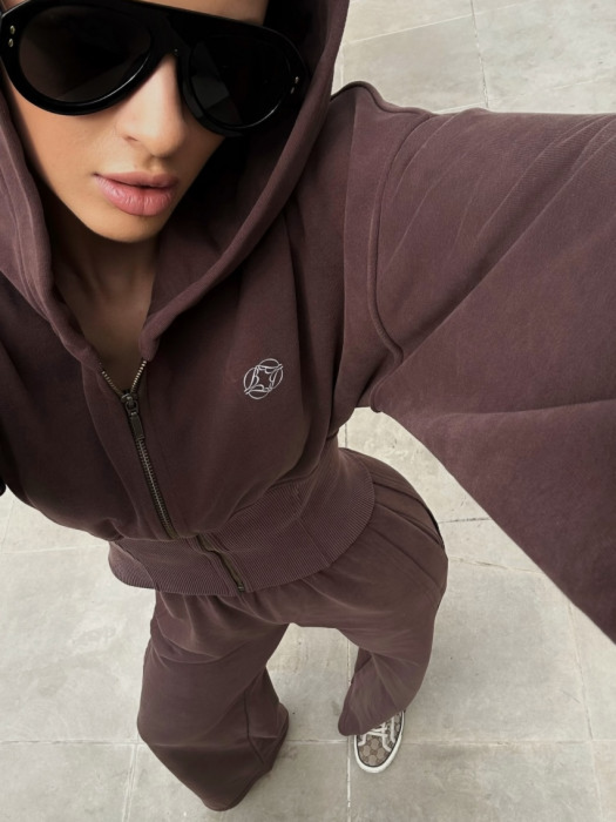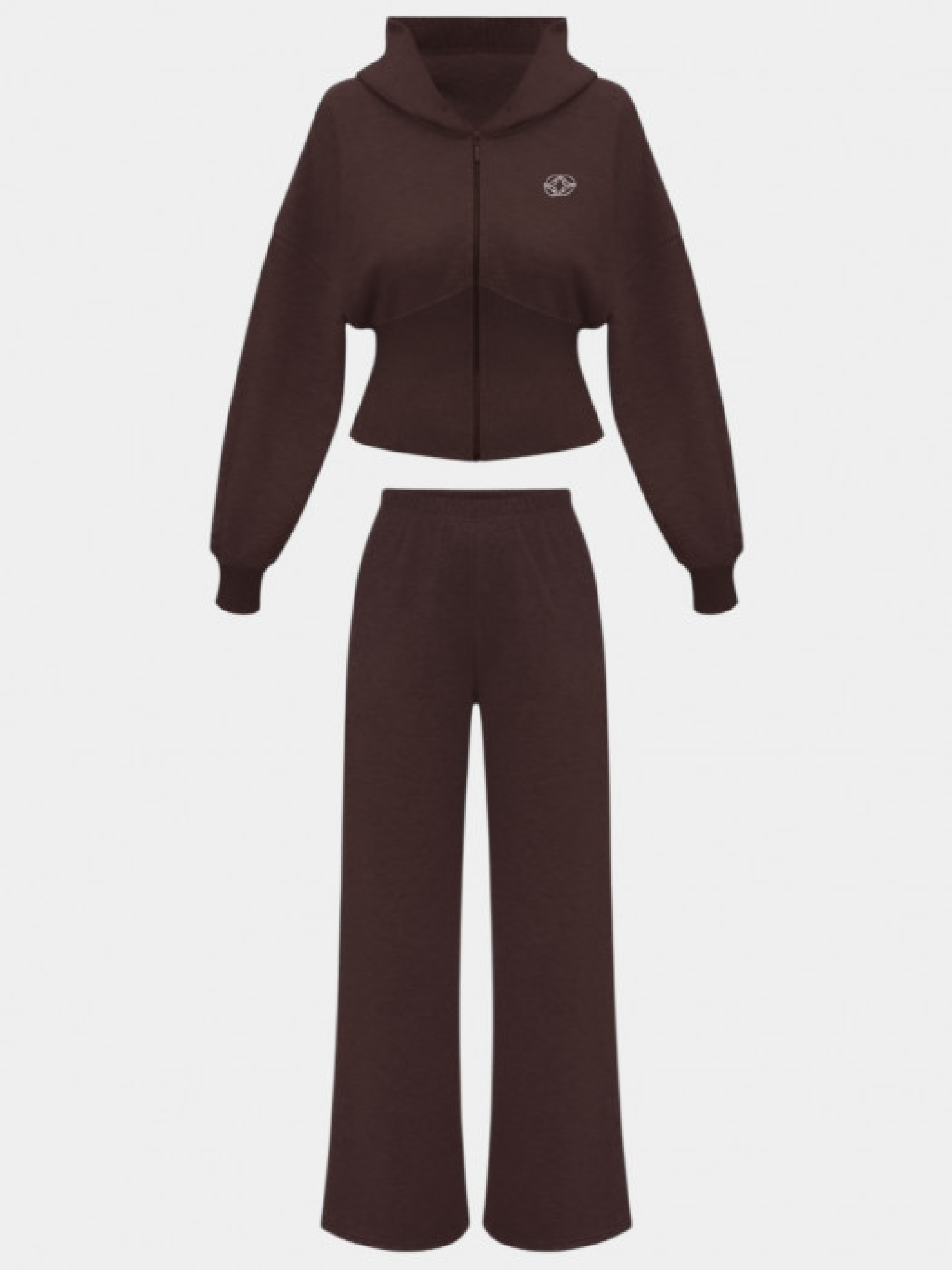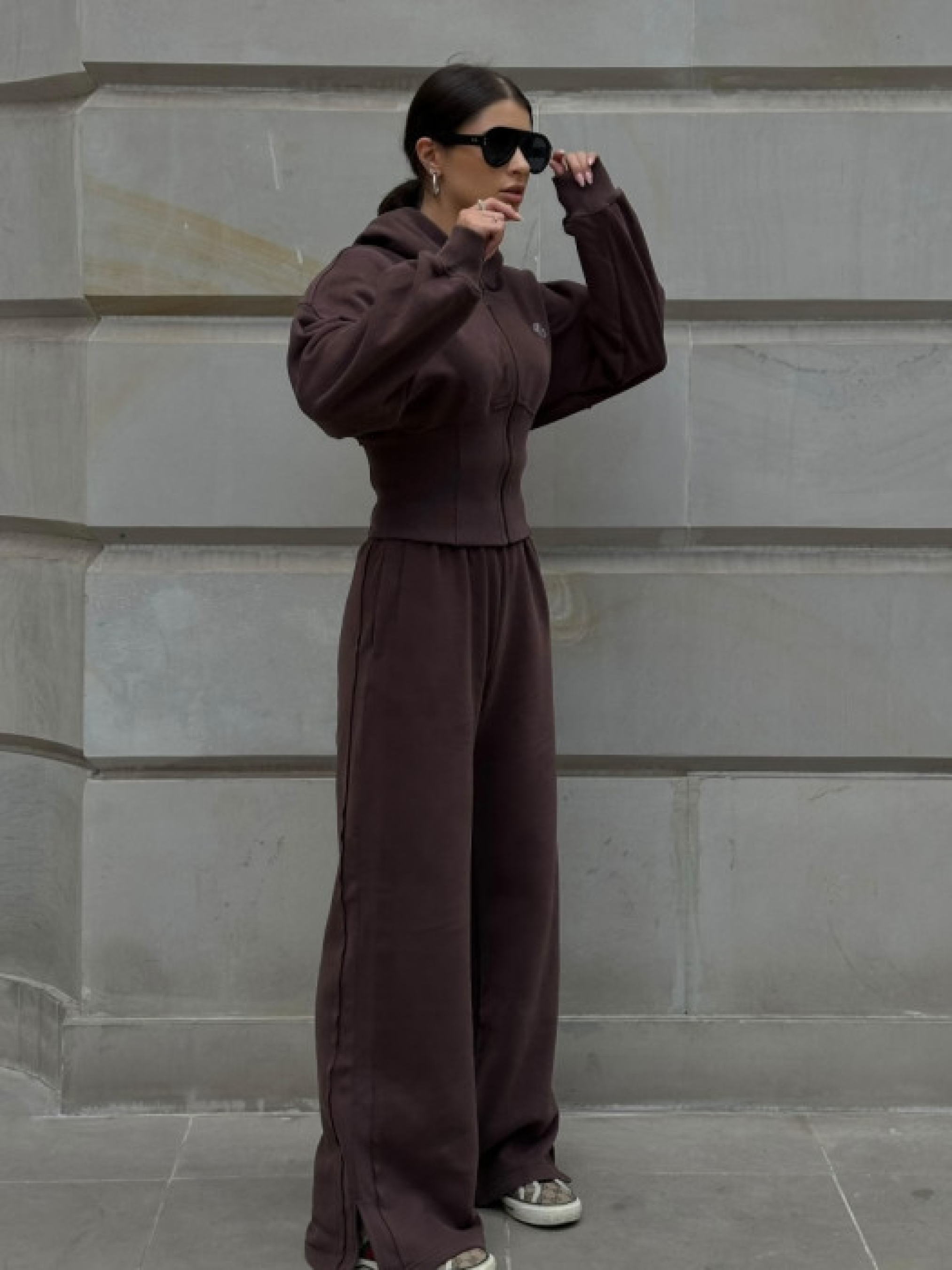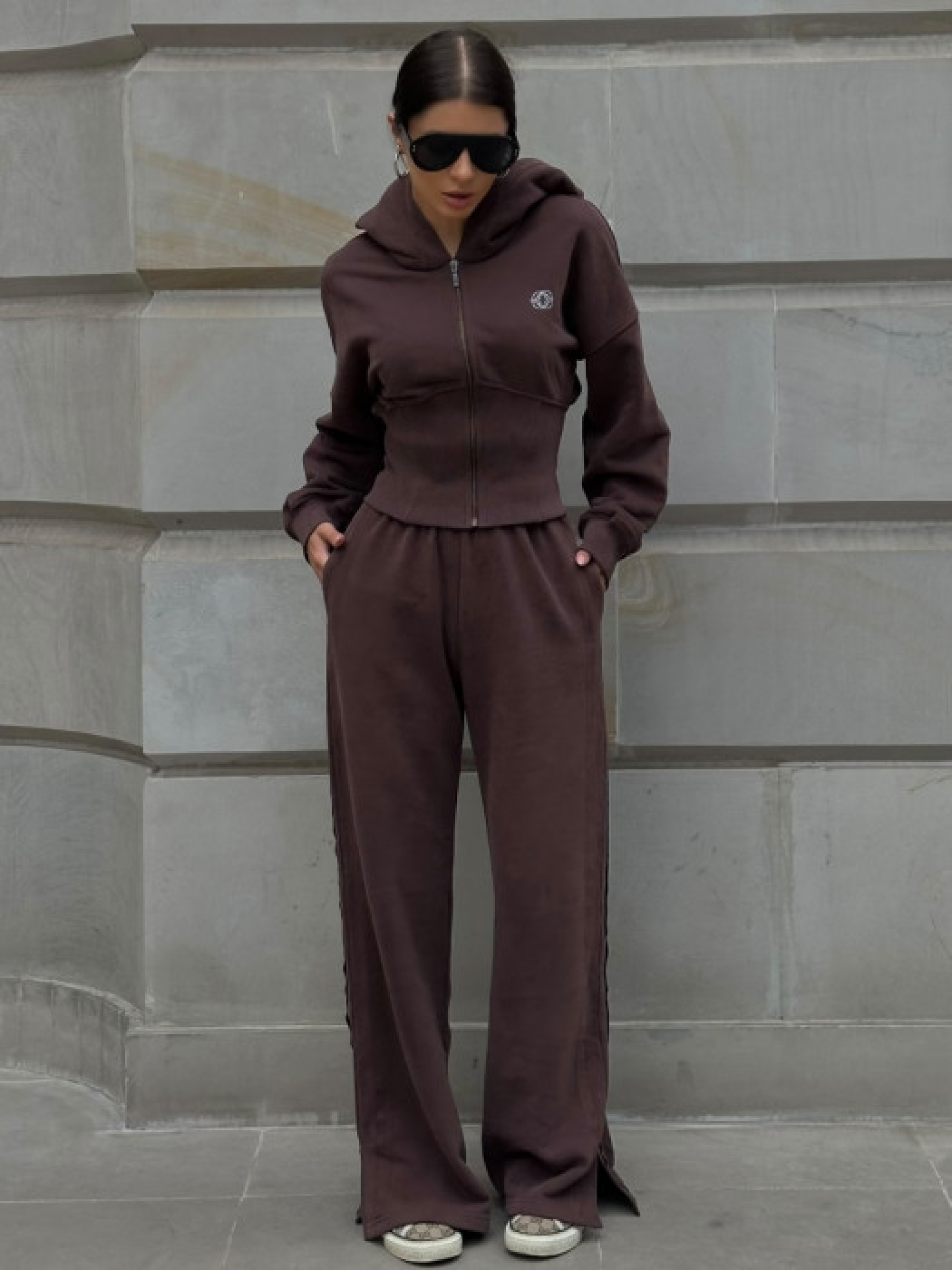Шоколадний спортивний костюм з трикотажу, що складається з худі та широких штанів. Худі має капюшон, застібку-блискавку спереду та приталений крій з рибчастими манжетами і поясом. Штани з високою талією, еластичним поясом та прямим широким кроєм. Виготовлений з м’якого бавовняного трикотажу з добавкою поліестеру. Матеріал приємний на дотик, дихаючий та зберігає тепло. Манжети на рукавах і штанинах забезпечують комфортну посадку.