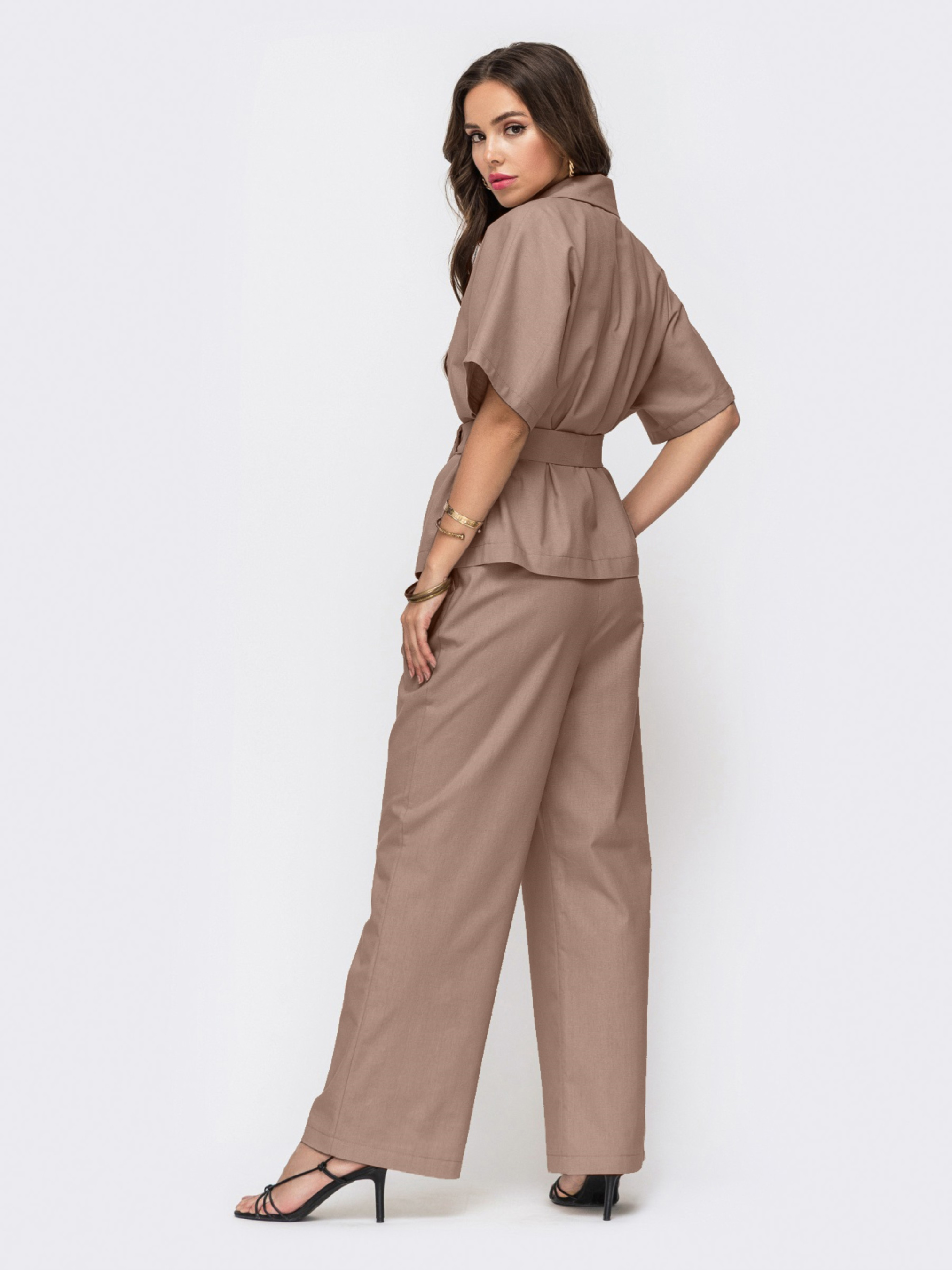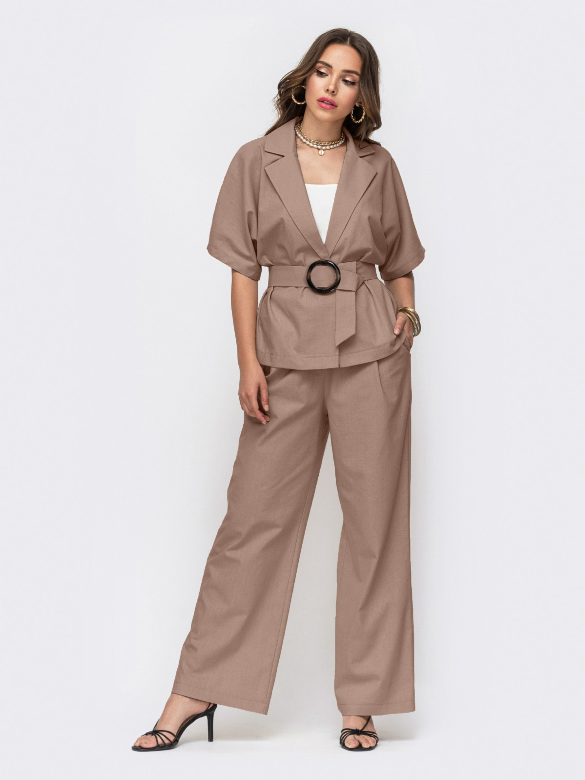 Пряжка на поясі може відрізнятися. Розкішний брючний костюм з лляної тканини. Жакет в стилі oversize з глибоким вирізом застібається на масивний ґудзик. Доповнює образ знімний пояс з пряжкою. Широкі штани-кльош з кишенями в бічних швах. Застібаються на блискавку і гудзик. З боків пояс призібраний на резинку.