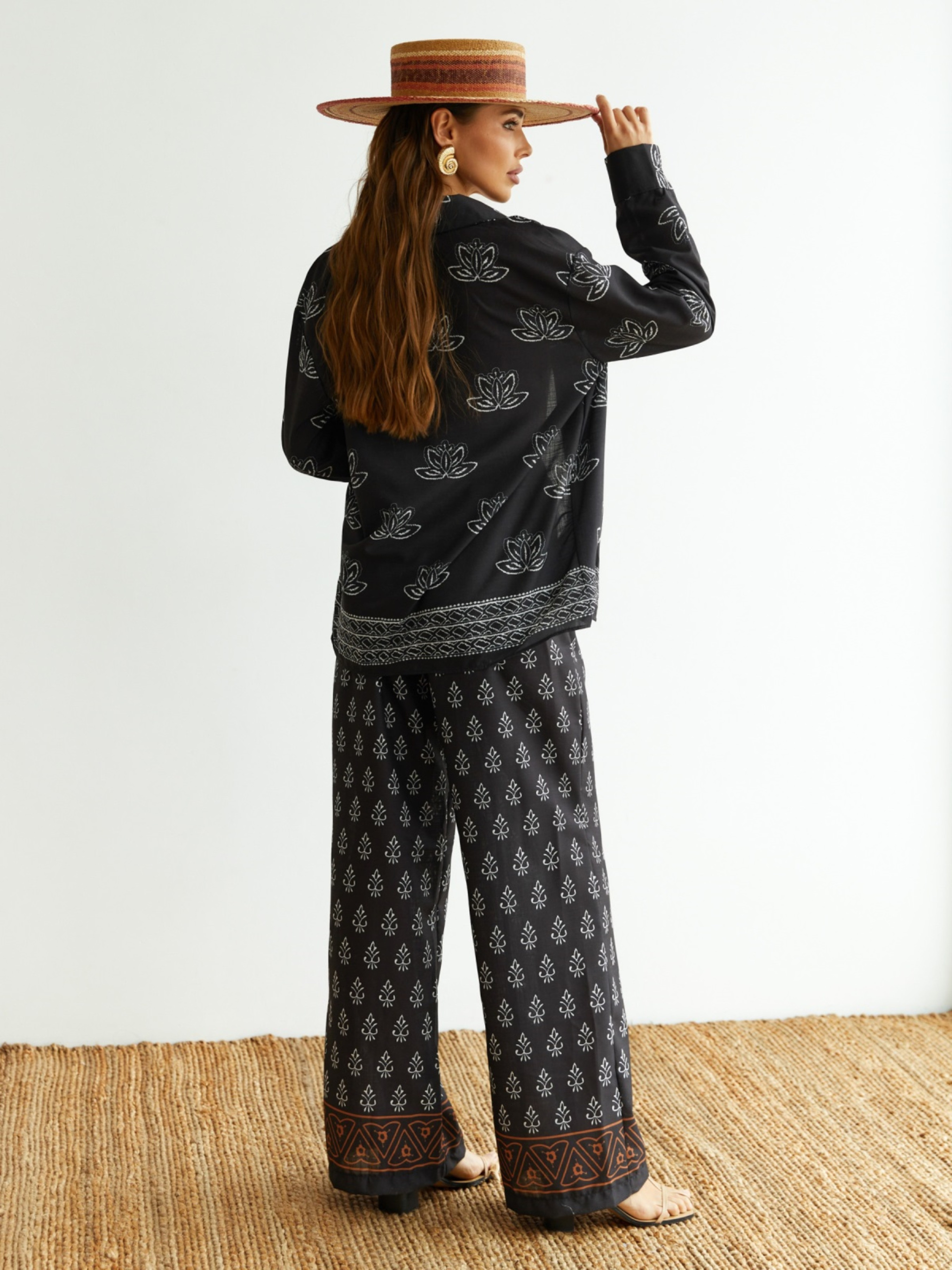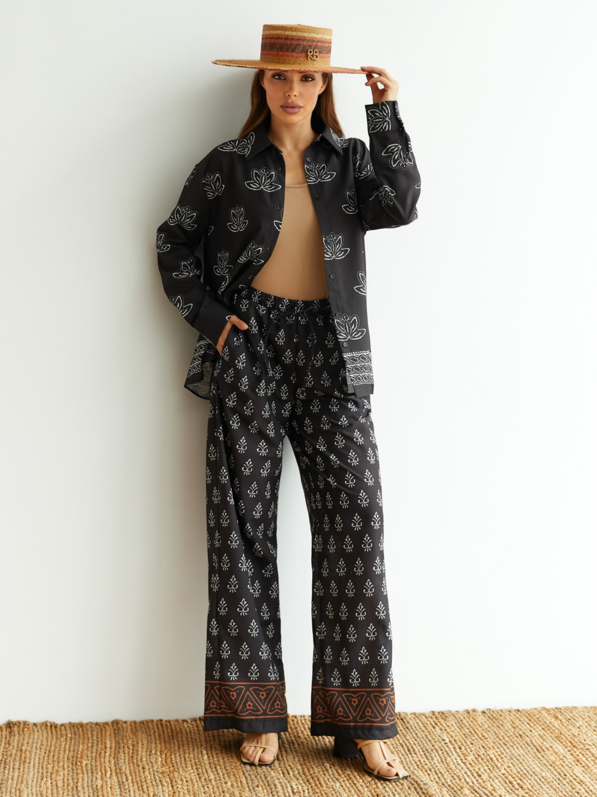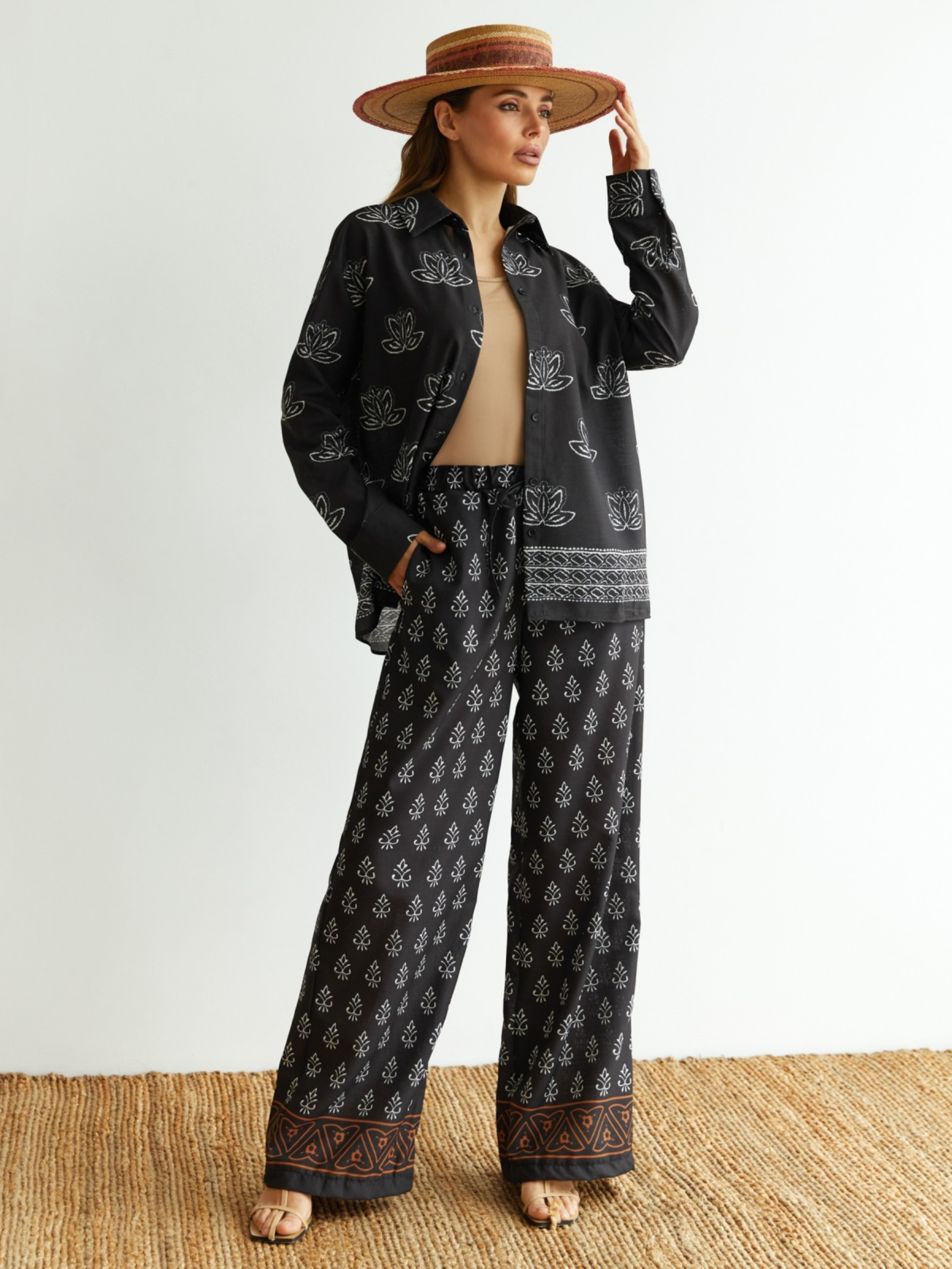 Принтований костюм-двійка з високоякісного турецького матеріалу. Сорочка подовженого крою. Модель із відкладним коміром, спущеною лінією плечового шва та манжетами на ґудзиках. Застібається на ґудзики. Штани вільного крою з талією на гумці для комфортної посадки по фігурі. Доповнені кишенями у бічних швах.