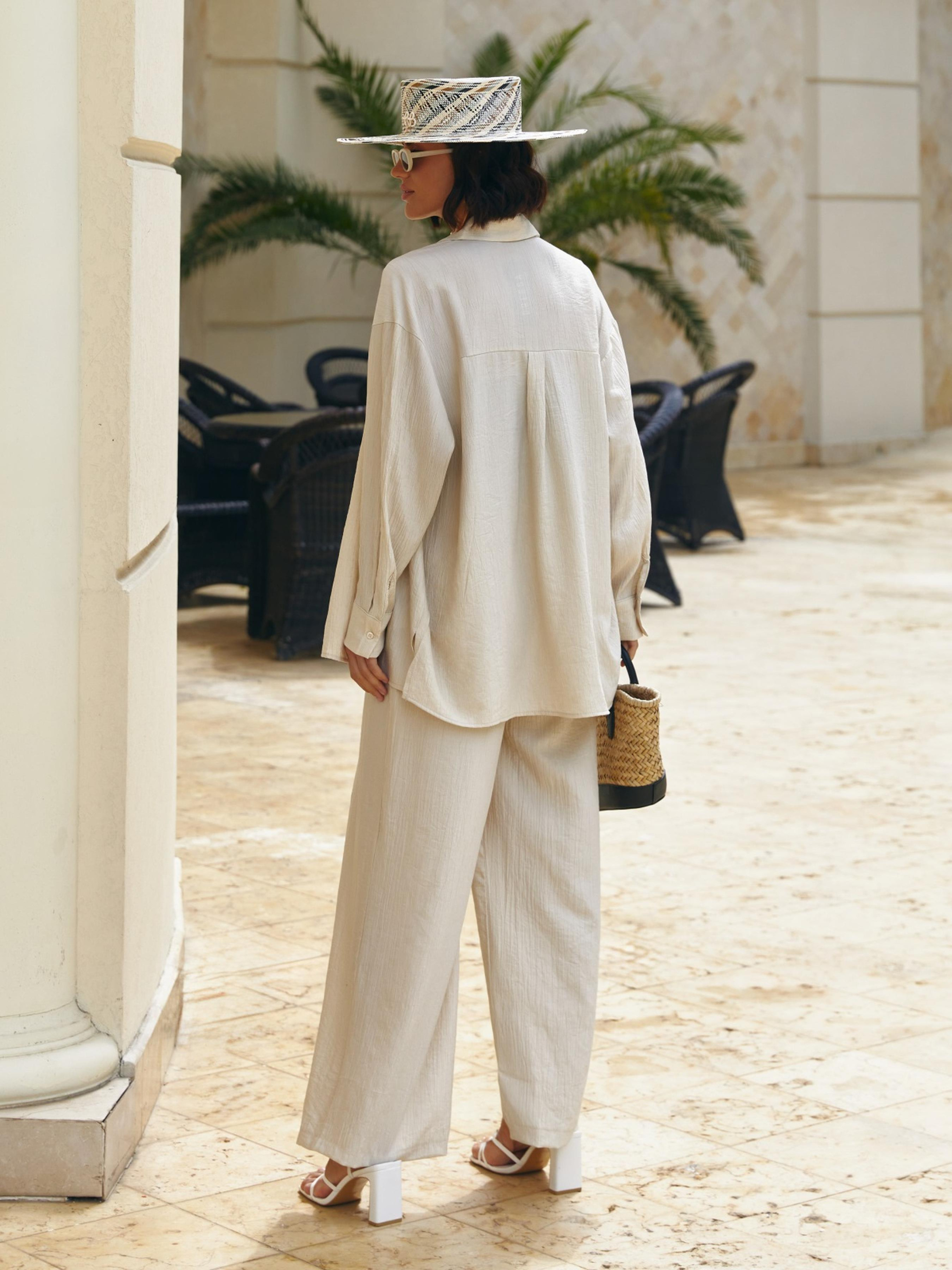 Костюм-двійка з високоякісного турецького матеріалу. Сорочка вільного крою. Виріб із класичним коміром і зниженою лінією плечового шва. Застібається на ґудзики по планці. Штани вільного крою. Пояс на еластичній гумці забезпечує комфортну посадку.