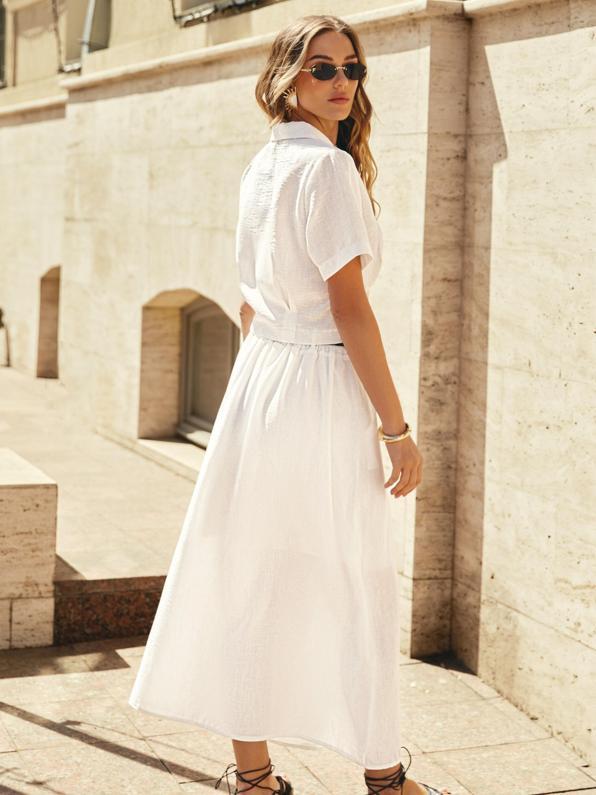 Костюм-двійка із льону жатки. Блузка з "англійським" коміром та короткими рукавами. Застібається на ґудзики. Довга спідниця з прорізними кишенями збоку. Талія виконана гумкою та доповнена шльовками. Комплектується поясом.