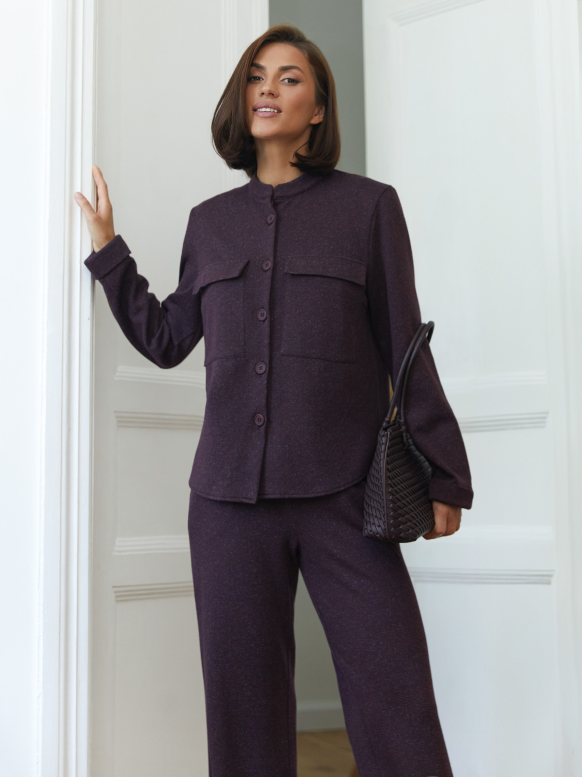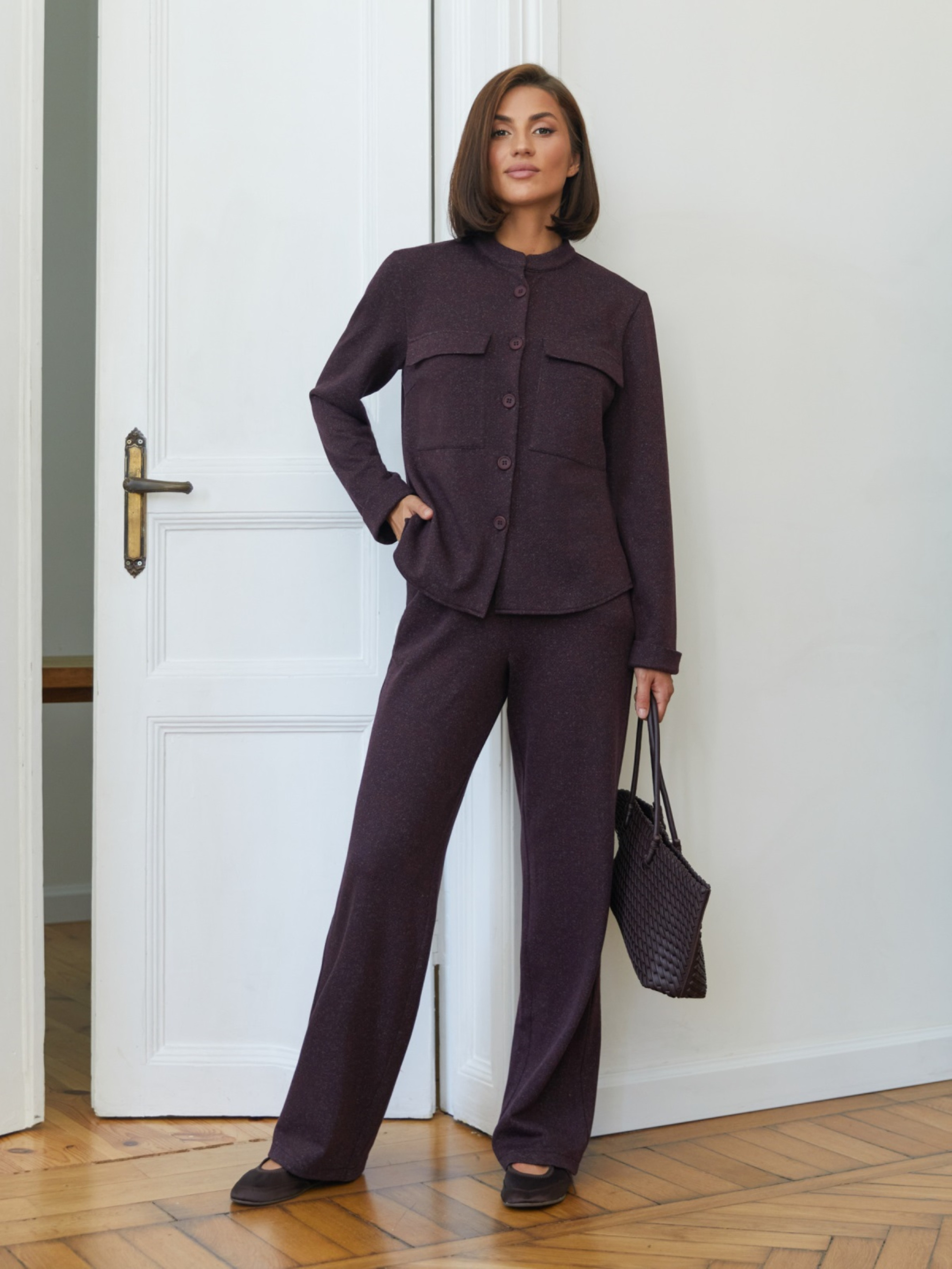 Костюм-двійка з м'якого та приємного до тіла турецького трикотажу. Жакет прямого крою, злегка подовжений, з коміром-стійкою та довгими рукавами. На поличці накладні кишені із клапанами. Застібка на ґудзики. Штани прямого силуету з еластичною талією для комфортної посадки. Доповнені прорізними кишенями.