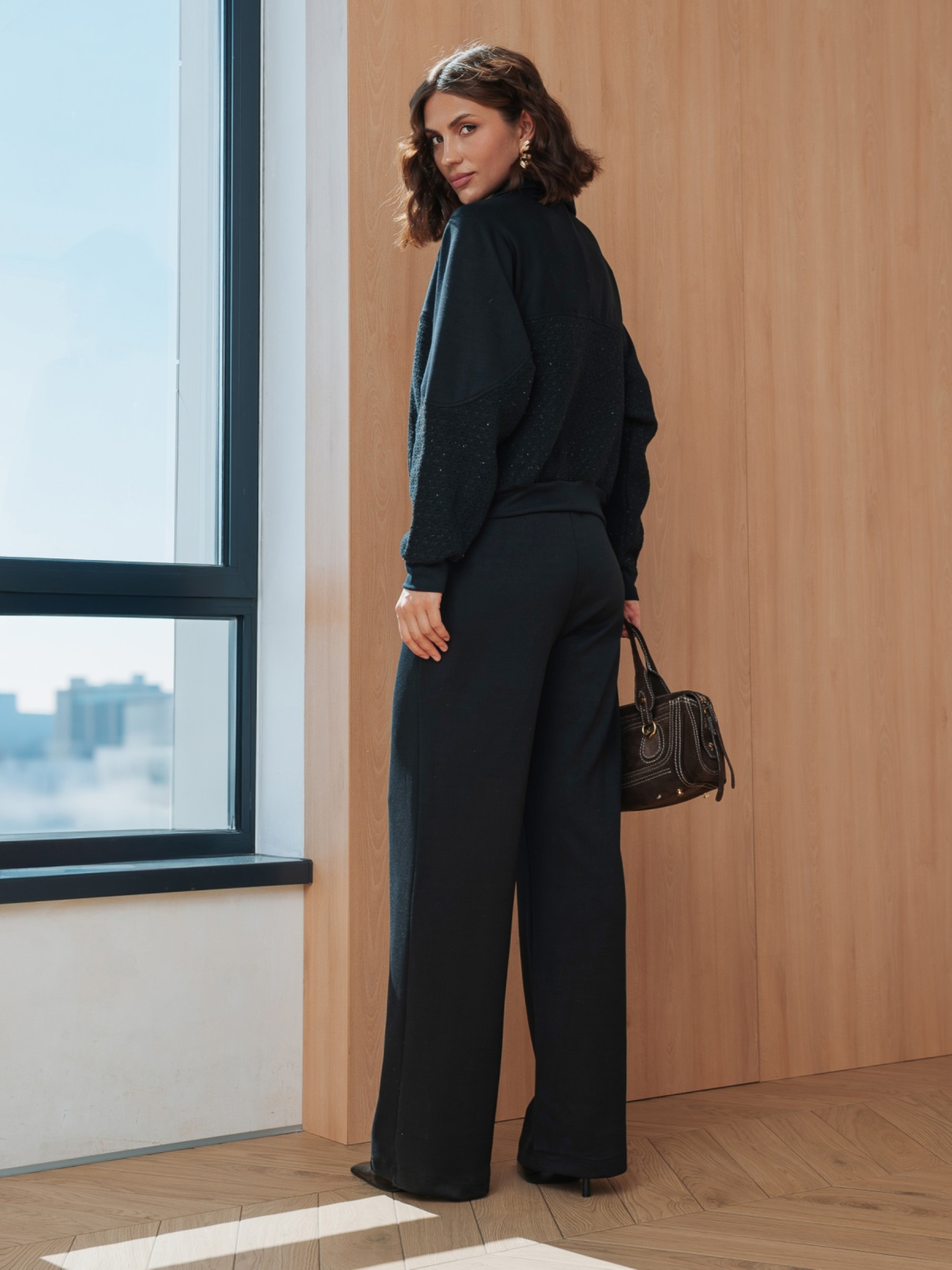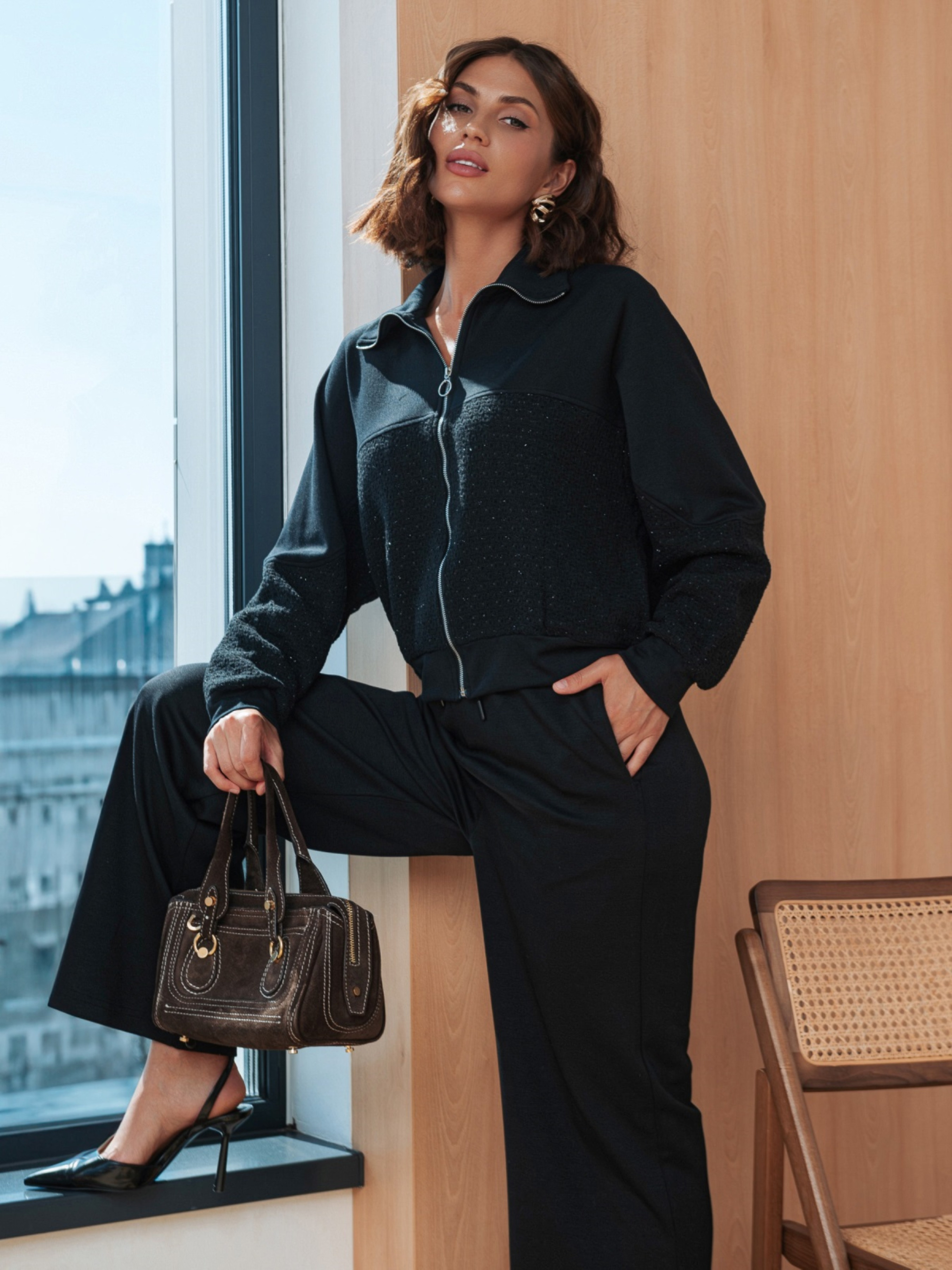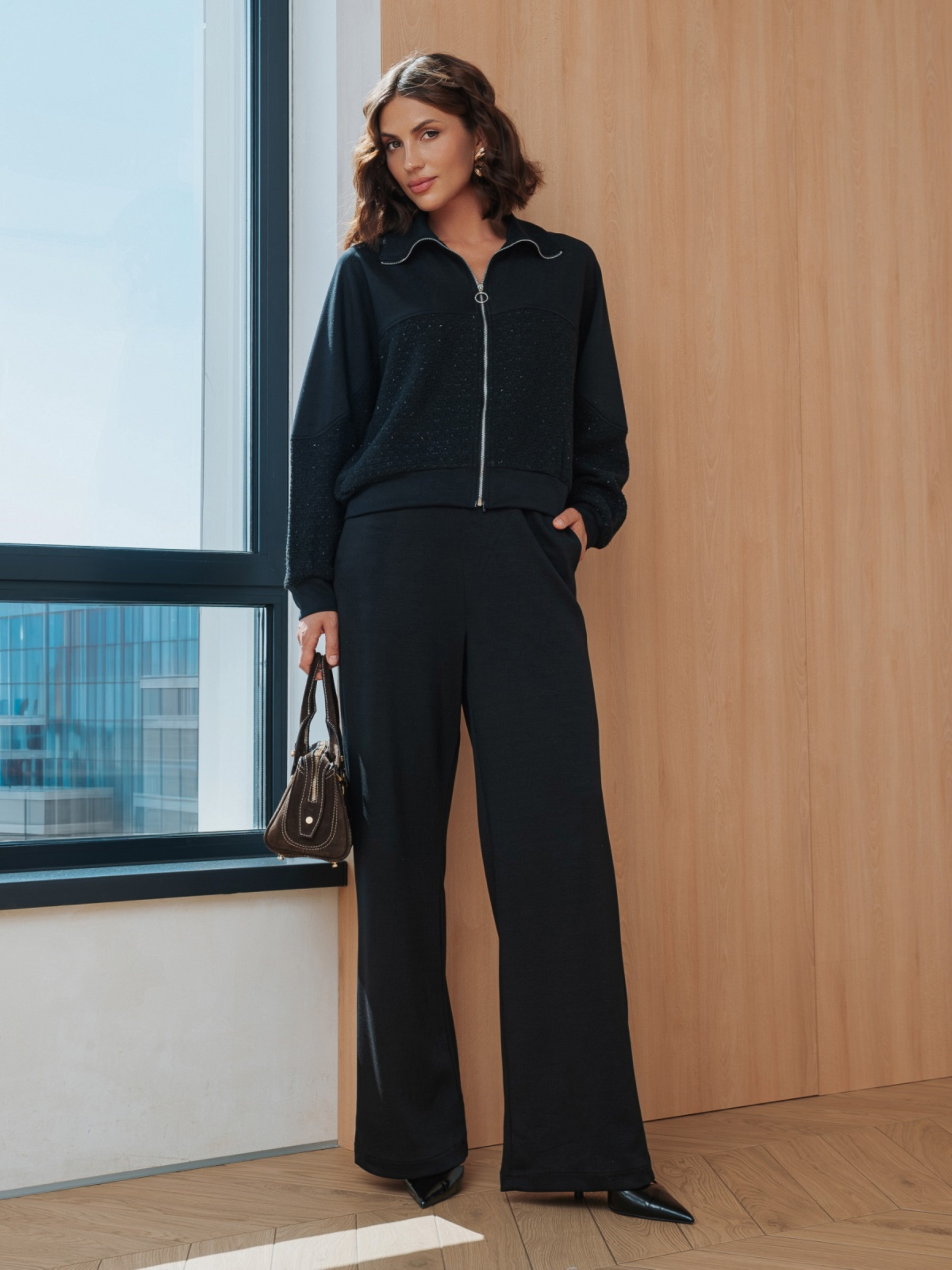 Повсякденний костюм з високоякісного турецького матеріалу. Кофта прямого крою. Модель зі спущеним рукавом. Застібається на блискавку по всій довжині. Низ і манжети виконані з еластичної гумки. Декоративна вставка з твіду спереду і на рукавах від ліктя до манжета додає фактури. Штани вільного крою, розширені до низу. Висока посадка і еластичний пояс-гумка зі шнурком забезпечують комфортну посадку. Доповнені функціональними бічними кишенями.