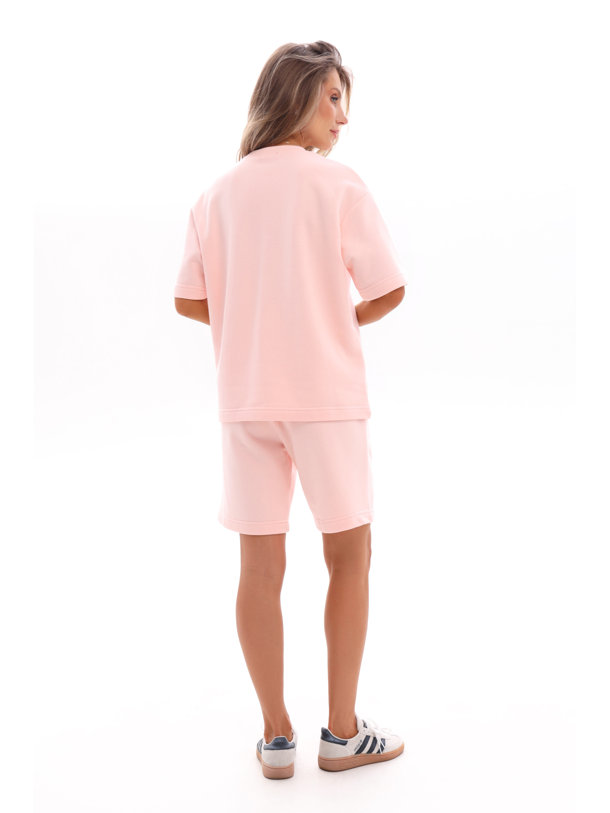 Костюм жіночий, що складається з футболки та шортів вільного крою, створений для максимального комфорту й стилю у повсякденному житті. Модель виконана з м’якої, приємної до тіла тринитки, яка добре тримає форму та дозволяє шкірі дихати. Футболка з комфортною посадкою не обмежує рухів і гармонійно виглядає на будь-якому типі фігури. Шорти доповнені зручними боковими кишенями, що додають практичності та підкреслюють розслаблений стиль. Завдяки сучасному крою та якісному матеріалу, костюм стане універсальним вибором для літніх прогулянок, відпочинку або активного дозвілля