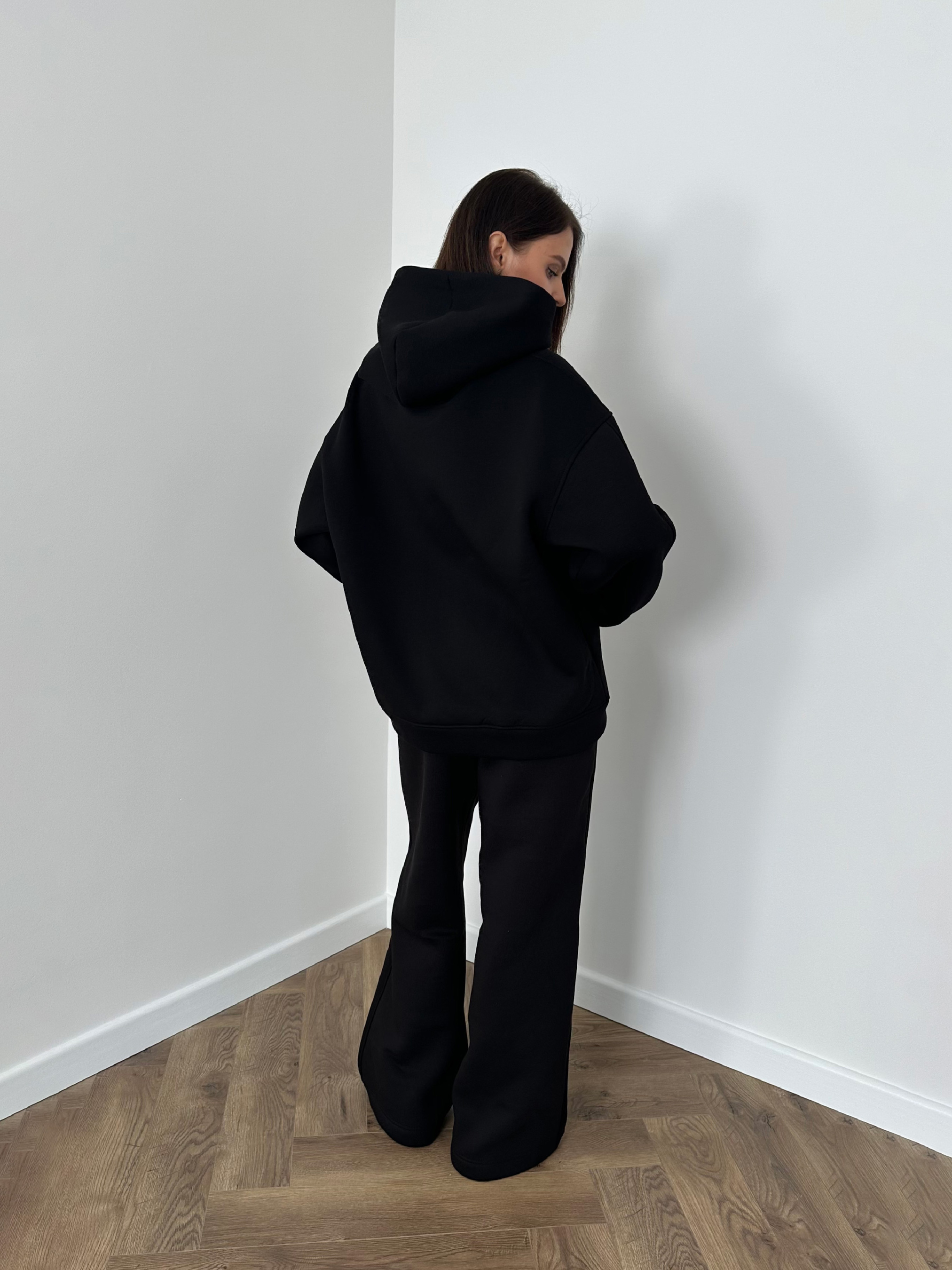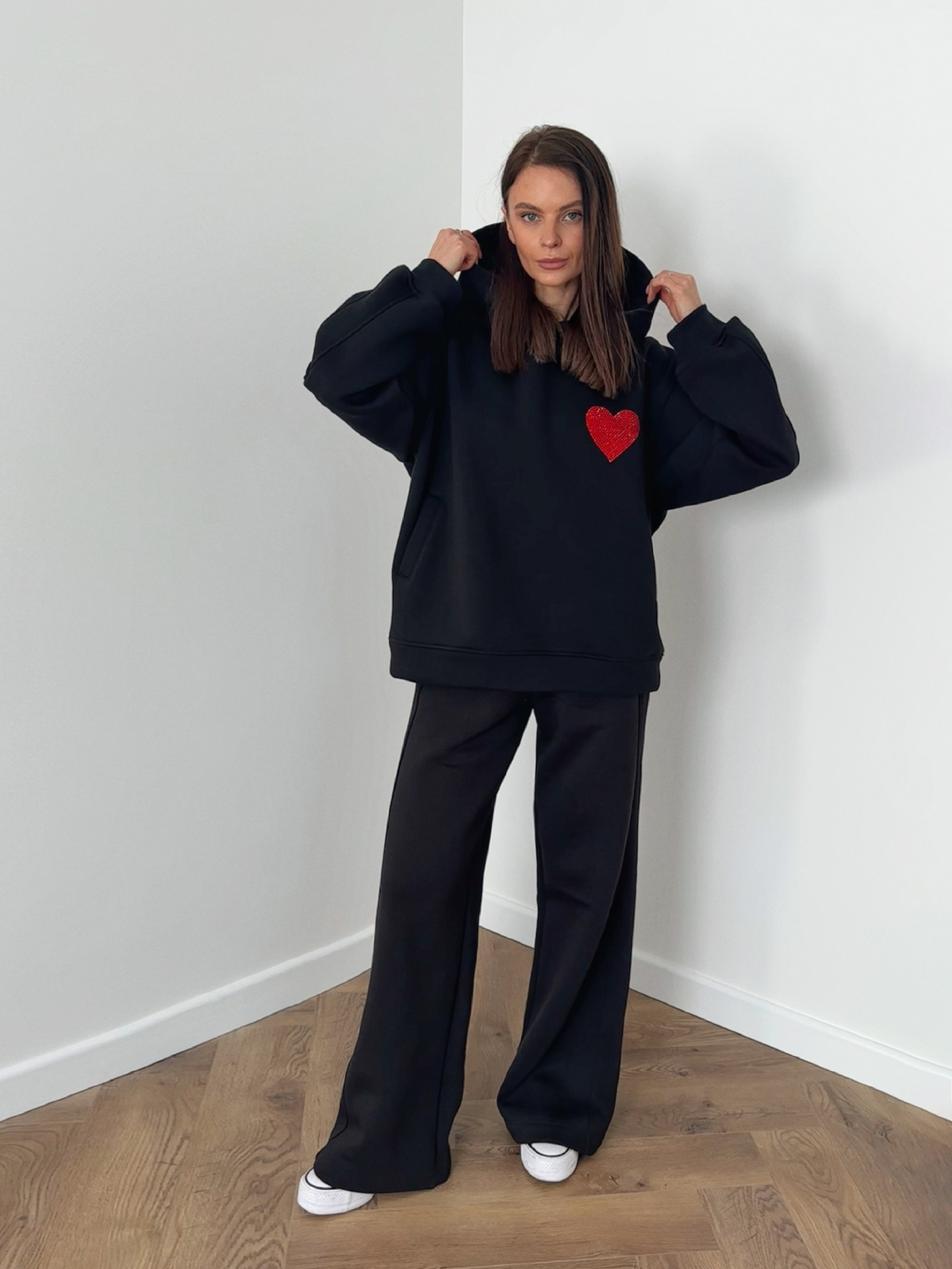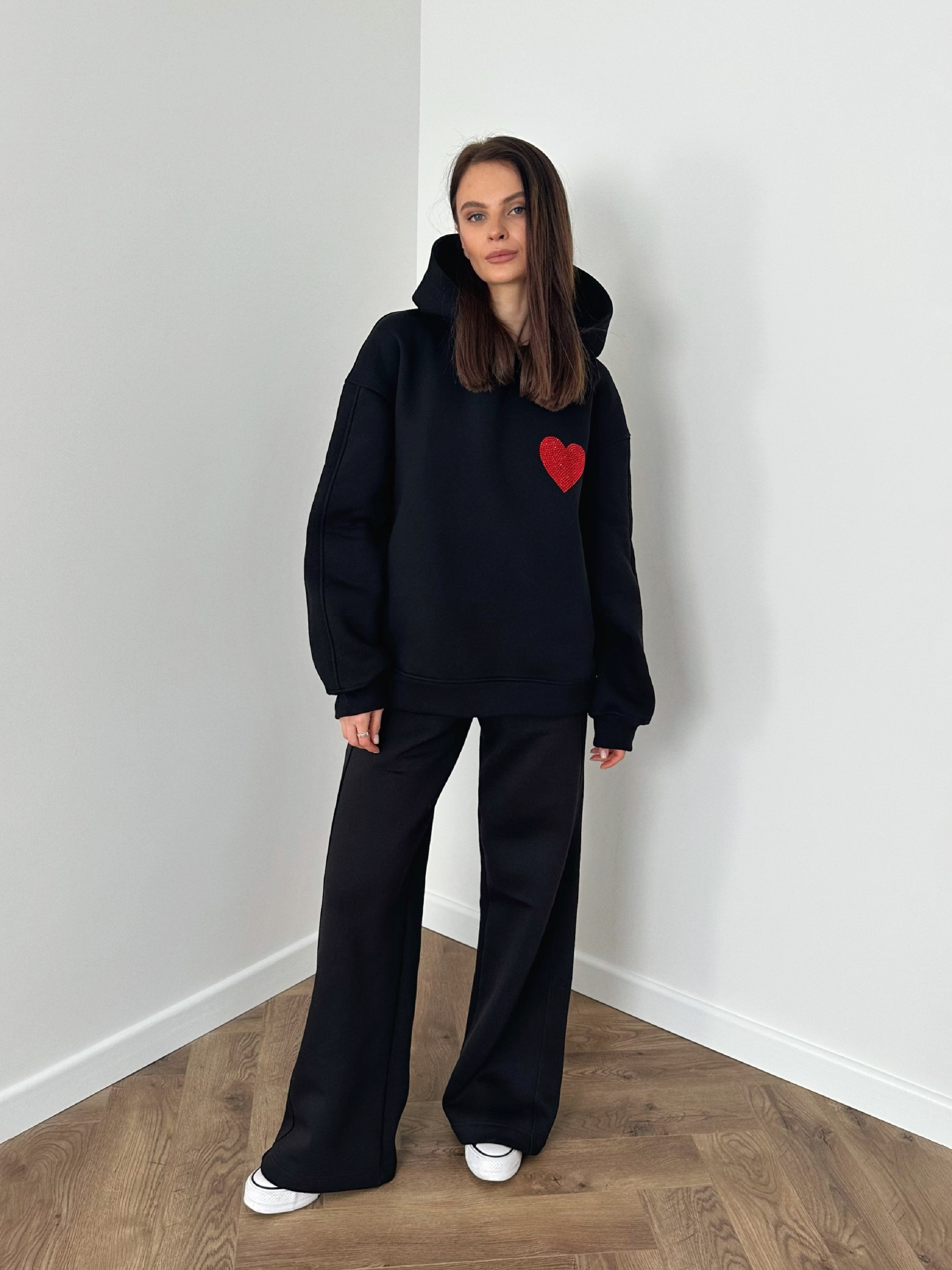 Цей стильний і практичний костюм чудово підходить як для прогулянок, так і для затишного відпочинку. Лаконічний дизайн у поєднанні з яскравим акцентом створює ідеальний баланс між комфортом і стилем. Худі чорного кольору в oversize-крої, що забезпечує максимальну зручність. Головний акцент — вишивка стразами у вигляді червоного серця, яка додає образу емоційності та оригінальності. Штани прямого крою із зручним поясом на резинці. Вони дарують повну свободу рухів і чудово виглядають у будь-якому образі. Костюм утеплений флісом, чудово підійде на сезон осінь-зима, як самостійний образ на весну. обхват грудей 84-98; обхват талії 64-78; обхват стегон 90-104