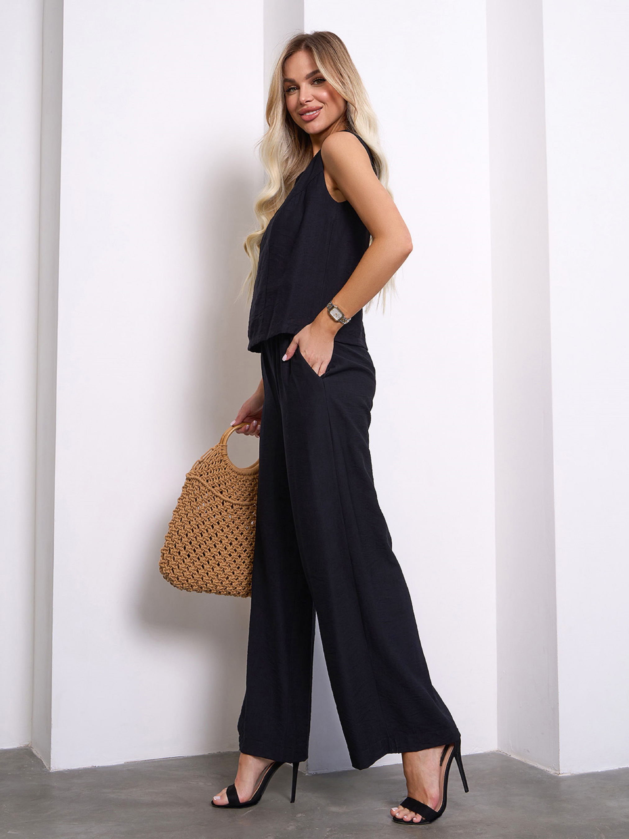 Повсякденний костюм із чорного льону з широкими брюками палаццо на резинці. Топ без рукавів із прямим кроєм та бічною блискавкою. Штани високої посадки із бічними кишенями. Напівобхват: Кофта: Груди: S (46), M (48), L (50), XL (52), Довжина виробу - 50, Штани: Талія: S (32-38), M (34-40), L (36-42), XL (38-44), Стегна: S (50), M (52), L (54), XL (56), Довжина виробу - 102, Довжина по внутрішньому шву - 72, Тканина: Низької еластичності. Склад: 65% льон, 20% бавовна, 15% поліестер