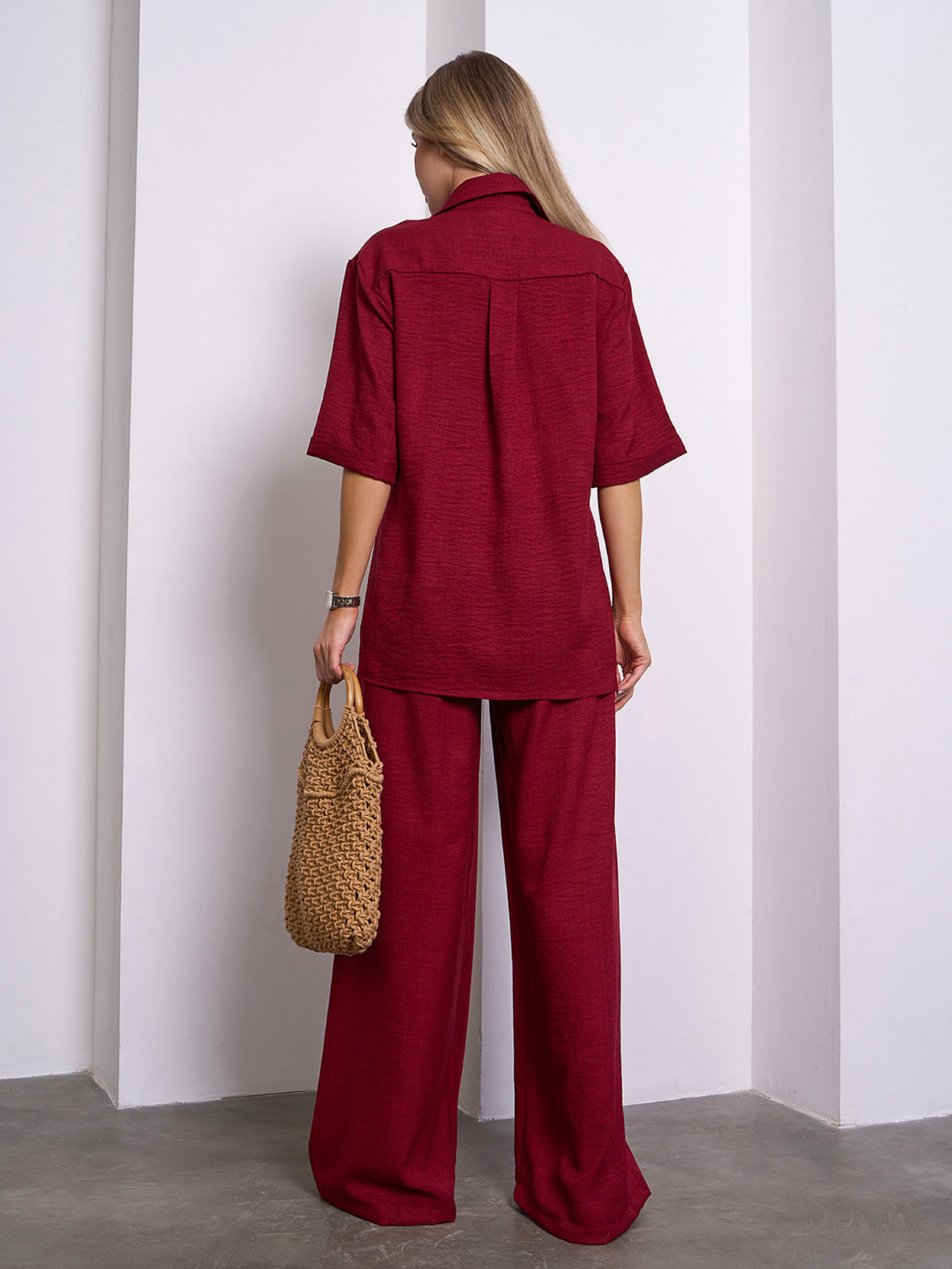 Бордовий лляний костюм вільного крою з подовженою сорочкою та широкими брюками. Сорочка на ґудзиках з рукавами до ліктів, бічними розрізами та відкладним коміром. Штани на резинці з високою посадкою. Напівобхват: Кофта: Груди: S (56), M (58), L (60), XL (62), Довжина виробу - 69, Рукав - 30, Штани: Талія: S (32-38), M (34-40), L (36-42), XL (38-44), Стегна: S (54), M (56), L (58), XL (60), Довжина виробу - 109, Довжина по внутрішньому шву - 77, Тканина: Низької еластичності. Склад: 65% льон, 20% бавовна, 15% поліестер