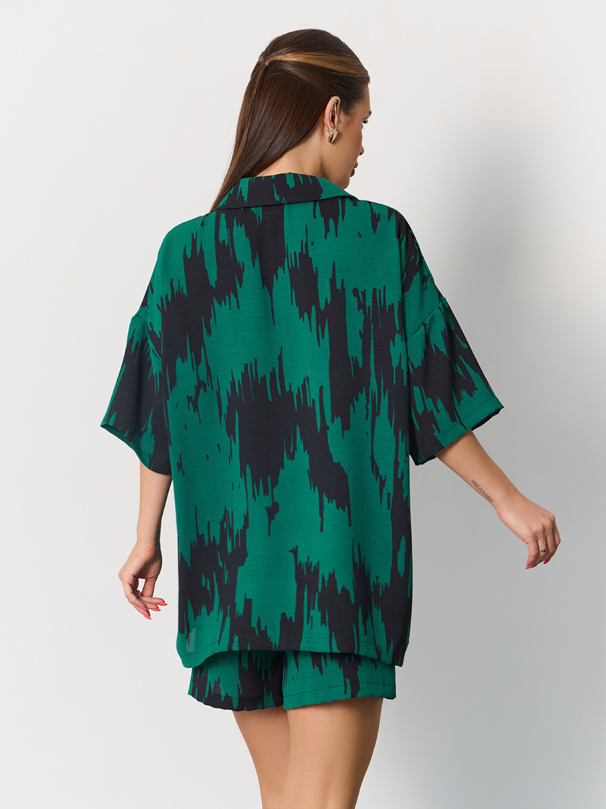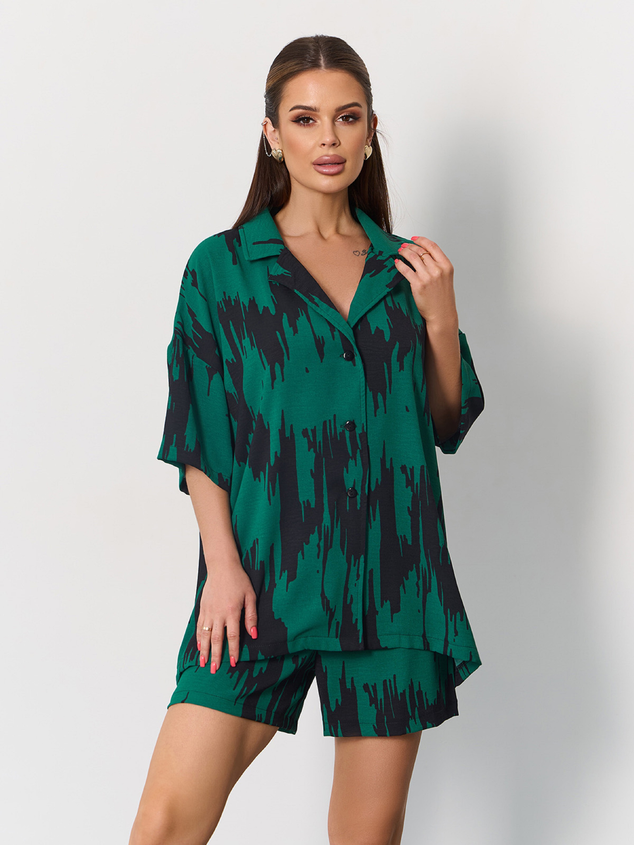 Чорно-зелений оверсайз костюм із принтованого крепу. Сорочка на ґудзиках з коміром та рукавами до ліктів. Короткі шорти із широкою поясною гумкою, декорованою нашивками. Шорти з кишенями. Напівобхват: Сорочка: Груди: S (60), M (62), L (64), XL (66), Довжина виробу - 66, Рукав - 20. Шорти: Талія: S (32-42), M (34-44), L (36-46), XL (38-48), Стегна: S (54), M (56), L (58), XL (60), Довжина виробу - 41. Тканина: Низької еластичності. Склад: 59% поліестер, 21% еластан, 20% бавовна