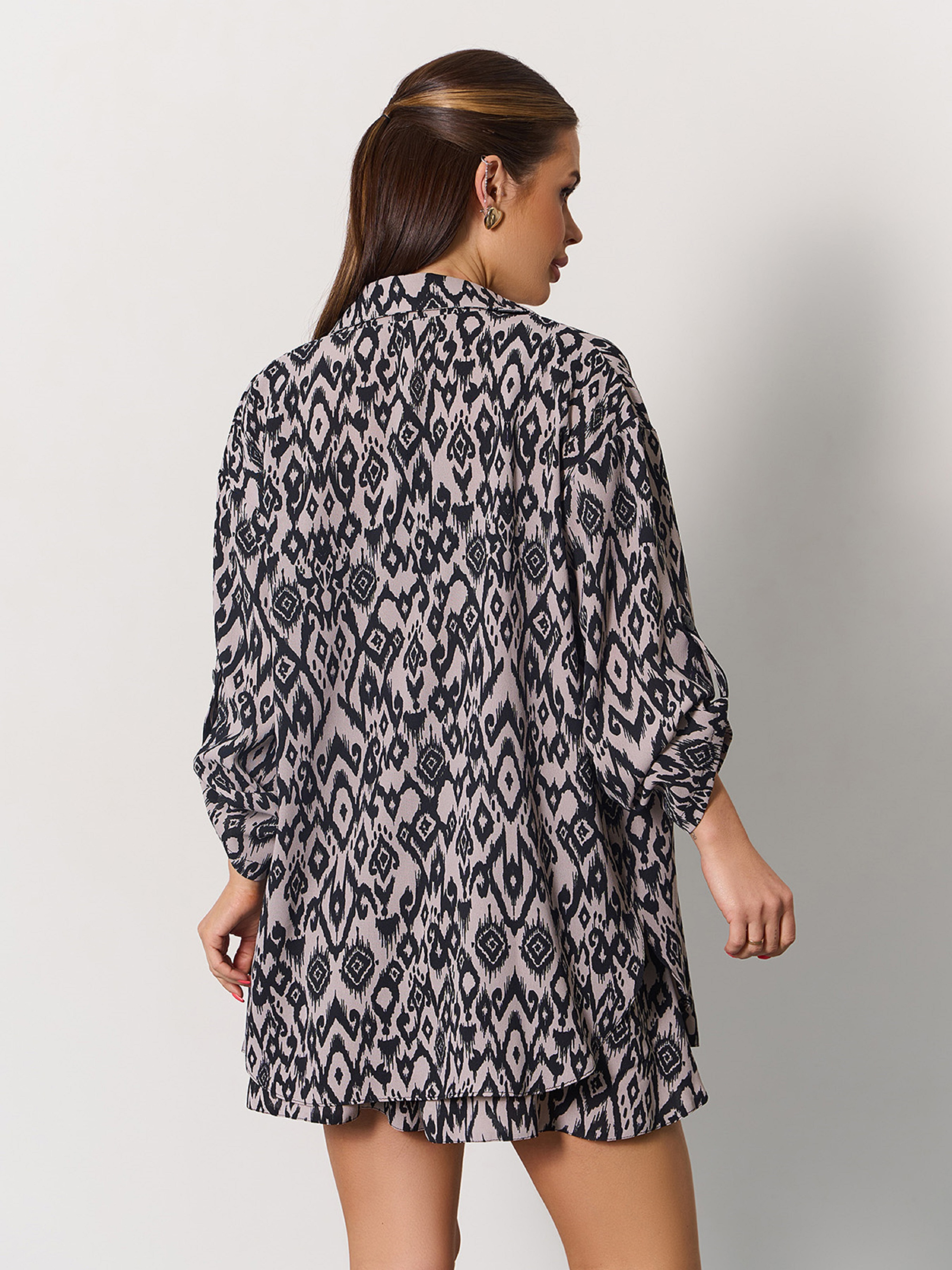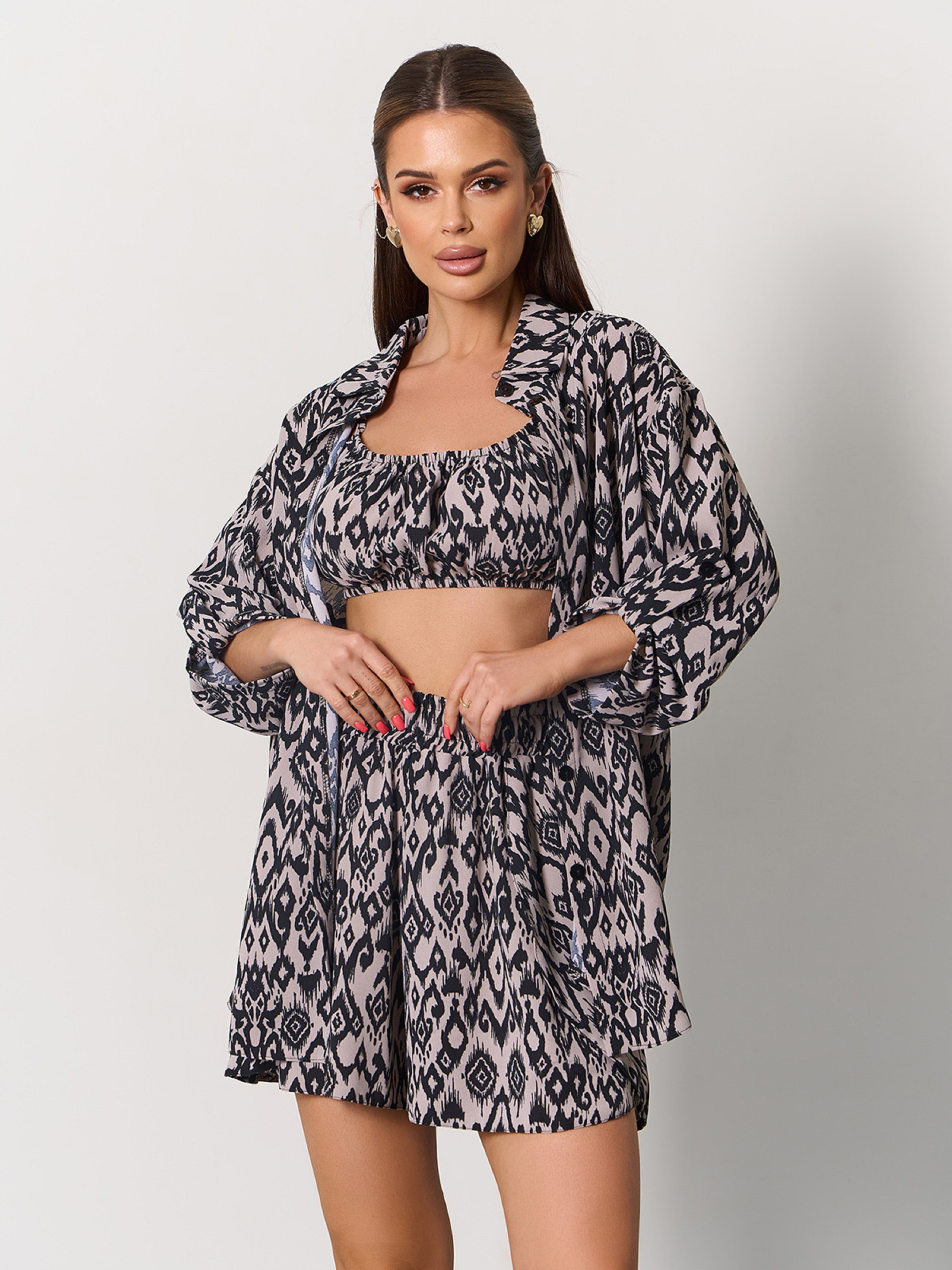 Молодіжний костюм трійка із чорно-бежевого льону з орнаментом. Вільна сорочка на ґудзиках з коміром та рукавами на хлястиках. Топ бандо з тонкими зав'язками та еластичною жаткою на спинці. Короткі шорти кльош з поясною гумкою та бічними вставками з нахлестом. Напівобхват: Сорочка: Груди: S (54), M (57), L (58), XL (60); Довжина виробу - 71; Рукав - 46. Топ: Груди: S (38-51), M (39-53), L (39-55), XL (44-54); Довжина виробу - 18. Шорти: Талія: S (29-47), M (30-48), L (31-51), XL (38-48); Стегна: S (57), M (60), L (63), XL (68); Довжина виробу - 39. Тканина: Низької еластичності. Склад: 65% льон, 20% бавовна, 15% поліестер