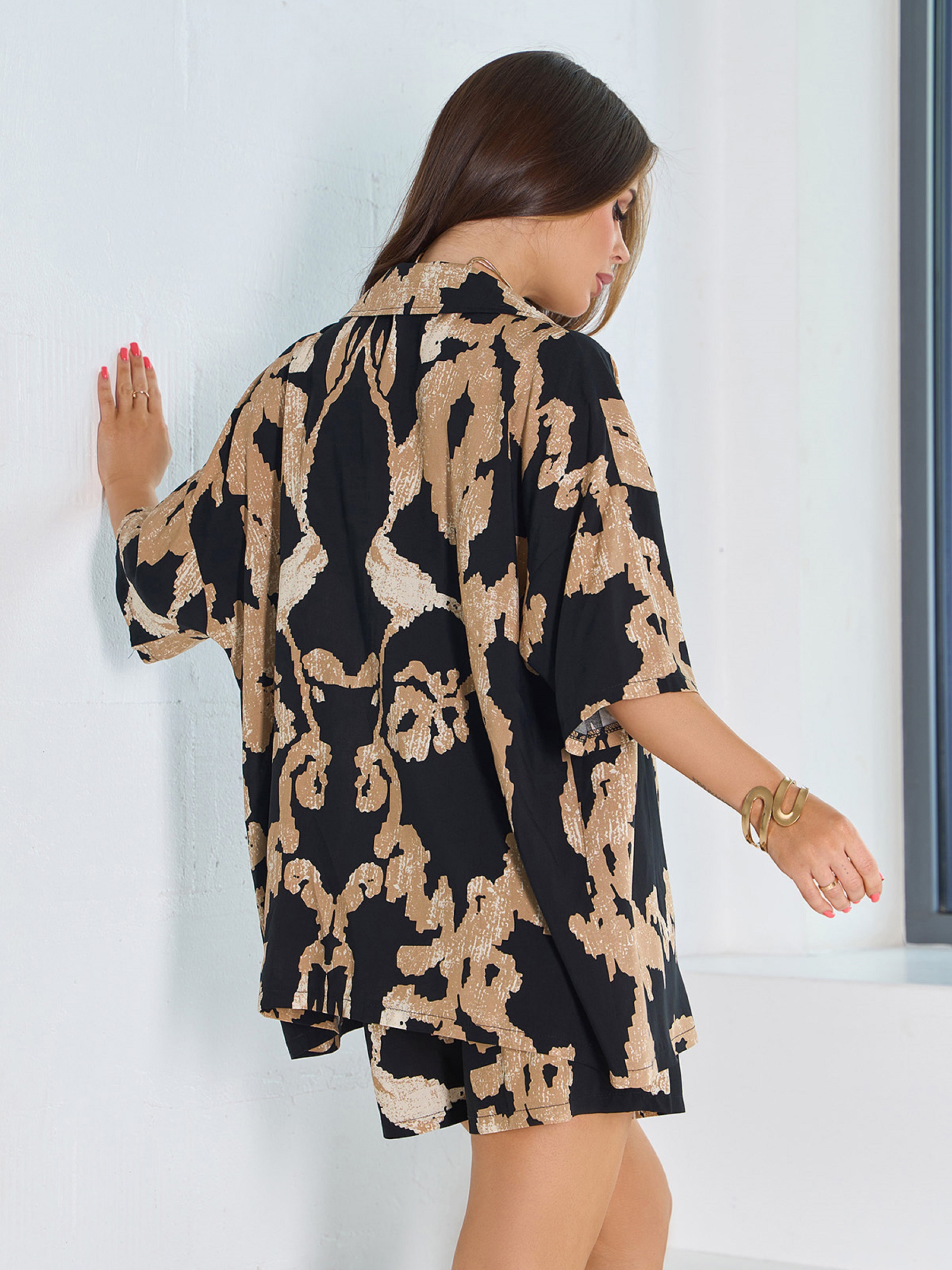 Чорний костюм двійка, виконаний із принтованого бавовняного штапелю. Вільна сорочка на ґудзиках із класичним коміром та приспущеними рукавами до ліктів. Шорти високої посадки з кишенями та декоративними гудзиками. Модель із широкою поясною гумкою, декорованою нашивкою. Напівобхват: Сорочка: Груди: S(62), M(64), L(66), XL(68), Довжина виробу - 68, Рукав - 20; Шорти: Талія: S(32-42), M(34-44), L(36-46), XL(38-48), Стегна: S(54), M(56), L(58), XL(60), Довжина виробу - 41; Тканина: Низької еластичності.
