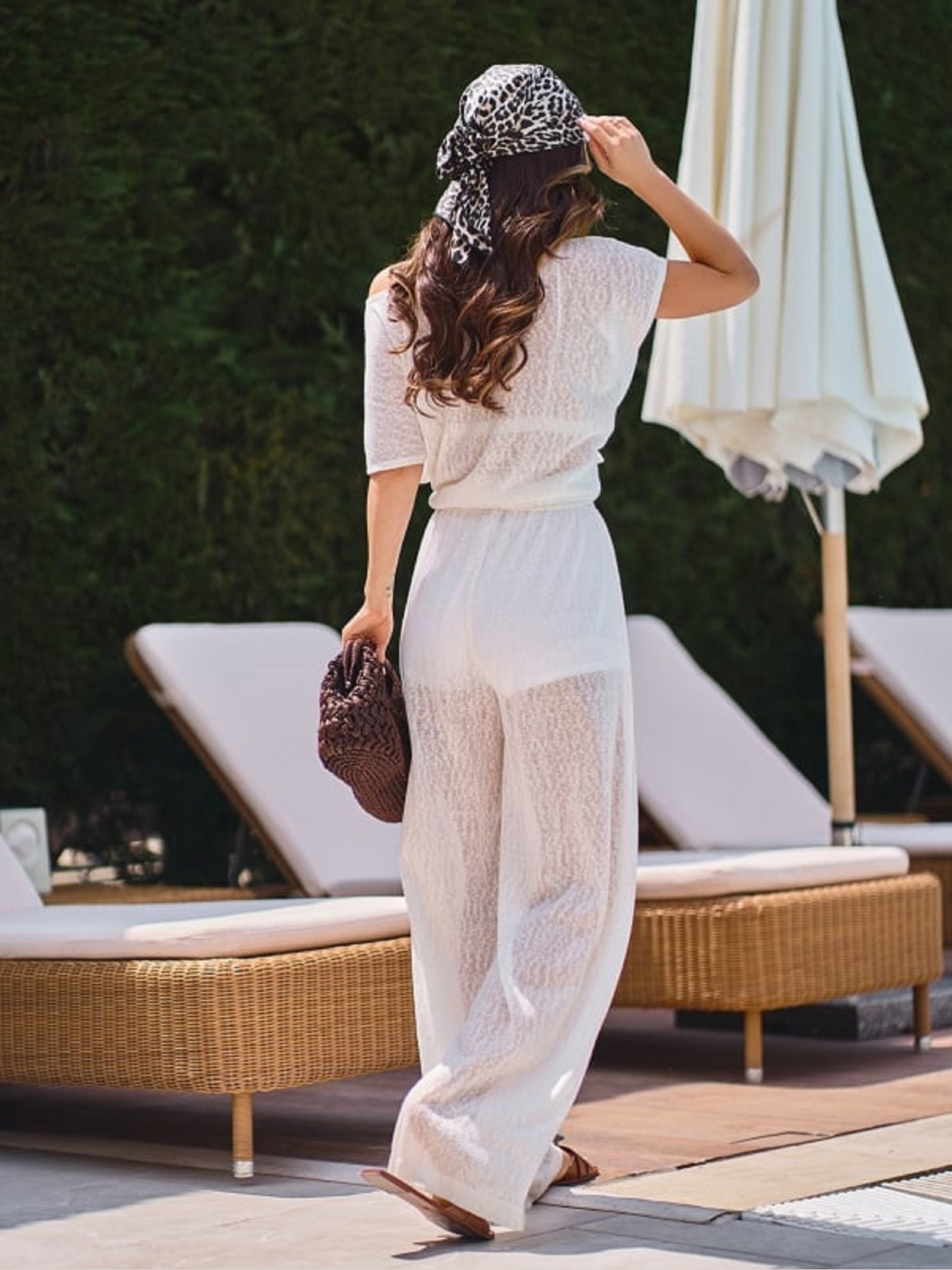 Брючний костюм із напівпрозорого білого трикотажу з нижніми шортиками. Вільна футболка з прямим кроєм, приспущеними проймами та напівкруглою горловиною. Штани з прямим кроєм та поясною гумкою. Напівобхват: Футболка: Груди: S (59), M (61), L (63), XL (65), Довжина виробу – 60; Брюки: Талія: S (31-40), M (33-42), L (35-44), XL (37-46), Стегна: S (60), M (62), L (64), XL (66), Довжина виробу - 108, Довжина по внутрішньому шву - 77; Тканина: Високої еластичності.