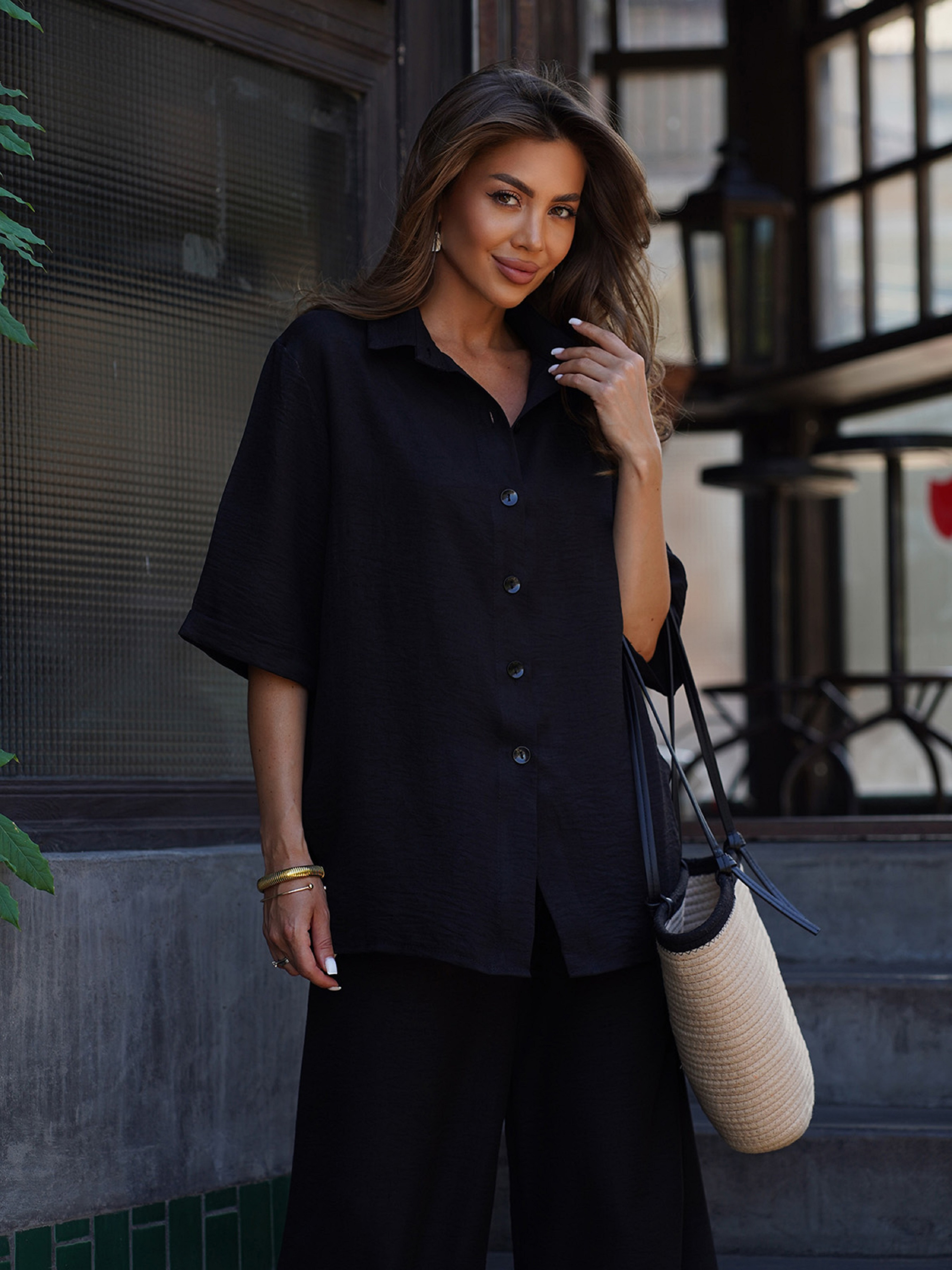 Чорний вільний костюм із лляного матеріалу з подовженою сорочкою, декорованою розрізами. Сорочка на ґудзиках з рукавами до ліктів, бічними розрізами та відкладним коміром. Високі штани прямого широкого крою з резинкою на поясі. Напівобхват: Кофта: Груди: S (56), M (58), L (60), XL (62), Довжина виробу - 69, Рукав - 30; Брюки: Талія: S (32-38), M (34-40), L (36-42), XL (38-44), Стегна: S (54), M (56), L (58), XL (60), Довжина виробу - 109, Довжина по внутрішньому шву - 77; Тканина: Низької еластичності.