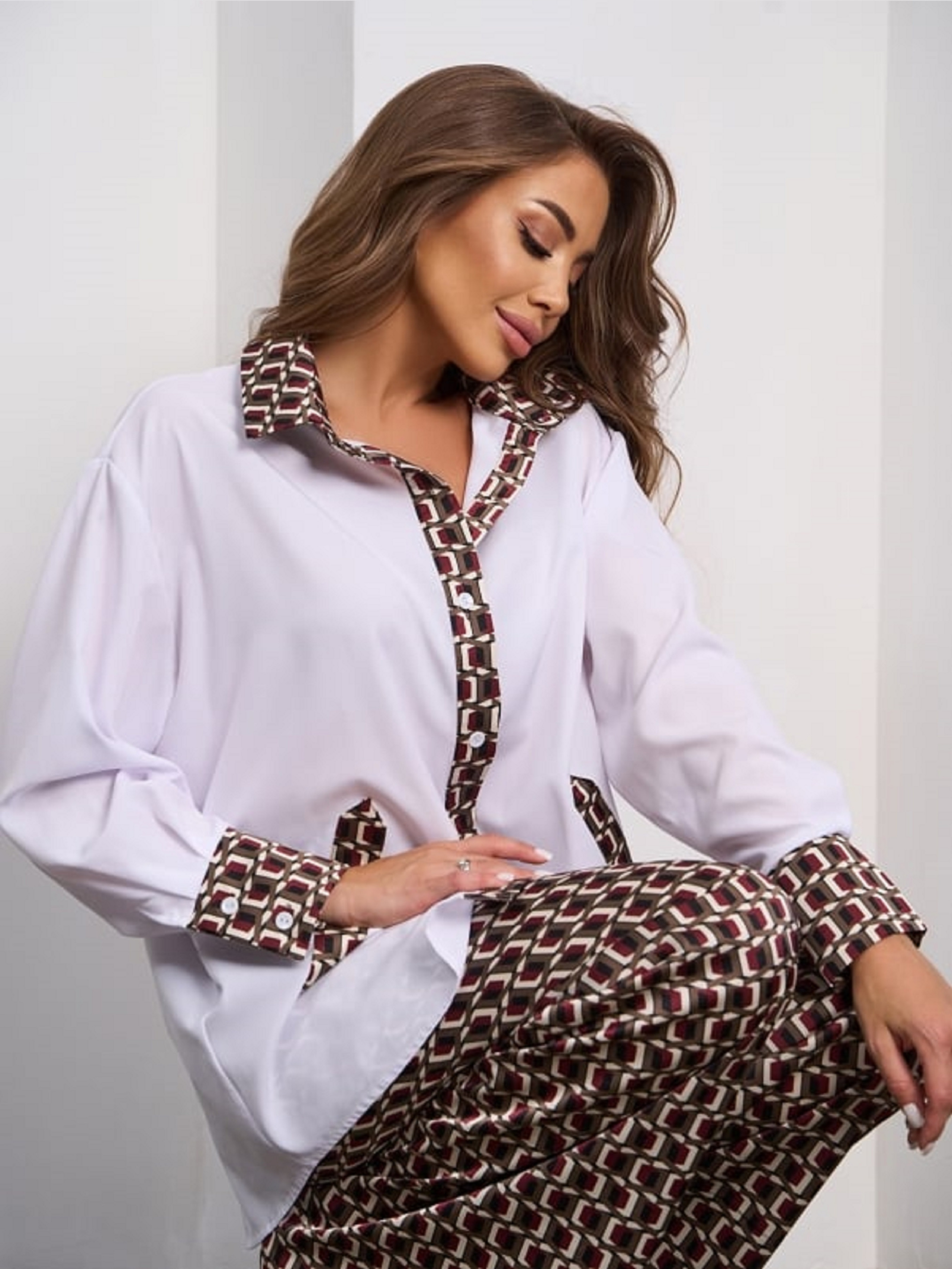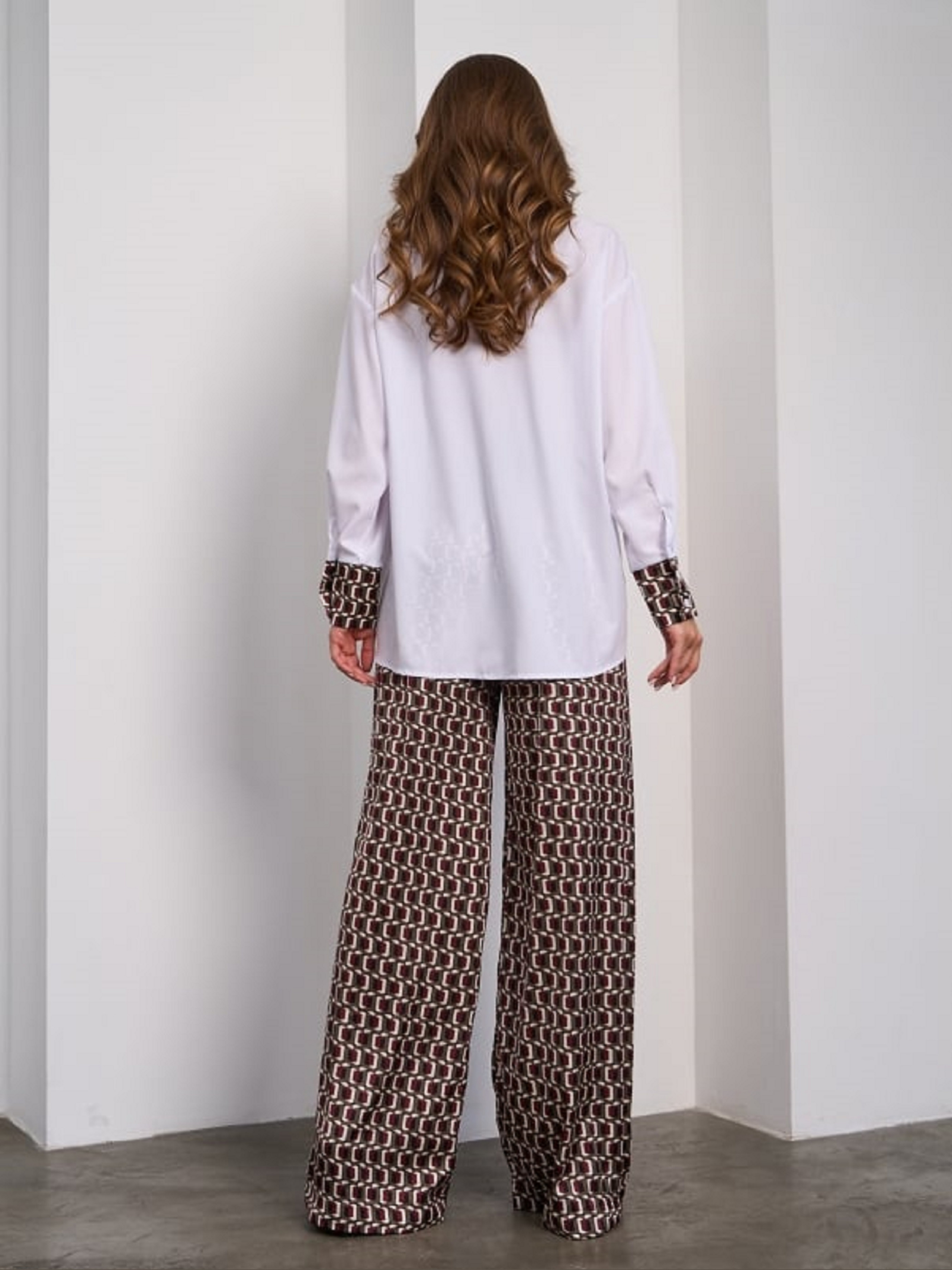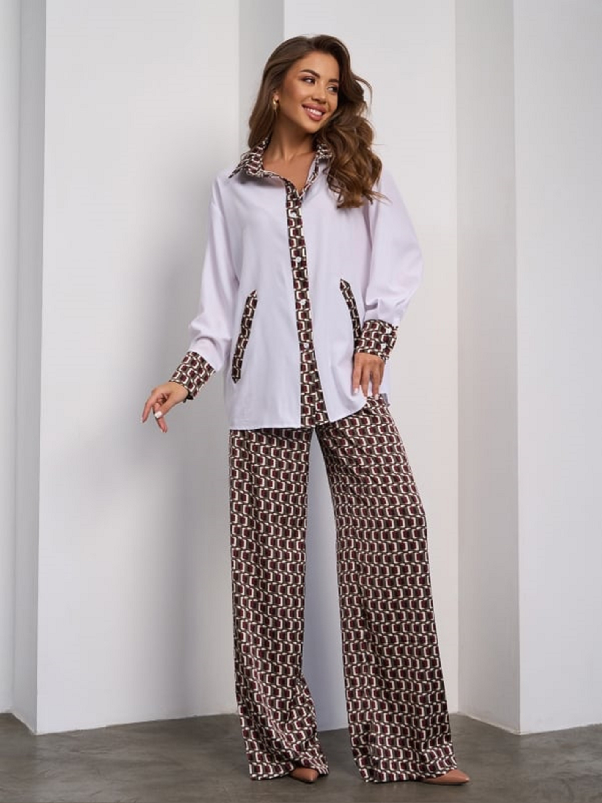Шовковий вільний костюм з принтованими брюками та вставками на сорочці. Сорочка на ґудзиках з подовженим кроєм. Довгі рукави із манжетами. Широкі штани з поясною гумкою та вільним кроєм. Напівобхват: Кофта: Груди: S (60), M (62), L (64), XL (66), Довжина виробу - 68/70, Рукав - 51, Штани: Талія: S (32-38), M (34-40), L (36-42), XL (38-44), Стегна: S (50), M (52), L (54), XL (56), Довжина виробу - 109, Довжина по внутрішньому шву - 82, Тканина: Низької еластичності.