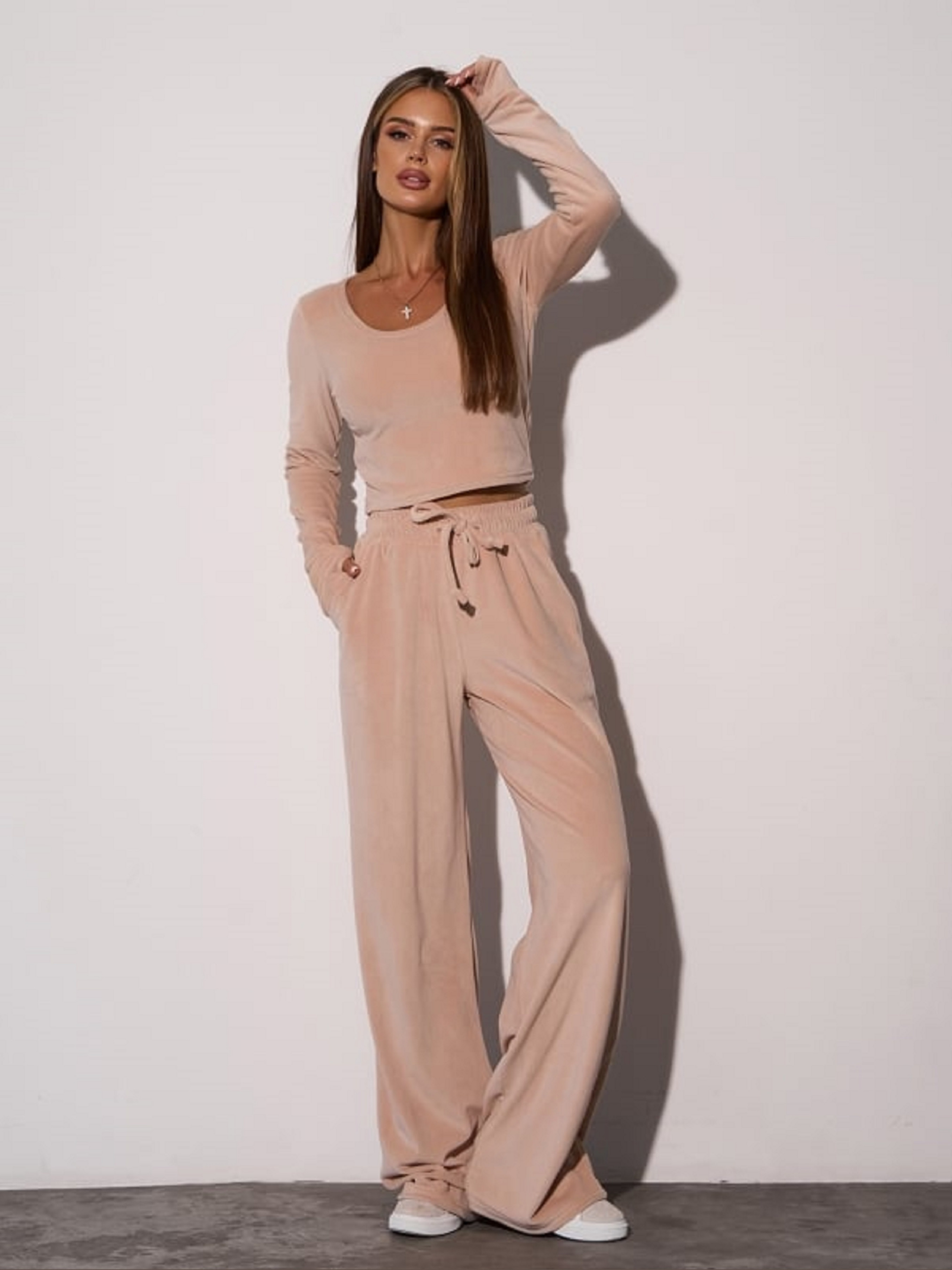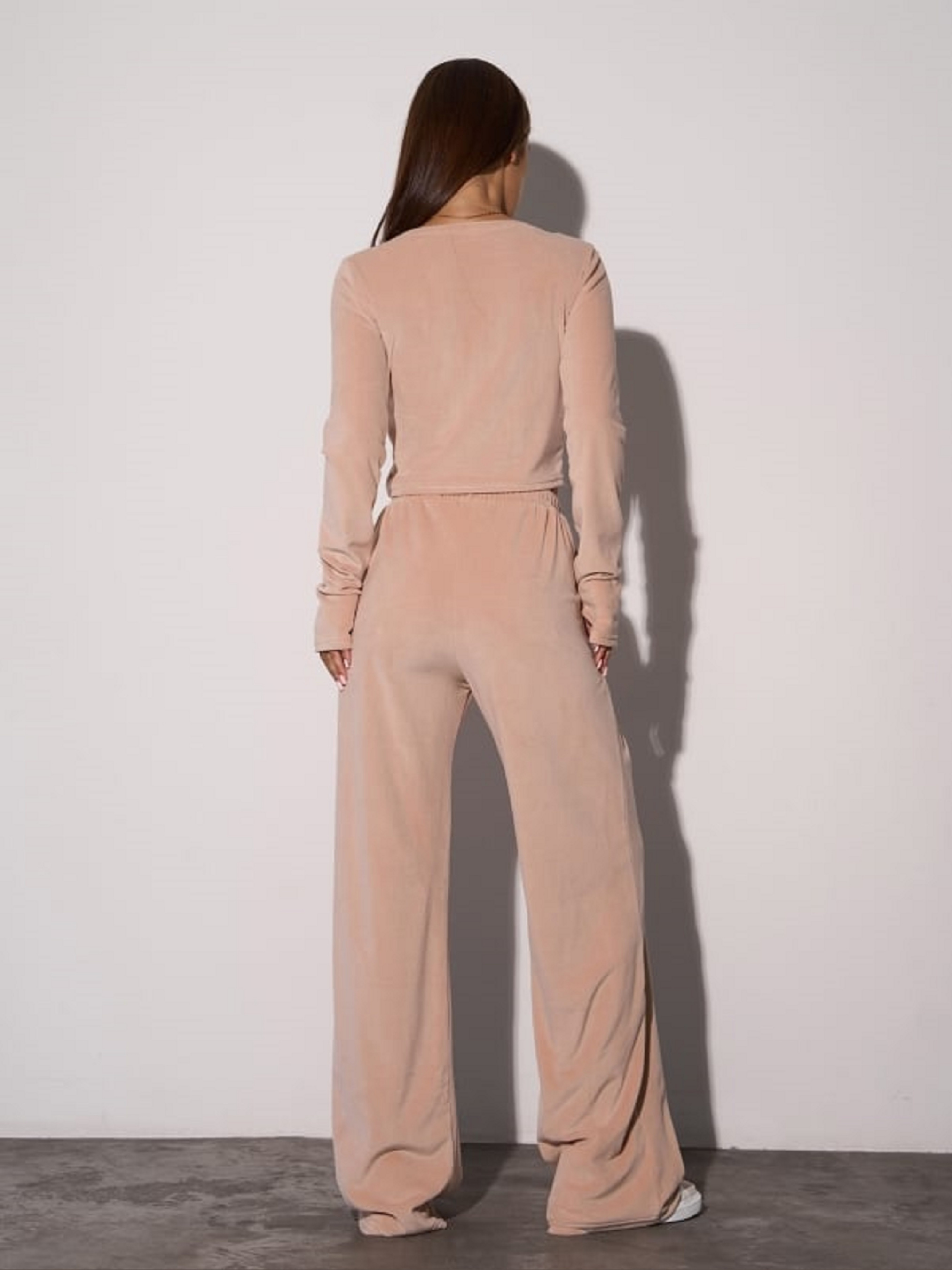 Велюровий бежевий костюм з топом, що облягає, і широкими брюками. Топ з напівкруглою горловиною та довгими рукавами з врізами для пальців. Штани на гумці зі шнурівкою та бічними кишенями. Висока посадка. Напівобхват: Кофта: Груди: S (40), M (42), L (44), XL (46), Довжина виробу - 43, Рукав - 67, Штани: Талія: S (30-38), M (32-40), L (34-42), XL (36-44), Стегна: S (52), M (54), L (56), XL (58), Довжина виробу - 109, Довжина по внутрішньому шву - 82, Тканина: Високої еластичності.