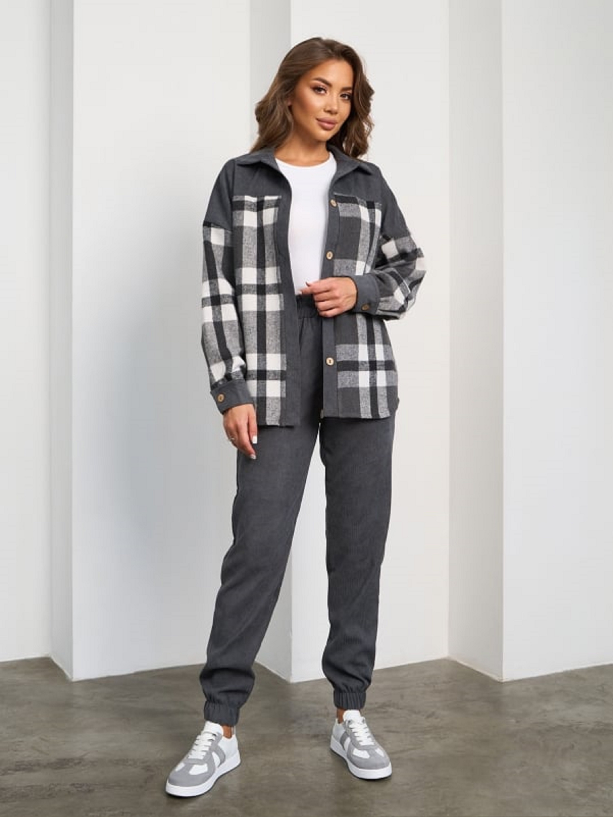 Комбінований костюм з брюками джоггерами, виконаний з темно-сірого вельвету та картатої байки. Сорочка на гудзиках з коміром та довгими рукавами. Штани на гумках з високою посадкою та бічними кишенями. Напівобхват: Кофта: Груди: S (53), M (55), L (57), XL (59), Довжина виробу - 68, Рукав - 58, Штани: Талія: S (30-38), M (32-40), L (34-42), XL (36-44), Стегна: S (48), M (50), L (52), XL (54), Довжина виробу - 101, Довжина по внутрішньому шву - 75, Тканина: Низької еластичності.