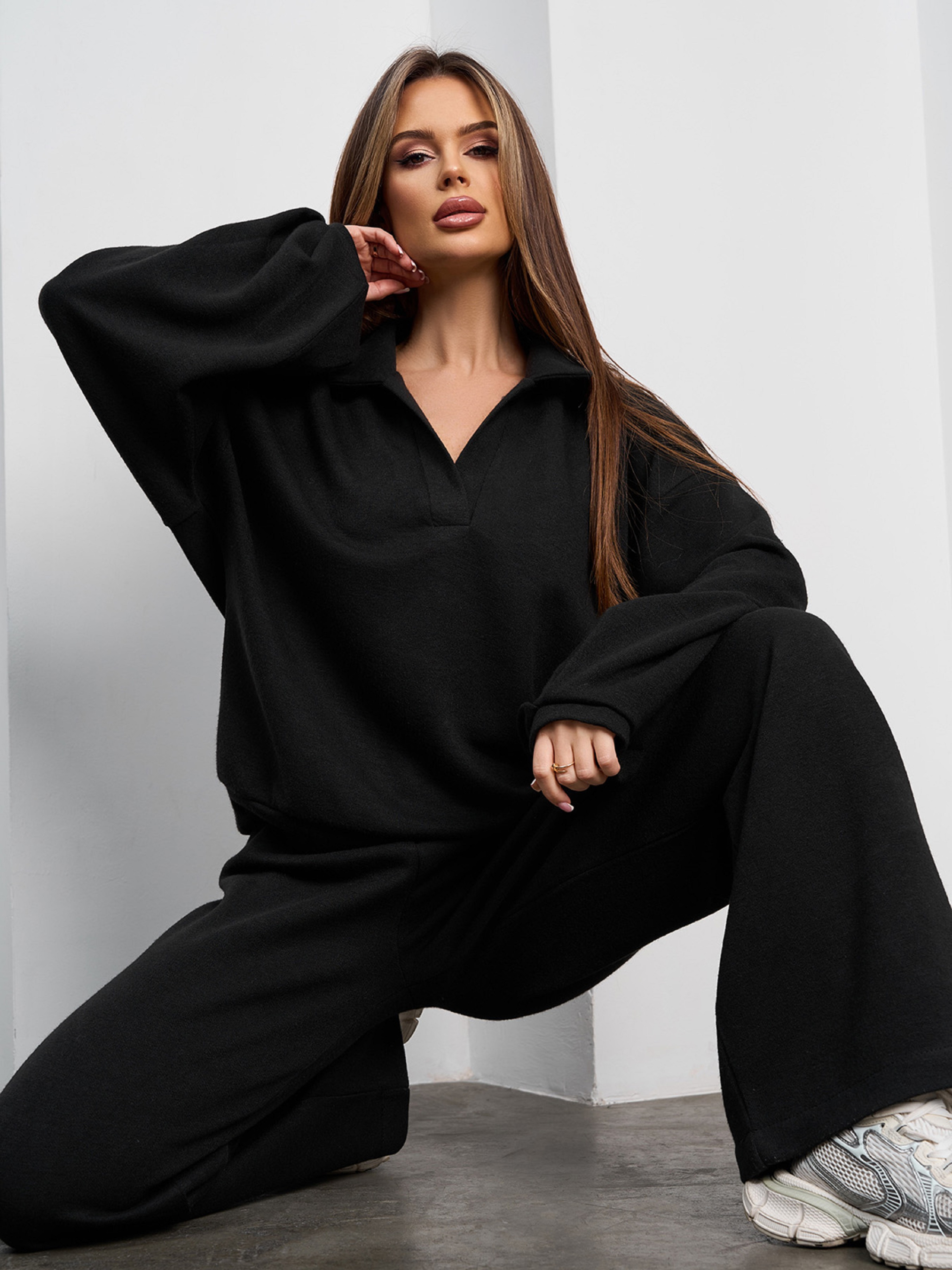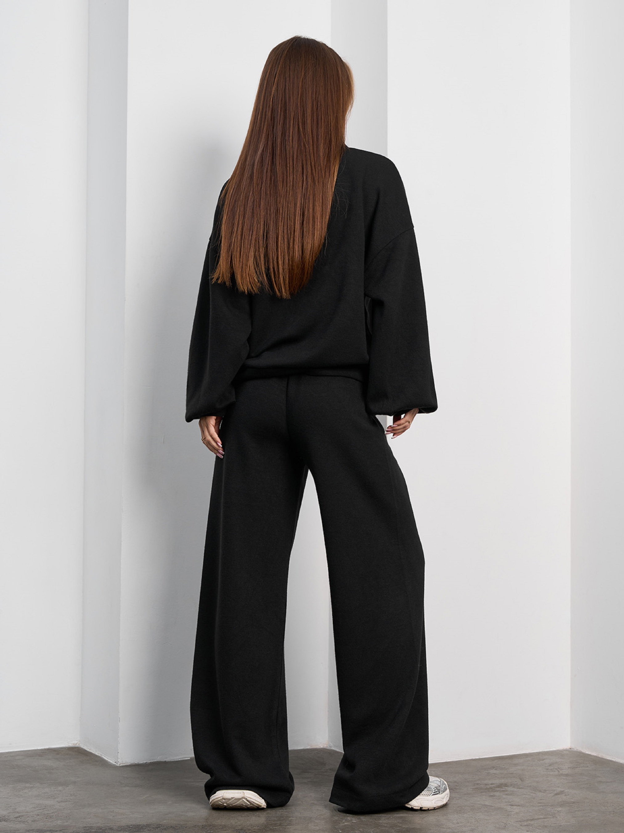 Чорний вільний костюм із ангорового трикотажу з коміром та V-подібною горловиною. Толстовка на манжетах з довгими рукавами та вільним кроєм. Штани широкого крою з поясною гумкою. Напівобхват: Кофта: Груди: S (55), M (57), L (59), XL (61), Довжина виробу - 61, Рукав - 56, Штани: Талія: S (32-40), M (34-42), L (36-44), XL (38-46), Стегна: S (53), M (55), L (57), XL (59), Довжина виробу - 106, Довжина по внутрішньому шву - 76, Тканина: Високої еластичності.