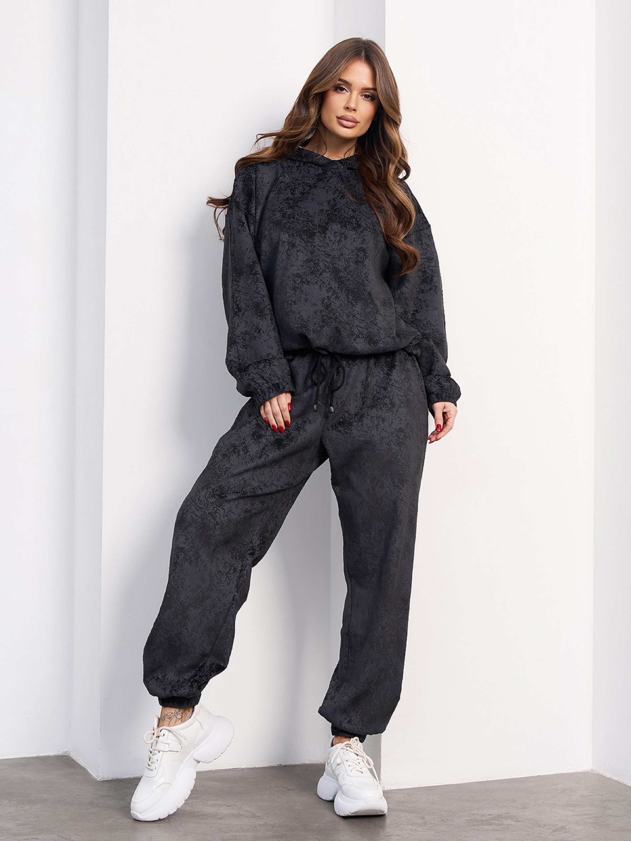 Чорний демісезонний костюм з мармурового велюру з капюшоном і джоггерами. Толстовка на кулісці з довгими рукавами та вільним кроєм. Штани на поясній та нижніх гумках з кишенями та високою посадкою на талії. Напівобхват: Кофта: Груди: S (57), M (59), L (61), XL (63), Довжина виробу — 58, Рукав — 51, Штани: Талія: S (32-40), M (34-42), L (36-44), XL (38-46), Стегна: S (56), M (58), L (60), XL (62), Довжина виробу — 99, Довжина по внутрішньому шву — 71, Тканина: Високої еластичності.