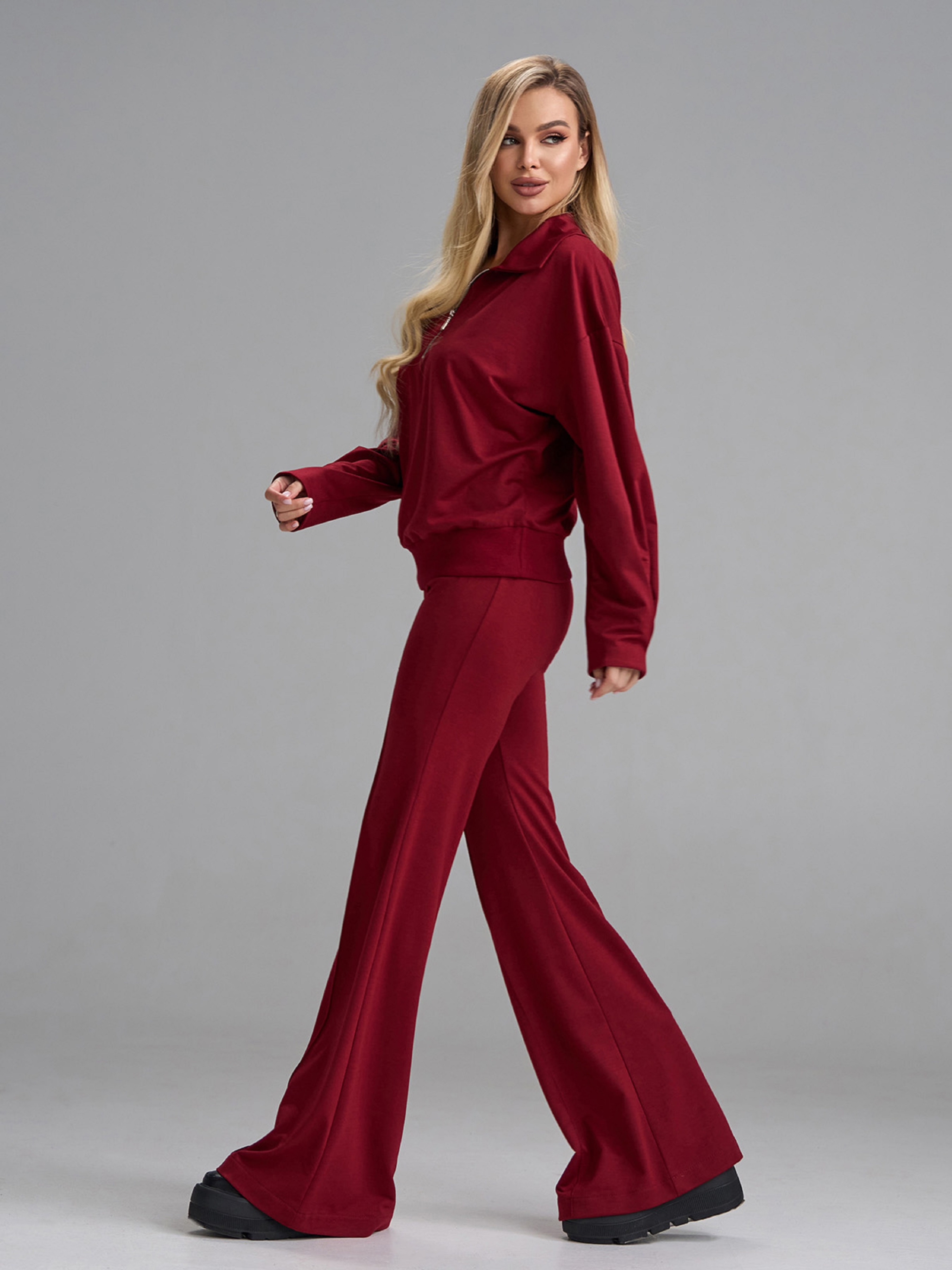Бордовый костюм двойка из двухнитного однотонного трикотажа. Толстовка с укороченной молнией и воротником оснащена длинными рукавами и манжетами. Брюки буткаты с поясной резинкой и стрелками. Полуобхват: Кофта: Грудь: S (57), M (59), L (61), XL (63), Длина изделия -58-62*, Рукав - 58, Брюки: Талия: S (32), M (34), L (36), XL (38), Бедра: S (45), M (47), L (49), XL (51), Длина изделия - 116, Длина по внутреннему шву - 88, Ткань: Низкой эластичности.
