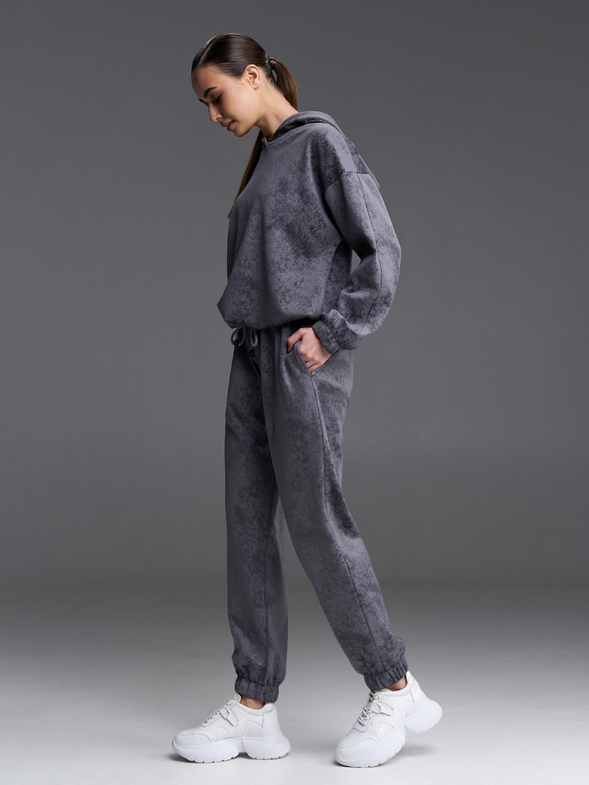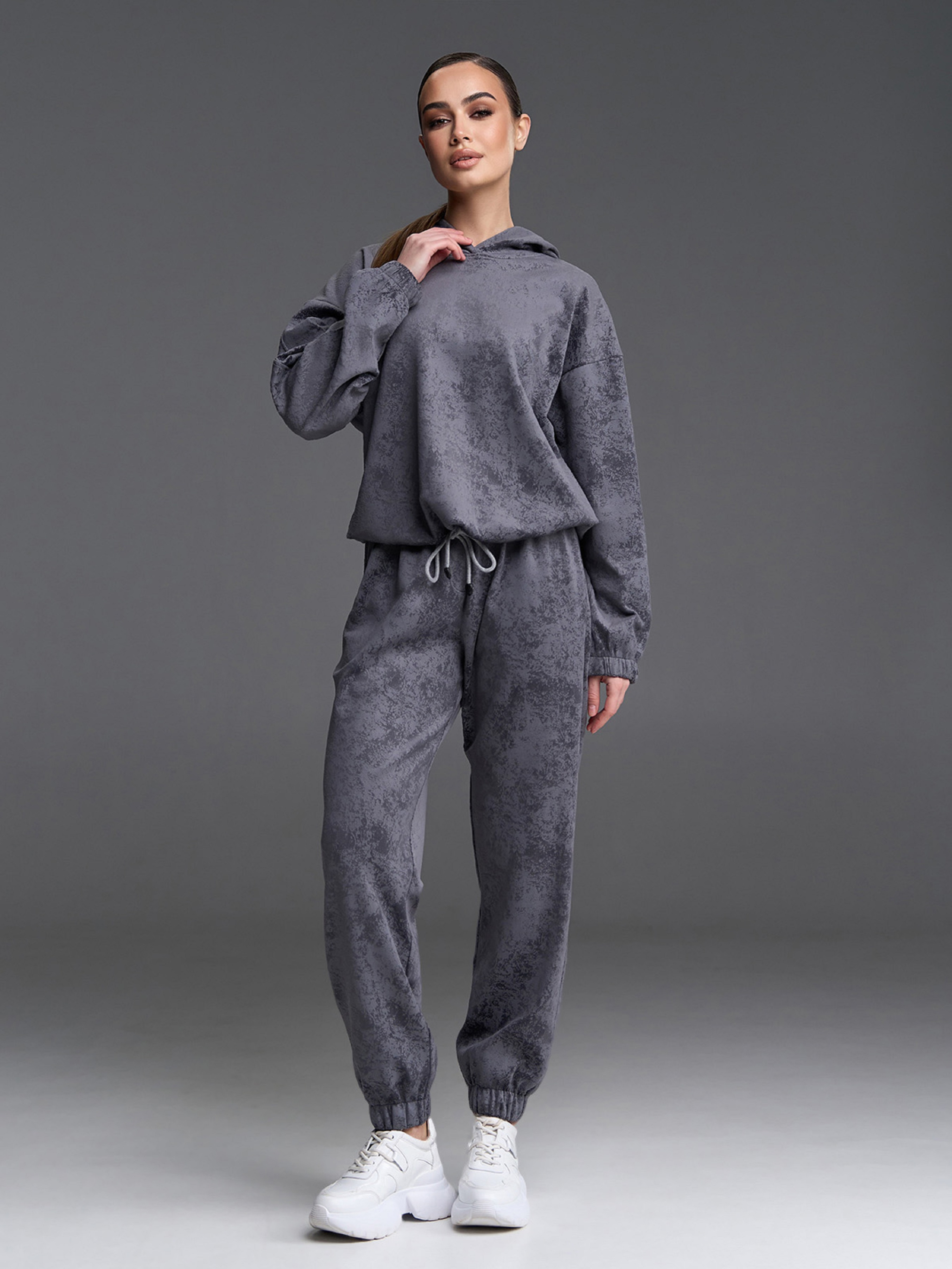 Демисезонный костюм из серого мраморного велюра с капюшоном и штанами джоггерами. Толстовка на кулиске с длинными рукавами и свободным кроем. Штаны на поясной и нижних резинках с карманами и высокой посадкой на талии. Полуобхват: Кофта: Грудь: S (57), M (59), L (61), XL (63), Длина изделия - 58, Рукав - 51, Брюки: Талия: S (32-40), M (34-42), L (36-44), XL (38-46), Бедра: S (56), M (58), L (60), XL (62), Длина изделия - 99, Длина по внутреннему шву - 71, Ткань: Высокой эластичности.
