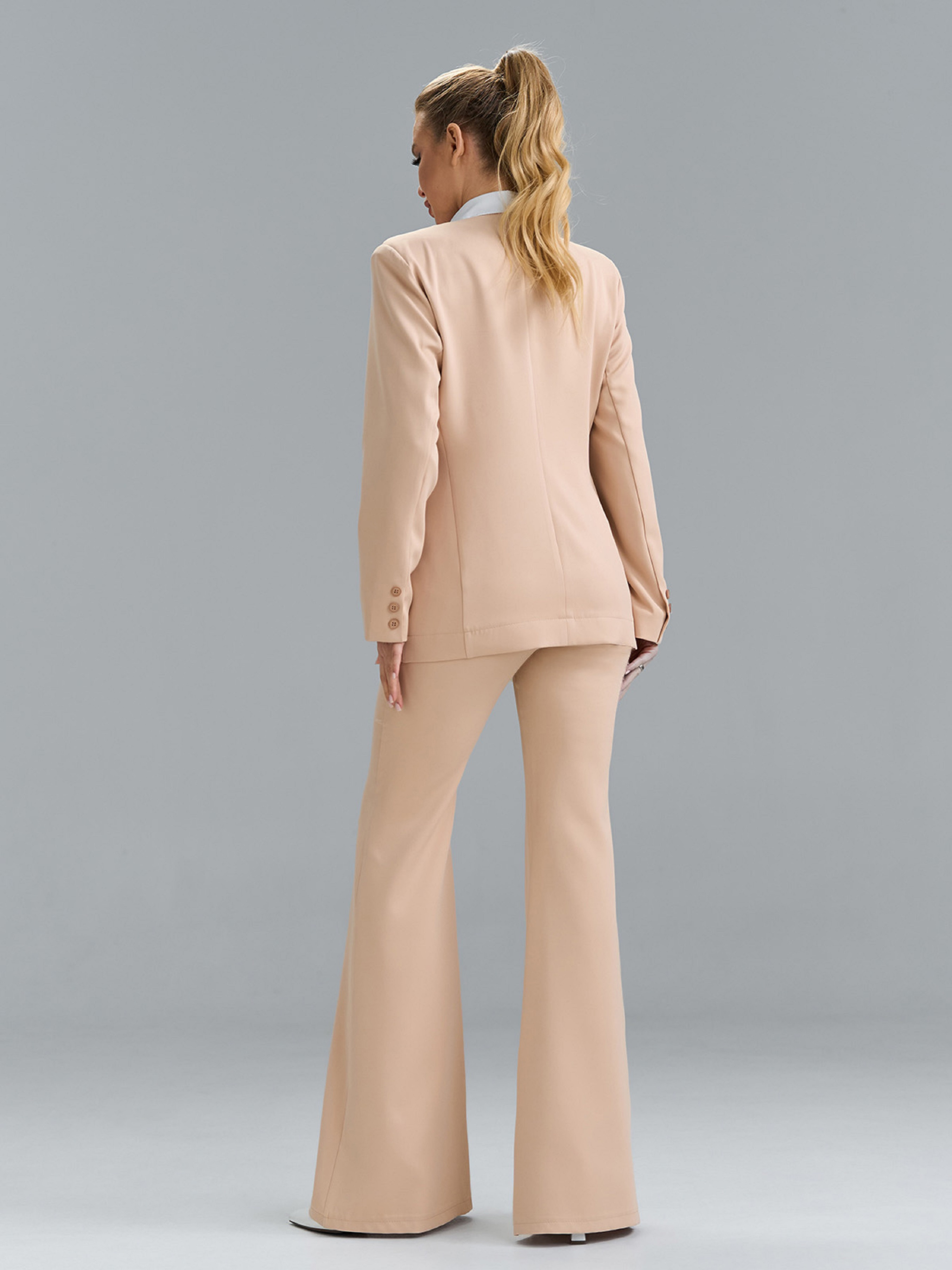 Бежевый костюм из костюмной ткани с приталенным жакетом с двумя рядами пуговиц. Жакет с V-образной горловиной и длинными рукавами с декоративными пуговицами. Брюки клеш от колена с застежками на пуговицу и молнию и резинкой сзади на поясе. Полуобхват: Кофта: Грудь: S (46), M (48), L (50), XL (52), Длина изделия - 72, Рукав - 60, Брюки: Талия: S (33), M (35), L (37), XL (39), Бедра: S (46), M (48), L (50), XL (52), Длина изделия - 112, Длина по внутреннему шву - 86, Ткань: Низкой эластичности