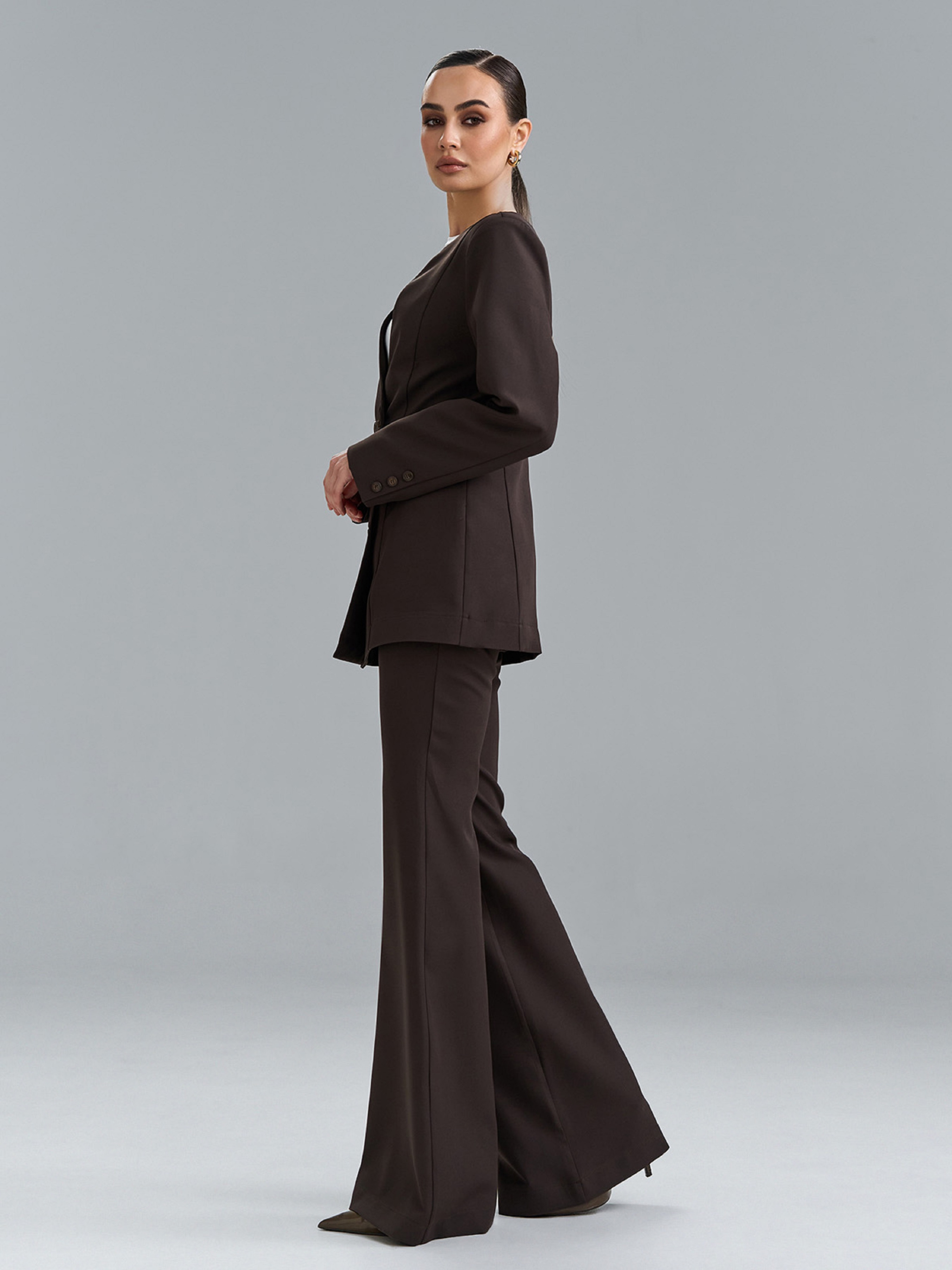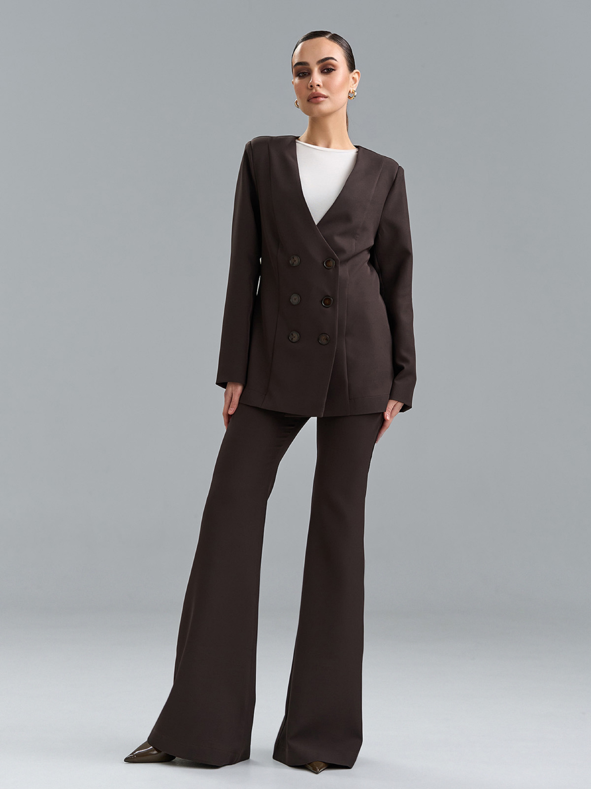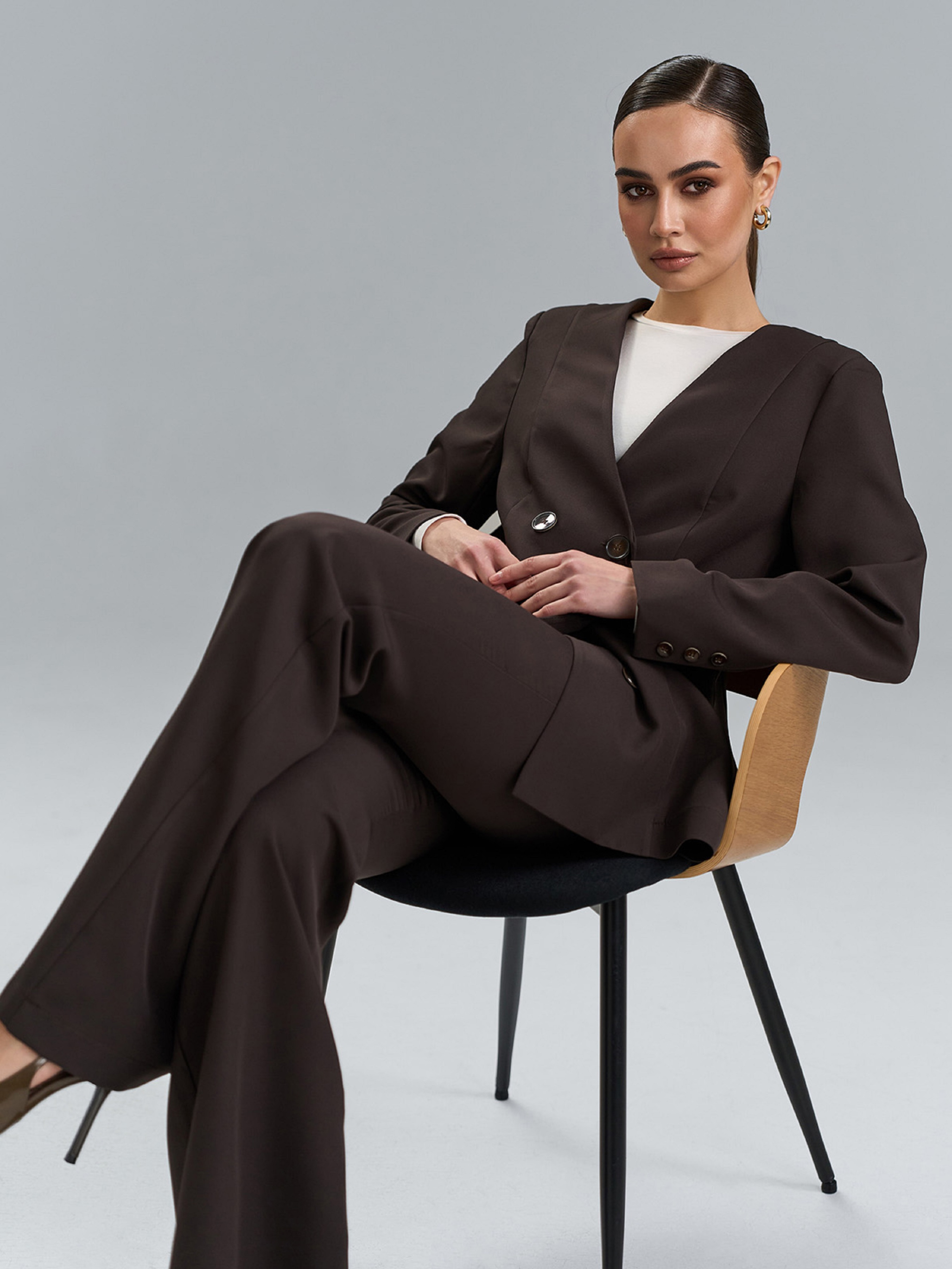 Темно-коричневый костюм двойка из костюмной ткани с приталенным жакетом на двух рядах пуговиц. Жакет с V-образной горловиной и длинными рукавами с декоративными пуговицами. Брюки фасона клеш от колена с застежками на пуговицу и молнию, сзади на поясе резинка. Полуобхват: Кофта: Грудь: S (46), M (48), L (50), XL (52), Длина изделия - 72, Рукав - 60, Брюки: Талия: S (33), M (35), L (37), XL (39), Бедра: S (46), M (48), L (50), XL (52), Длина изделия - 112, Длина по внутреннему шву - 86, Ткань: Низкой эластичности