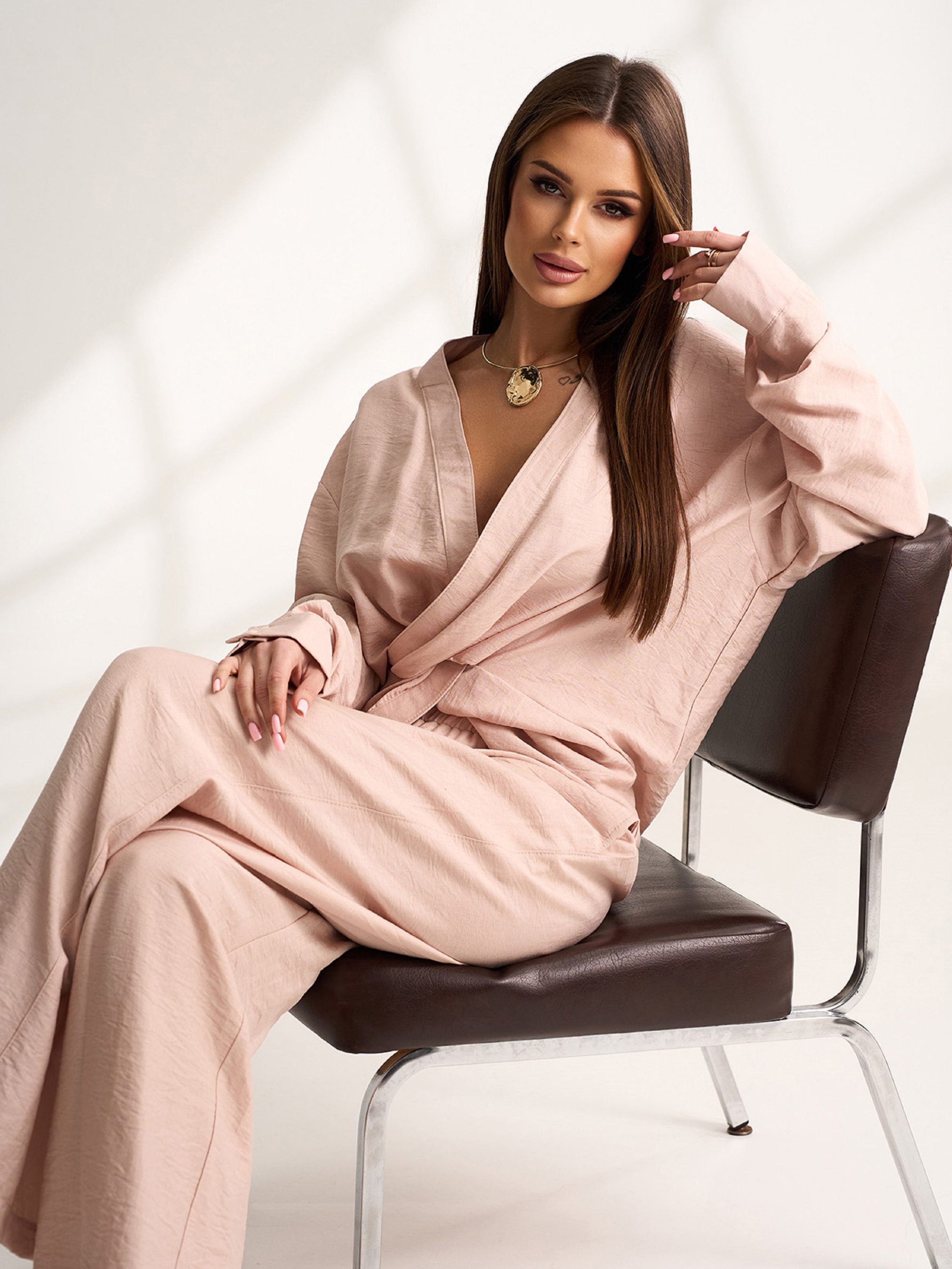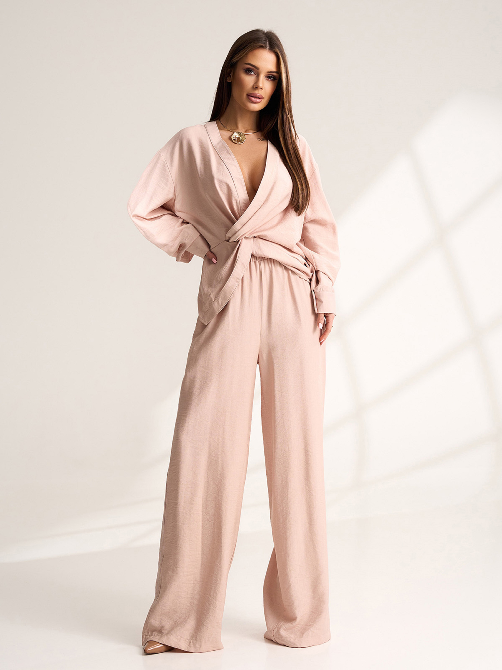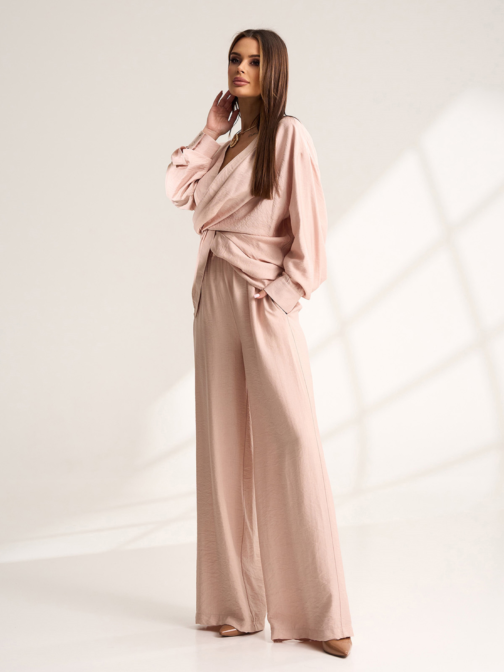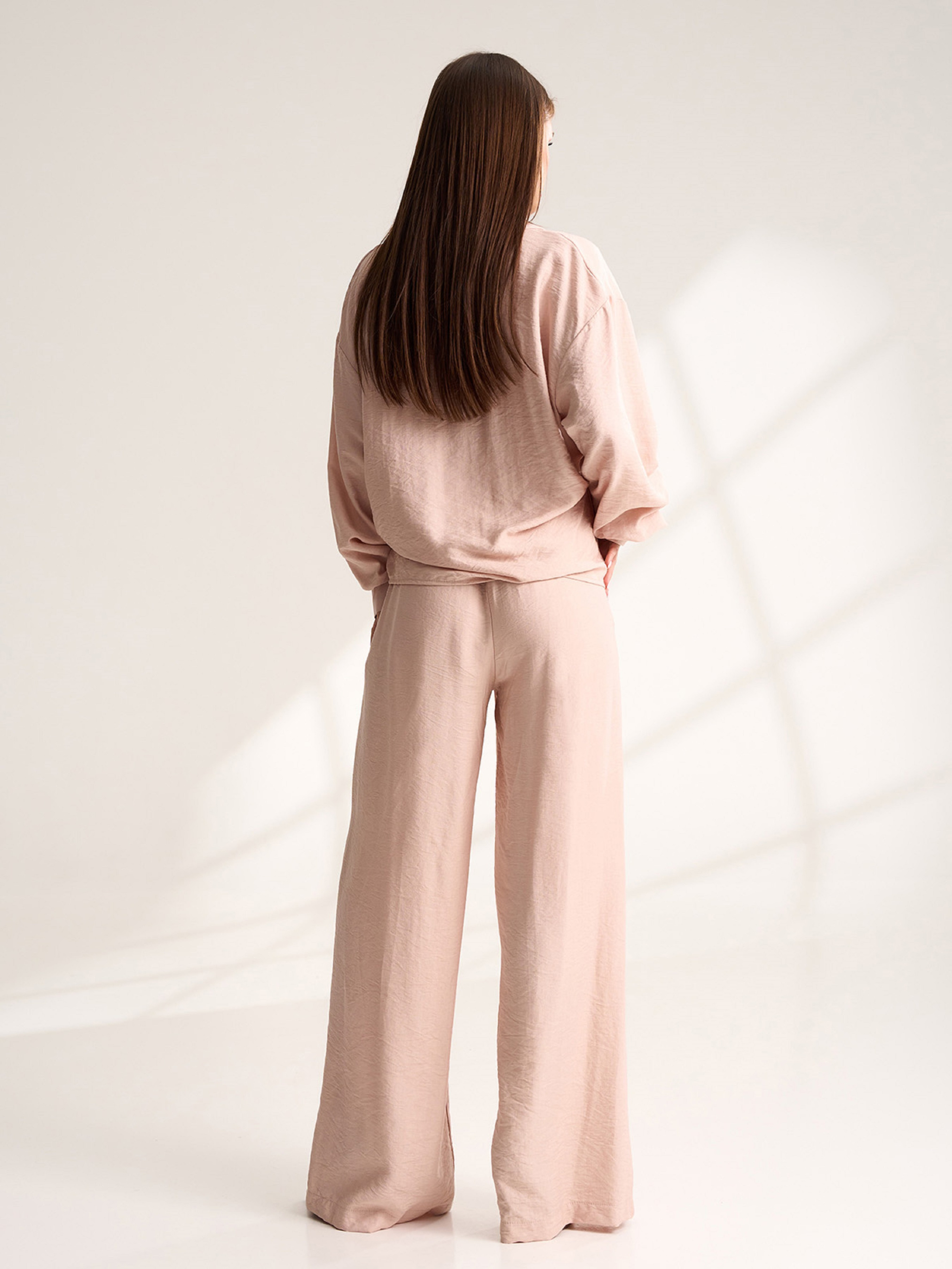 Брючний костюм із бежевого текстурованого льону. Блуза з декоративним елементом у вигляді драпірування, V-подібною горловиною та довгими рукавами на манжетах. Штани широкого крою з гумкою на поясі та кишенями. Напівобхват: Кофта: Груди: S (54), M (56), L (58), XL (60), Довжина виробу - 74, Рукав - 58, Штани: Талія: S (32-42), M (34-44), L (36-46), XL (38-48), Стегна: S (55), M (57), L (59), XL (61), Довжина виробу - 107, Довжина по внутрішньому шву - 76, Тканина: Низької еластичності.