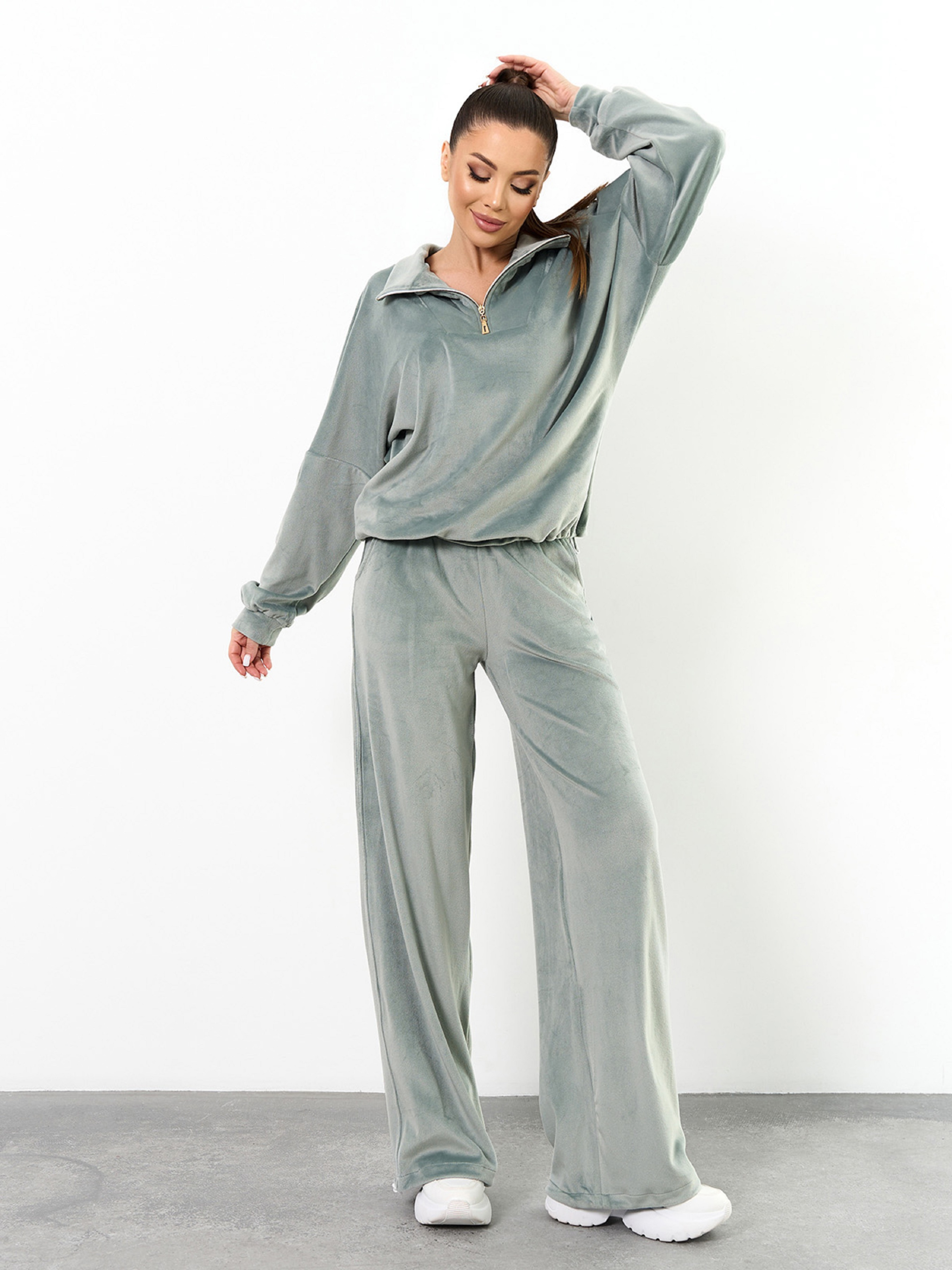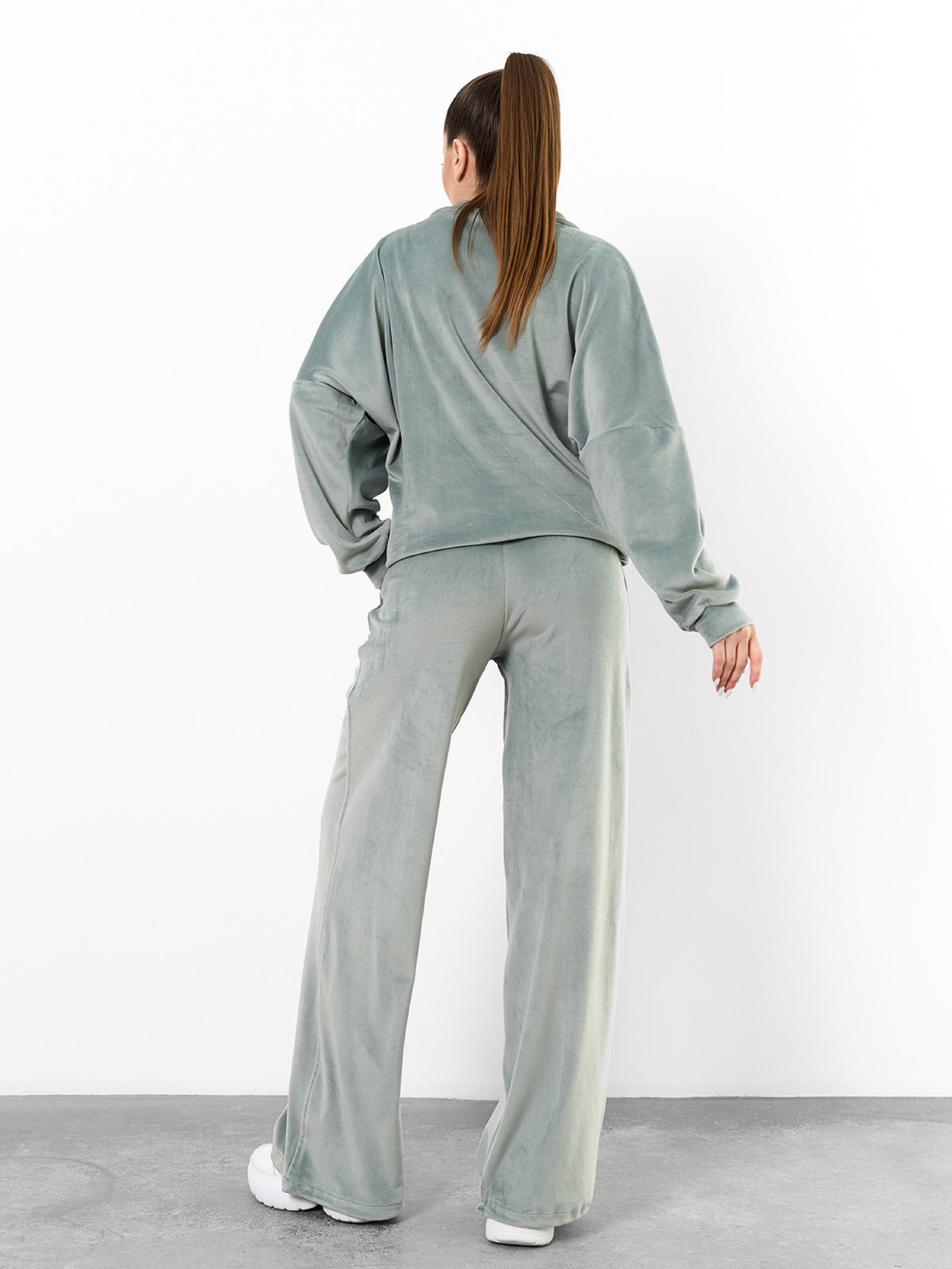 Молодіжний оверсайз костюм на затяжках, виготовлений з оливкового плюшевого велюру. Толстовка з довгими приспущеними з плечей рукавами, коміром-стійкою і блискавкою у горловини. Штани баггі широкого крою з поясною гумкою та кишенями. Напівобхват: Кофта: Груди: S (60), M (62), L (64), XL (66), Довжина виробу - 64, Рукав - 56, Штани: Талія: S (30-36), M (32-38), L (34-40), XL (36-42), Стегна: S (50), M (52), L (54), XL (56), Довжина виробу - 107, Довжина по внутрішньому шву - 80, Тканина: Високоїй еластичності