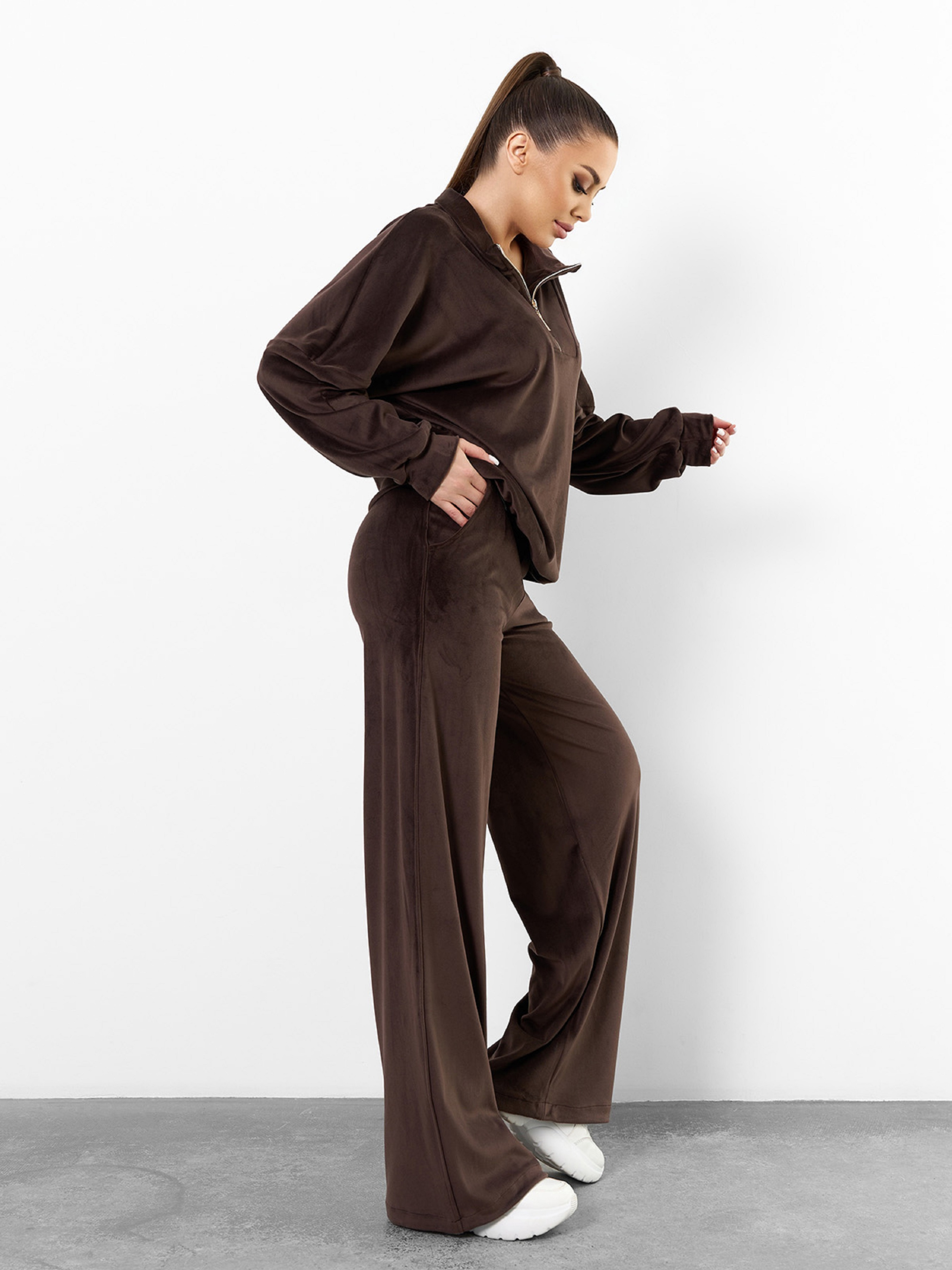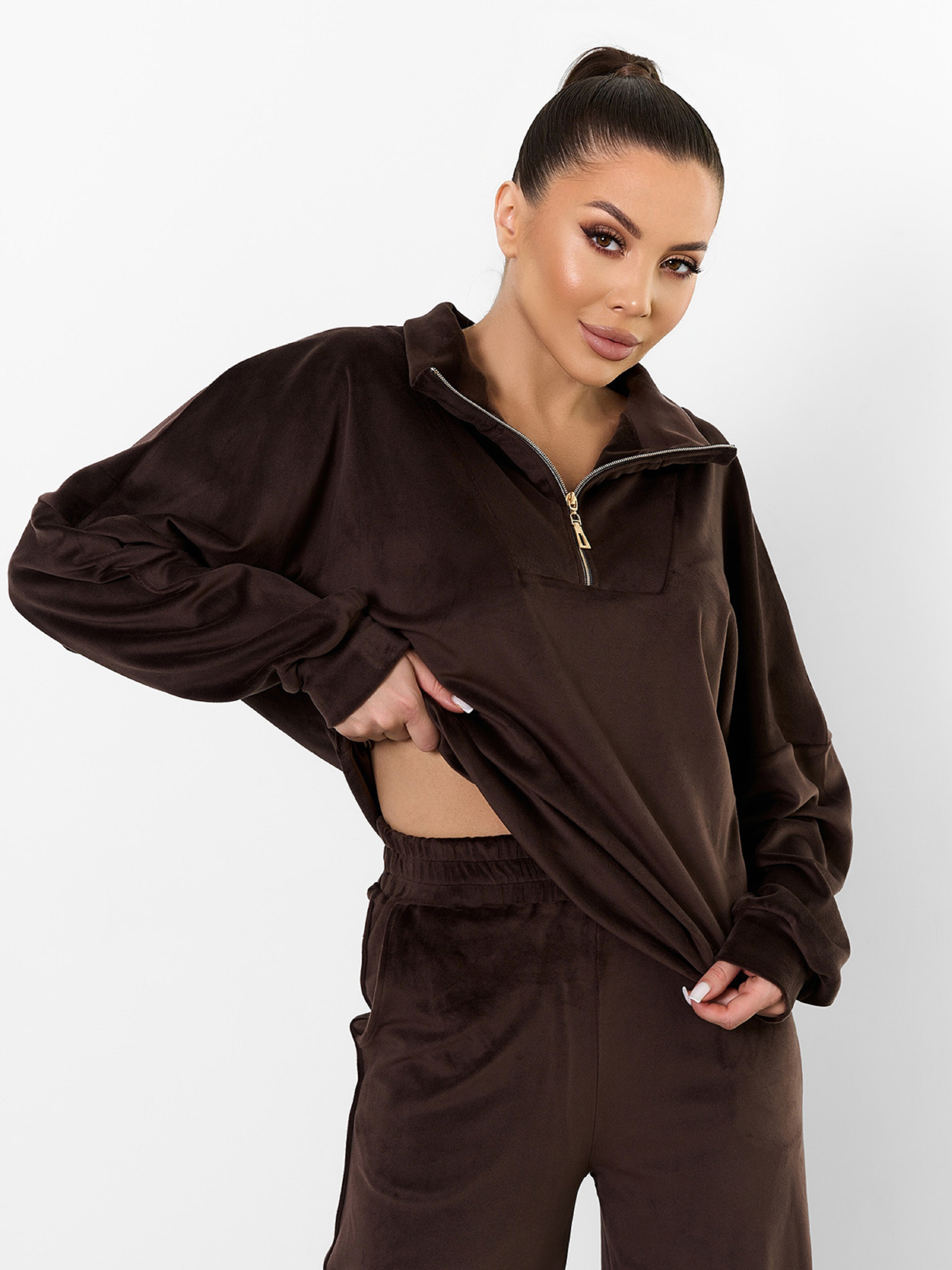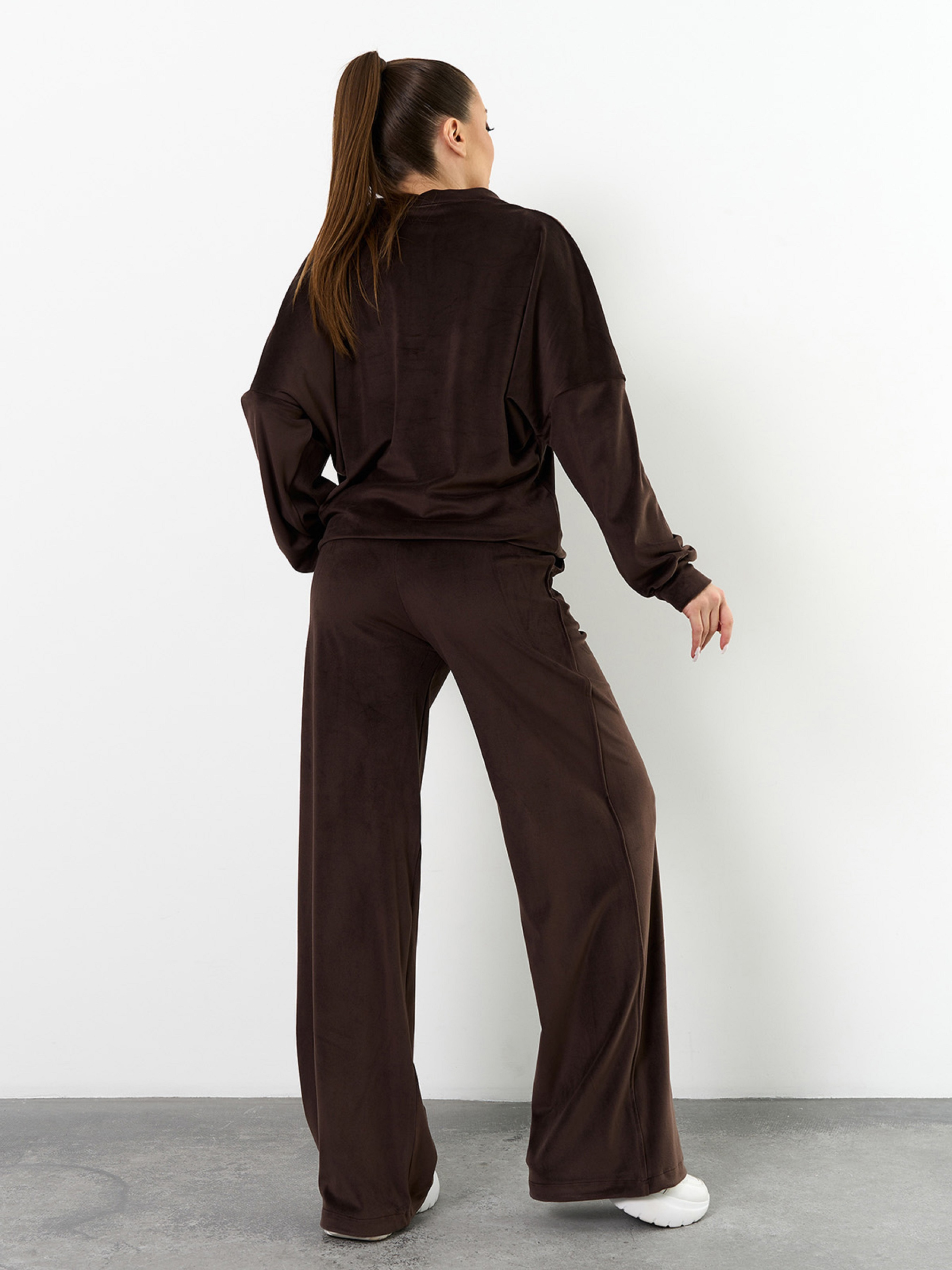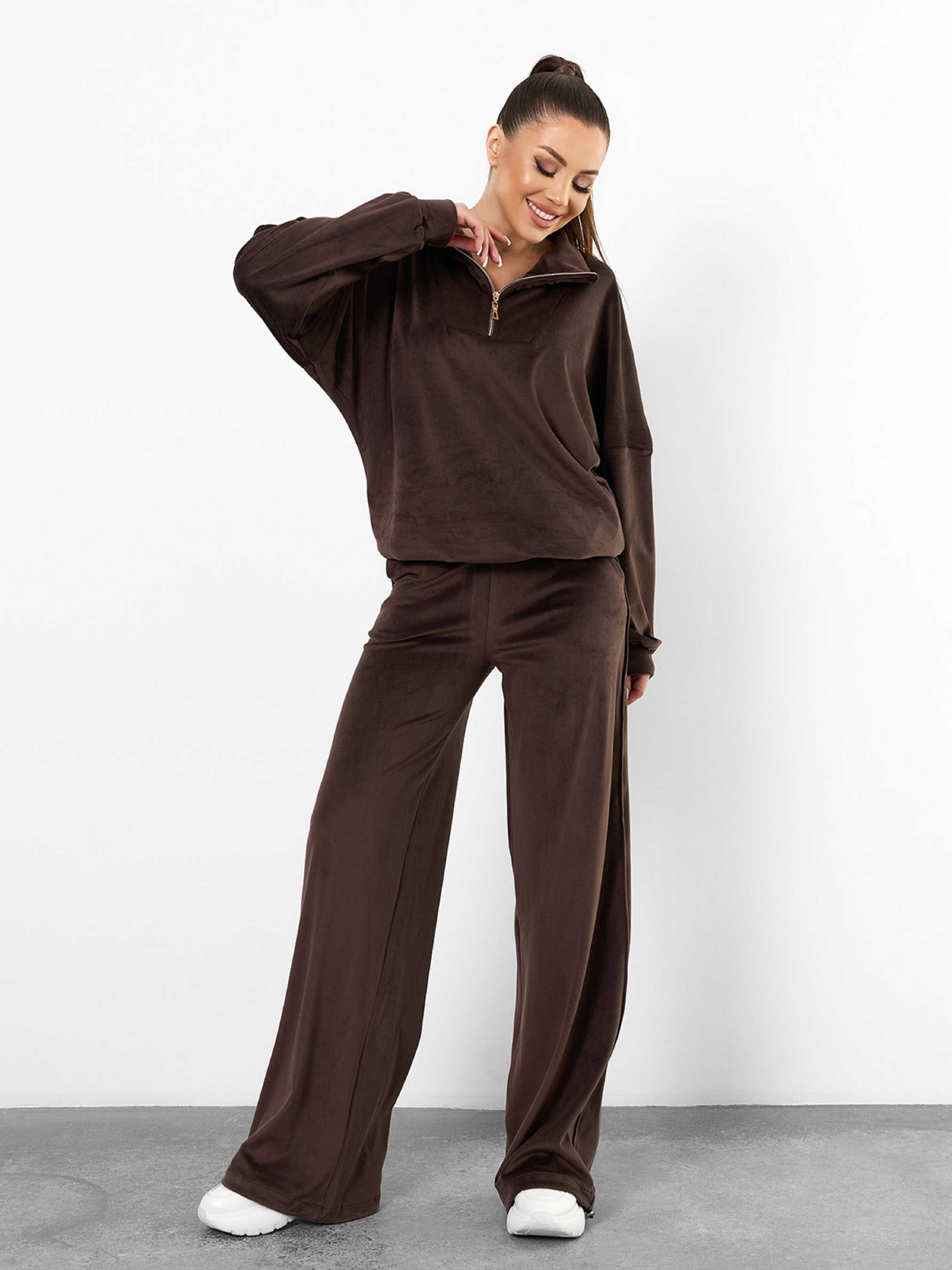 Темно-коричневий оверсайз костюм, виконаний з плюшевого велюру і декорований кулісками-затяжками. Толстовка з довгими приспущеними з пройм рукавами, коміром-стійкою і вкороченою блискавкою у горловини. Штани баггі широкого крою з поясною гумкою та кишенями. Напівобхват: Кофта: Груди: S (60), M (62), L (64), XL (66), Довжина виробу - 64, Рукав - 56, Штани: Талія: S (30-36), M (32-38), L (34-40), XL (36-42), Стегна: S (50), M (52), L (54), XL (56), Довжина виробу - 107, Довжина по внутрішньому шву - 80, Тканина: Високоїй еластичності