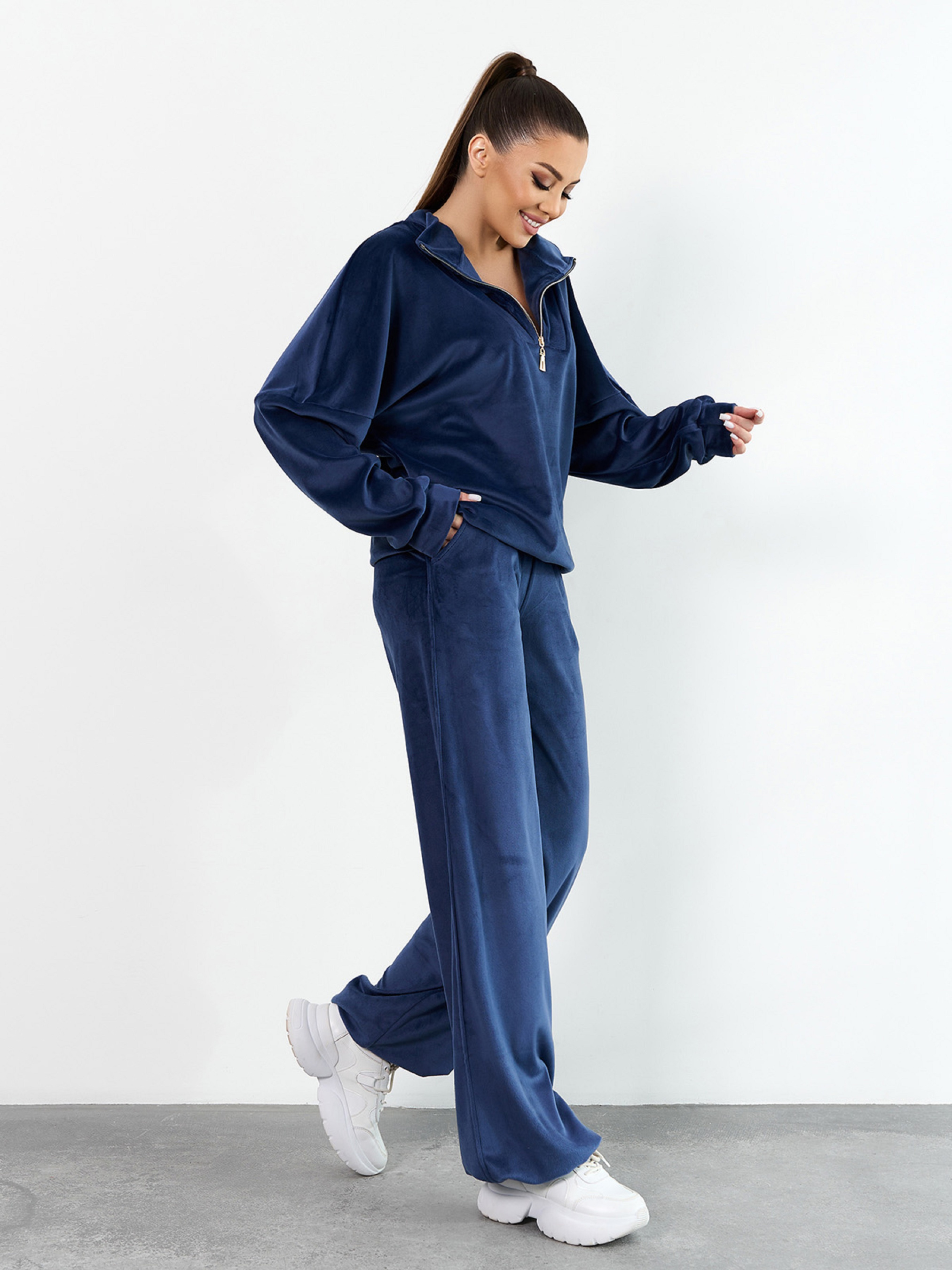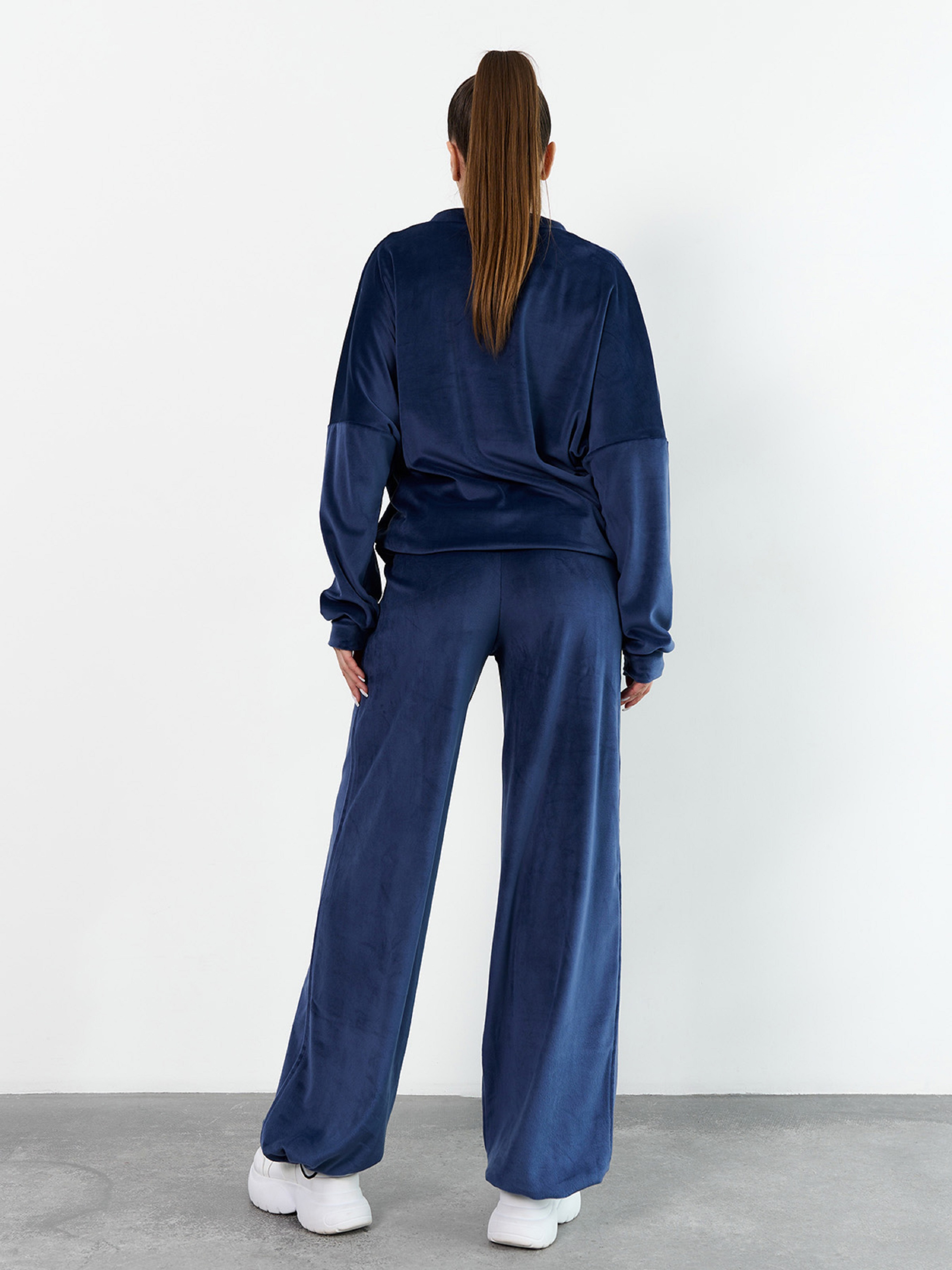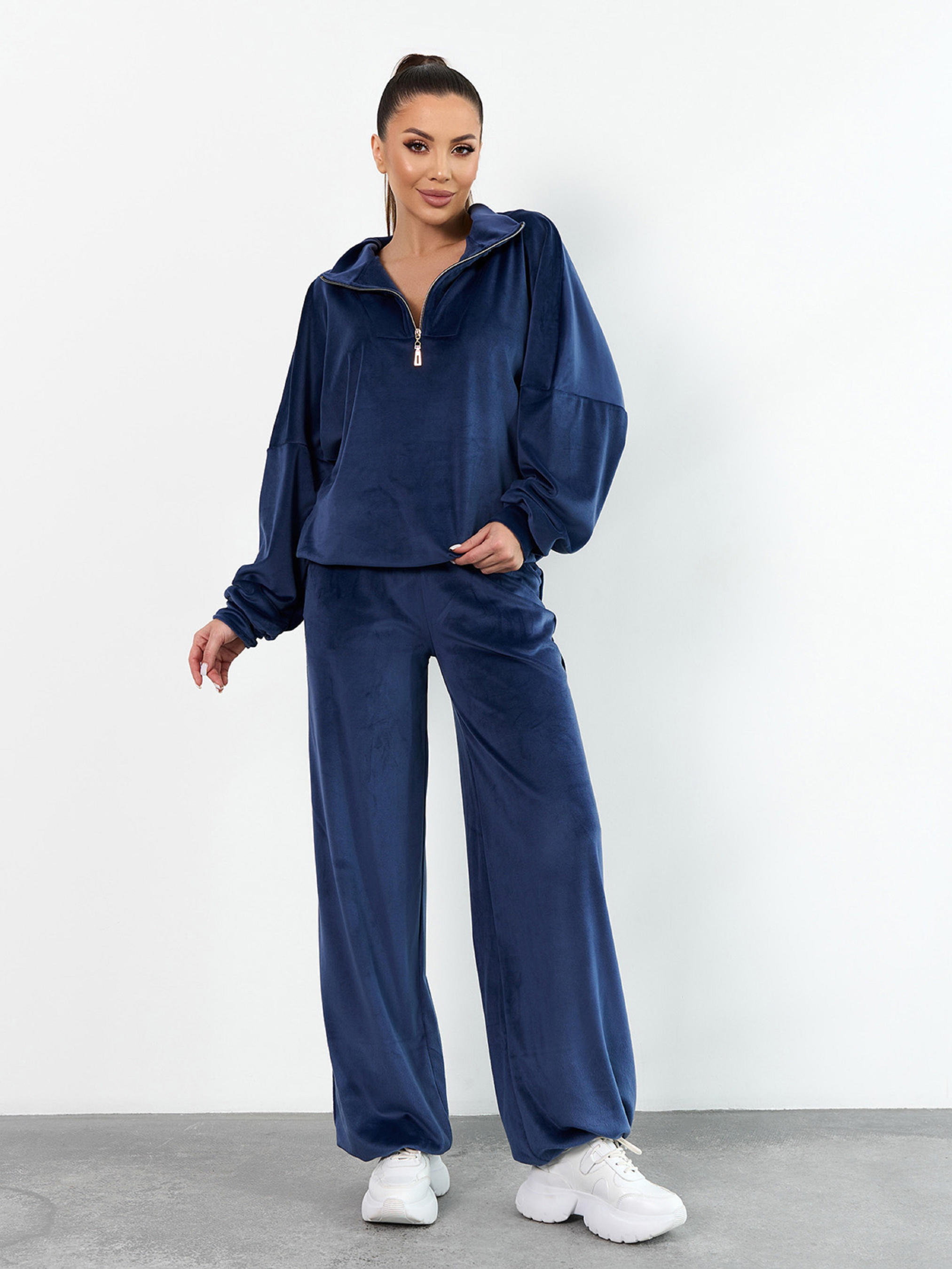 Синій костюм вільного крою, виконаний з плюшевого велюру і декорований кулісками-затяжками. Толстовка з довгими приспущеними з плечей рукавами, коміром-стійкою і блискавкою у горловини. Штани баггі широкого крою з поясною гумкою та кишенями. Напівобхват: Кофта: Груди: S (60), M (62), L (64), XL (66), Довжина виробу - 64, Рукав - 56, Штани: Талія: S (30-36), M (32-38), L (34-40), XL (36-42), Стегна: S (50), M (52), L (54), XL (56), Довжина виробу - 107, Довжина по внутрішньому шву - 80, Тканина: Високоїй еластичності