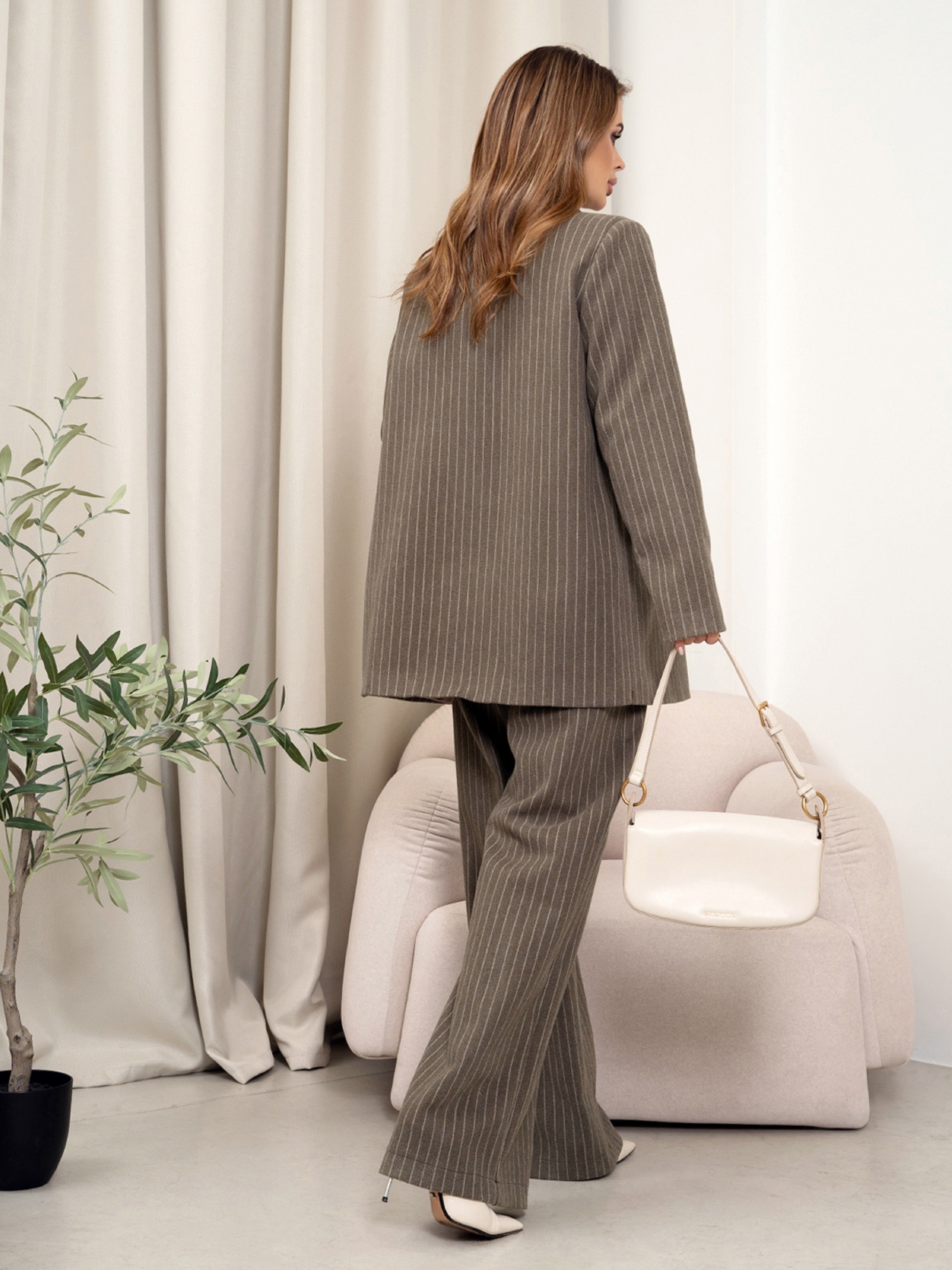 Вільний смугастий брючний костюм, виконаний з вовняної костюмки кольору хакі. Піджак на гудзику з нижньою підкладкою. Виріб прямого подовженого крою з довгими рукавами та кишенями. Штани з високою посадкою та широким прямим кроєм.Напівобхват: Піджак: Груди: S (51), M (53), L (55), XL (57), Довжина виробу - 72, Рукав - 60, Штани: Талія: S (33), M (35), L (37), XL (39), Стегна: S (56), M (58), L (60), XL (62), Довжина виробу - 108, Довжина по внутрішньому шву - 76, Тканина: Низька еластичність.