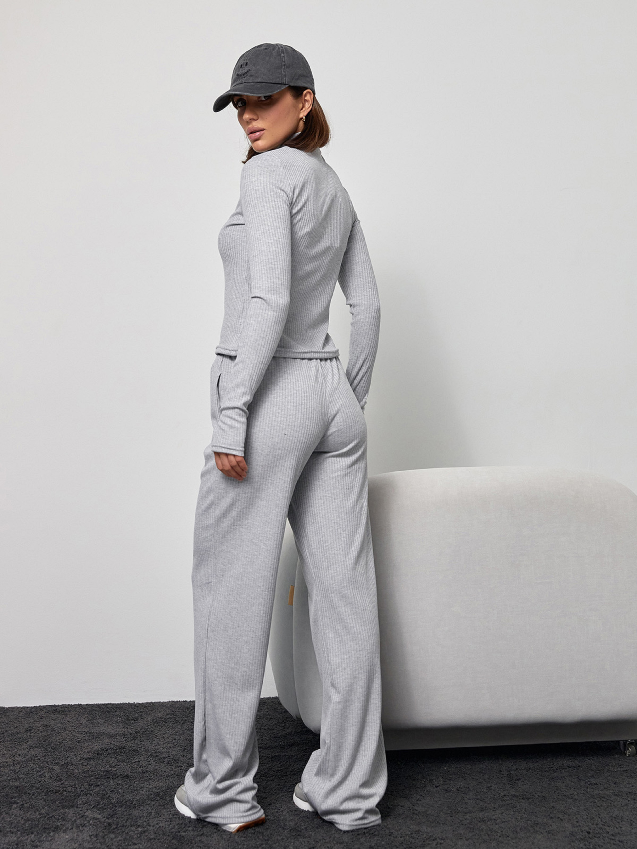 Світло-сірий костюм із трикотажного рубчика з вирізами для пальців, основною та декоративною блискавками. Толстовка прямого облягаючого крою з коміром-стійкою та довгими рукавами. Штани на гумці з широким вільним кроєм та кишенями.Напівобхват: Кофта: Груди: S (41), M (43), L (45), XL (47), Довжина виробу - 53, Рукав - 68, Штани: Талія: S (30-38), M (32- 40), L (34-42), XL (36-44), Стегна: S (54), M (56), L (58), XL (60), Довжина виробу - 110, Довжина по внутрішньому шву - 88 , Тканина: Висока еластичність