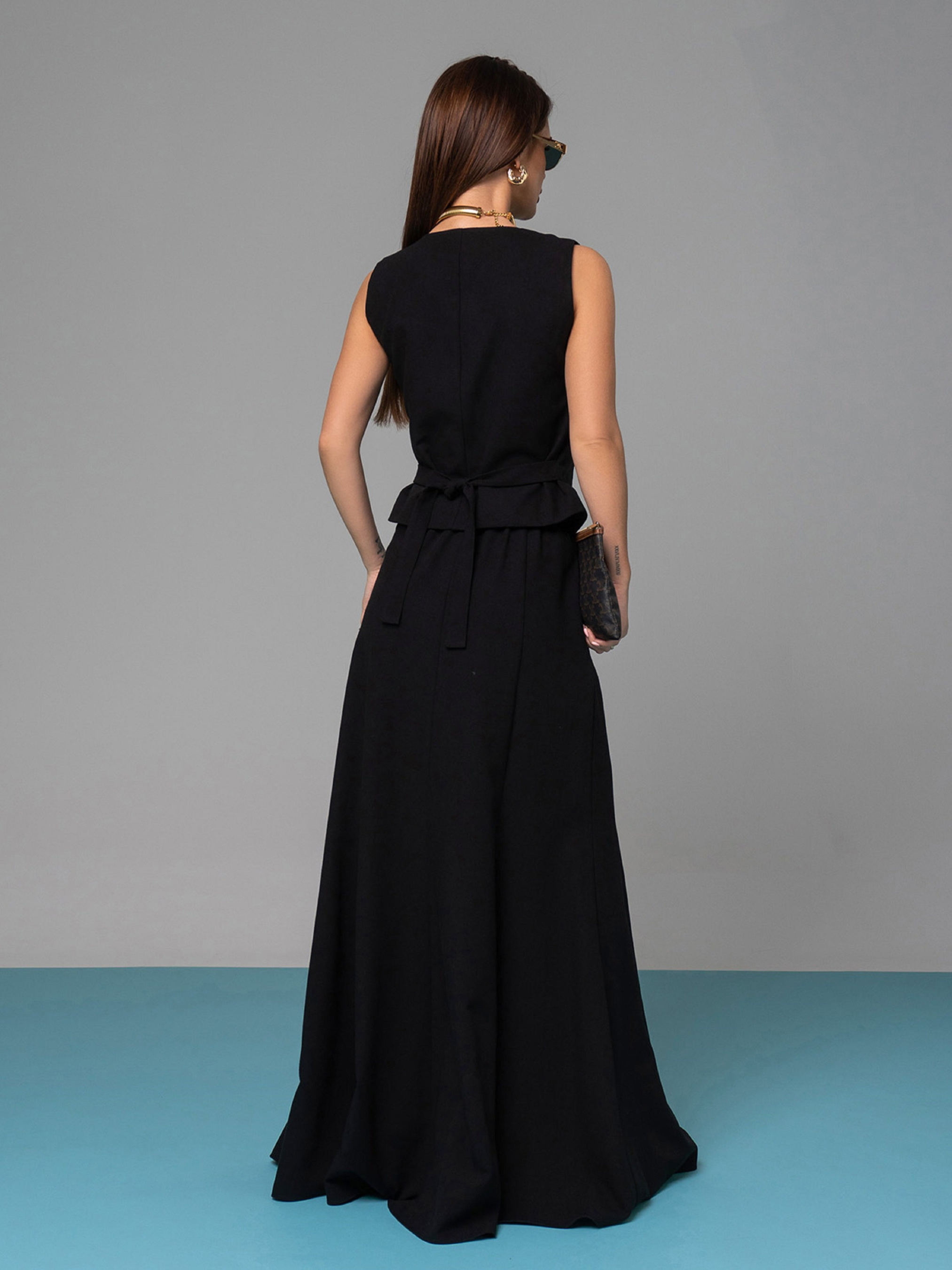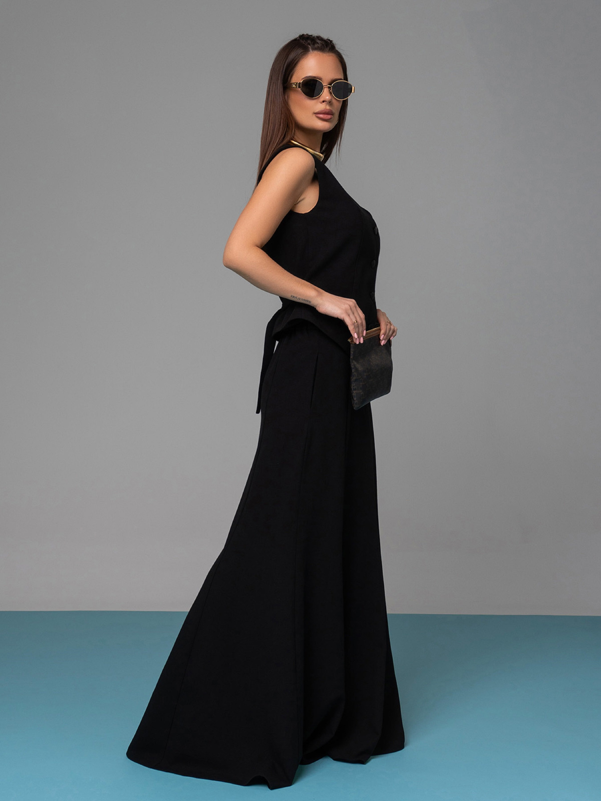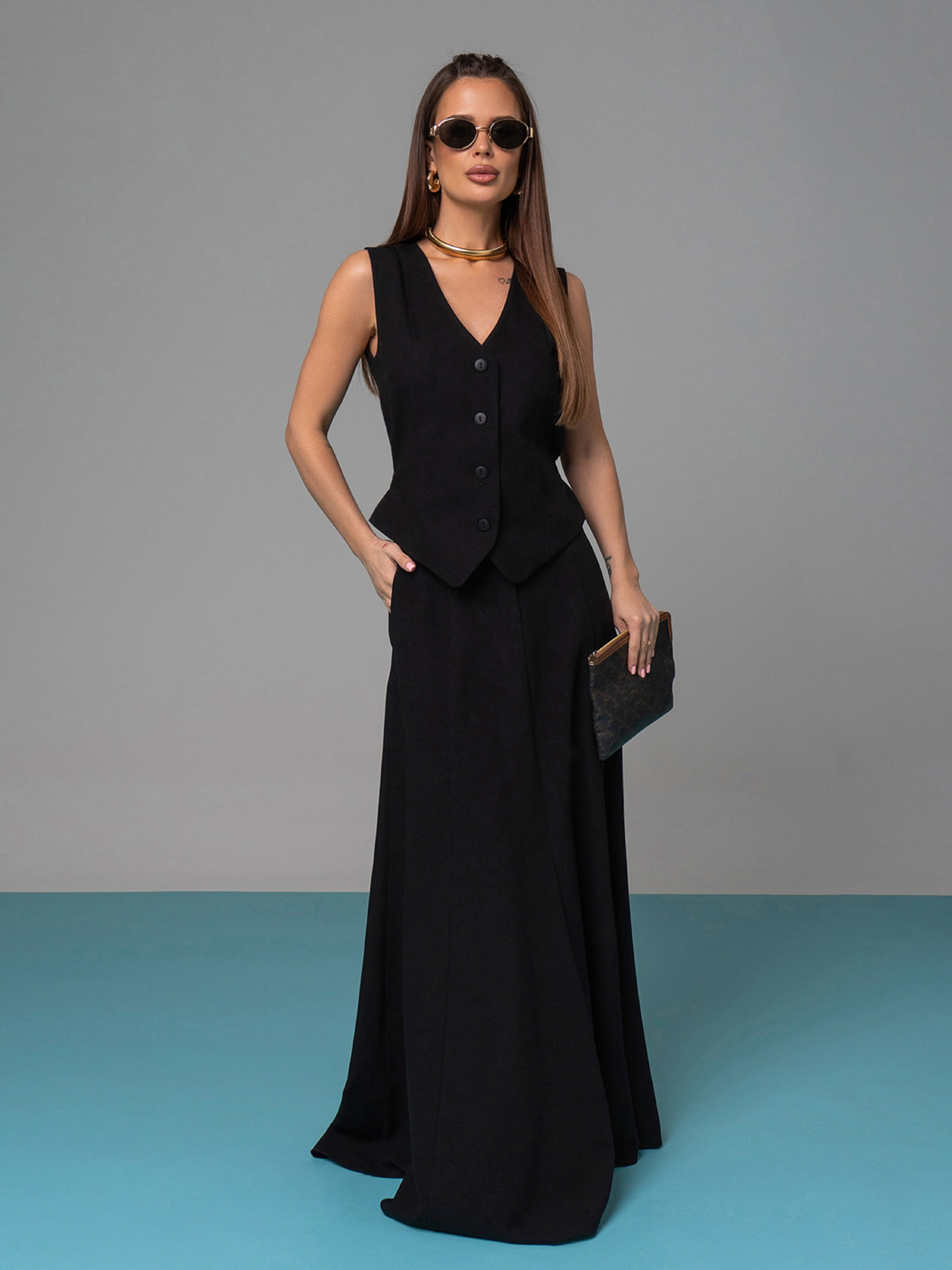 Льняний костюм чорного кольору з довгою спідницею кльош. Жилет на ґудзиках без нижньої підкладки із зав'язкою ззаду. Жилет без рукавів із V-подібною горловиною. Спідниця на гудзику та блискавці оснащена гумкою ззаду на поясі та кишенями.