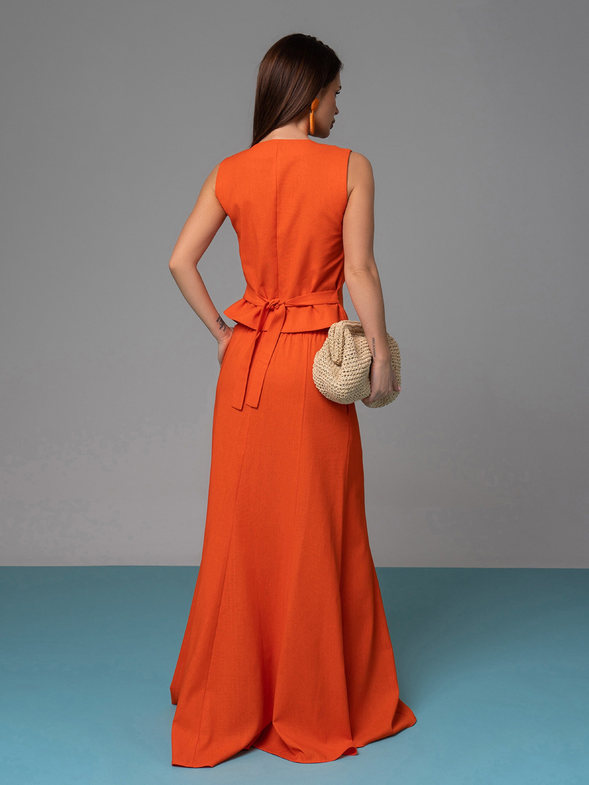 Помаранчевий лляний костюм з довгою спідницею кльош та жилетом. Жилет на ґудзиках без нижньої підкладки із зав'язкою ззаду. Модель без рукавів із V-подібною горловиною. Спідниця на гудзику та блискавці оснащена гумкою ззаду на поясі та кишенями. Напівобхват: Жилет: Груди: S (43), M (45), L (47), XL (49), Довжина виробу - 55, Спідниця: Талія: S (34), M (36), L (38), XL (40), Стегна: S (52), M (54), L (56), XL (58), Довжина виробу - 108 Тканина: Низька еластичність.