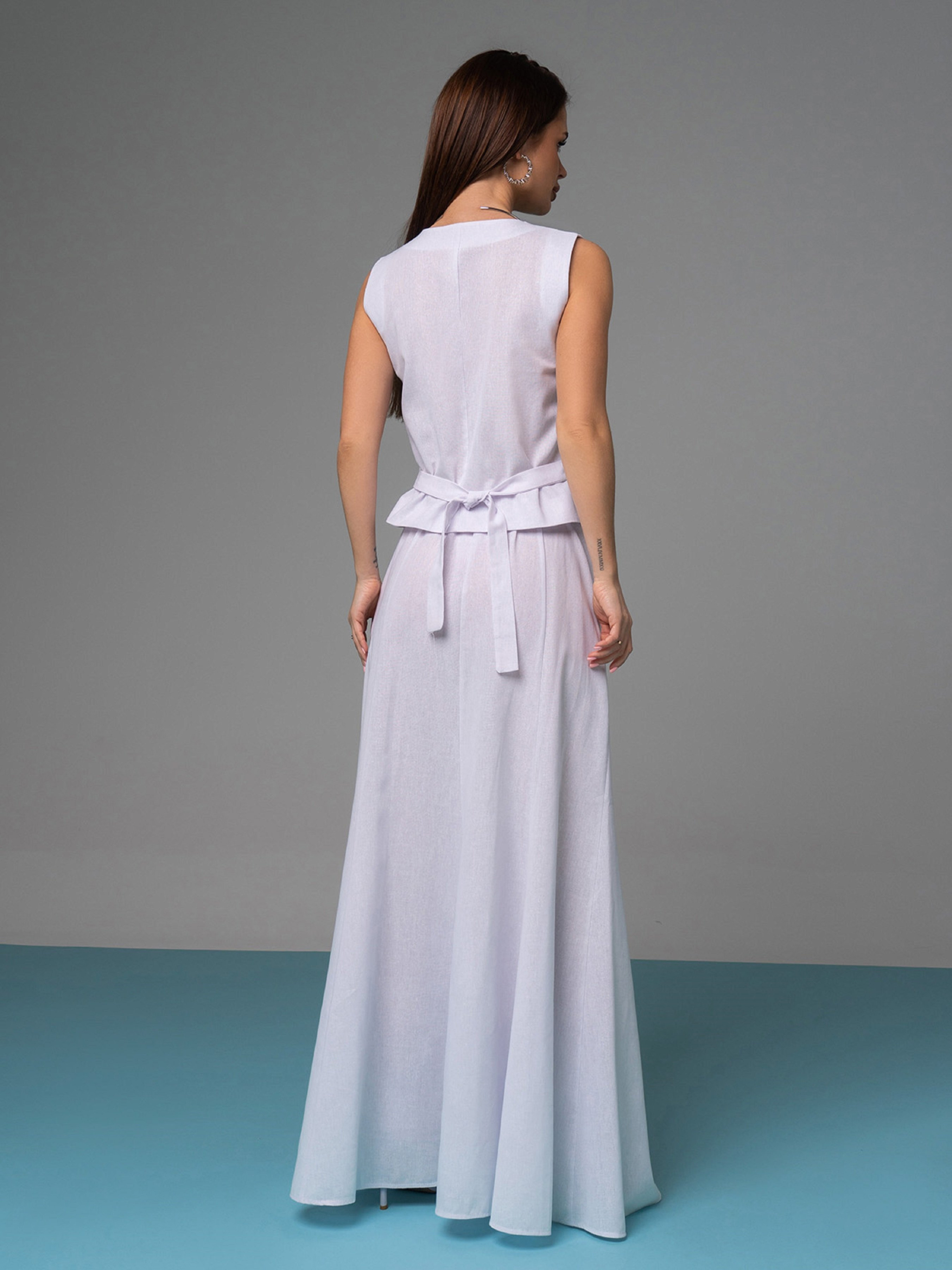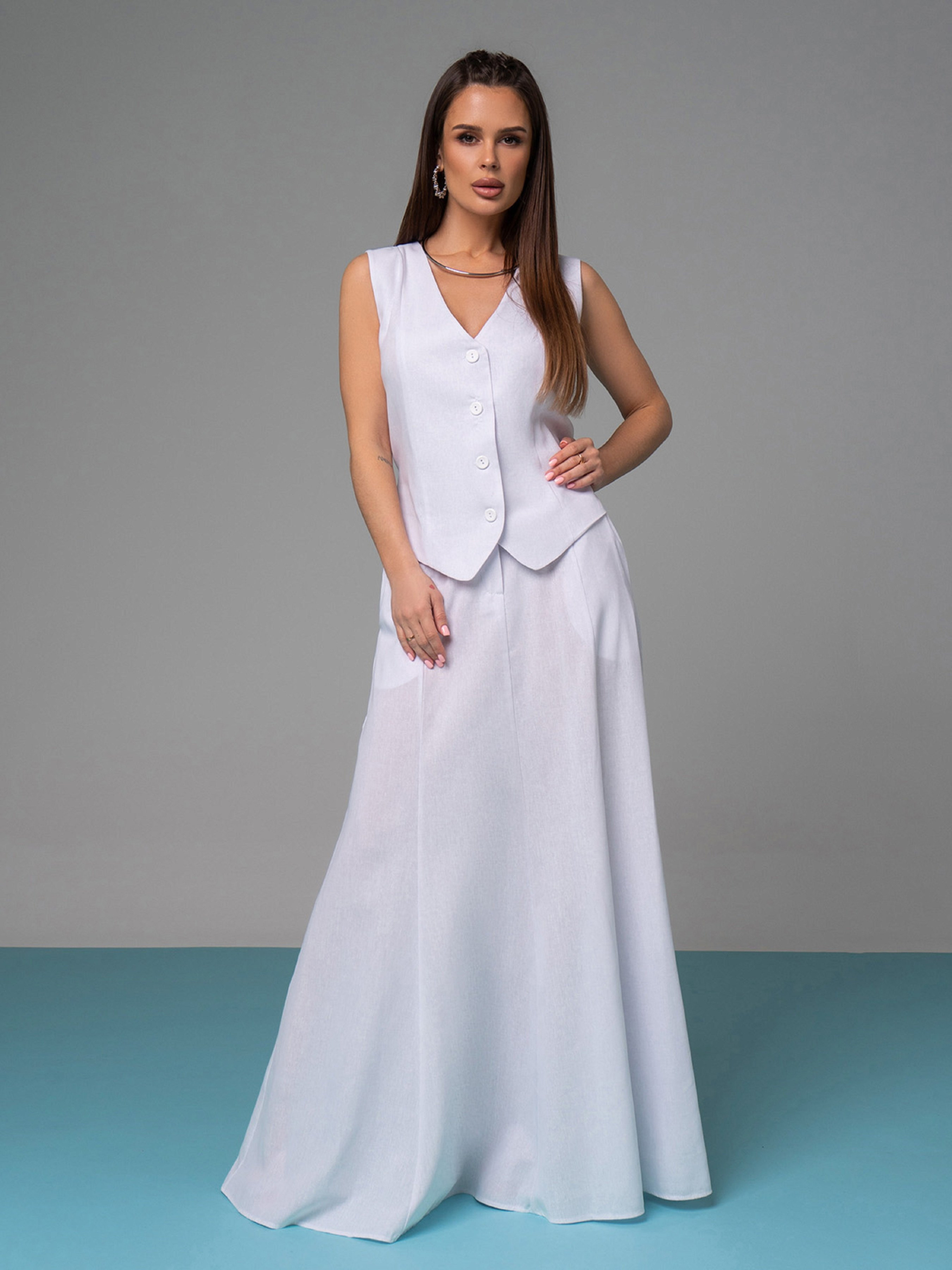 Білий лляний костюм з довгою спідницею та жилетом. Жилет на ґудзиках без нижньої підкладки із зав'язкою ззаду. Модель без рукавів із V-подібною горловиною. Спідниця з розкльошеним кроєм та кишенями. Модель на блискавці та гудзику оснащена невеликою гумкою на спинці. Напівобхват: Жилет: Груди: S (43), M (45), L (47), XL (49), Довжина виробу - 55, Спідниця: Талія: S (34), M (36), L (38), XL (40), Стегна: S (52), M (54), L (56), XL (58), Довжина виробу - 108 Тканина: Низька еластичність.