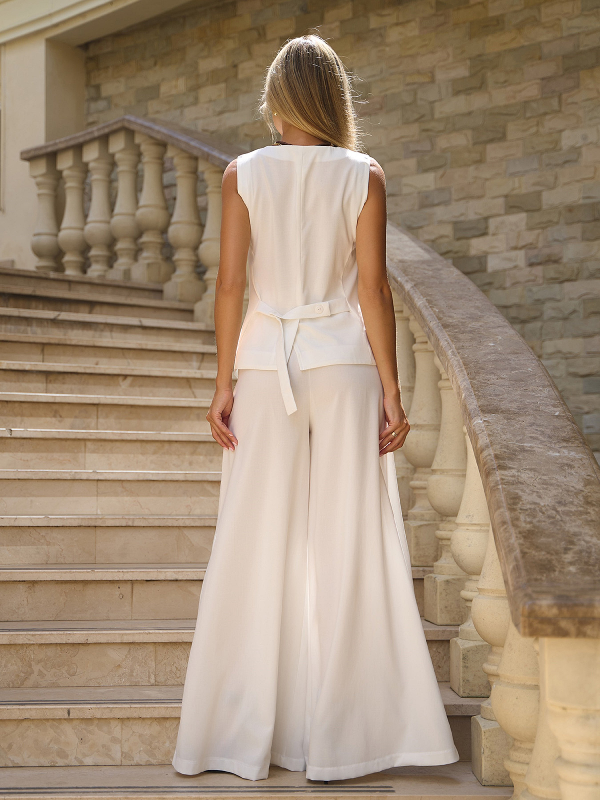 Брючний білий костюм із жилеткою на гудзиках, виконаний з однотонного льону. Жилетка без рукавів з V-подібною горловиною та зав'язкою ззаду. Штани палаццо на блискавці із задньою еластичною поясною гумкою та кишенями. Модель високої посадки з вільним кроєм, що розкльошує. Напівобхват: Жилет: Груди: S (46), M (48), L (50), XL (52), XXL (54), 3XL (56); Довжина виробу - 65-67*. Брюки: Талія: S (32), M (34), L (36), XL (39), XXL (41), 3XL (43); Стегна: S (52), M (54), L (56), XL (58), XXL (59), 3XL (60); Довжина виробу - 108-110*; Довжина по внутрішньому шву - 78-81*. Тканина: Низької еластичності.