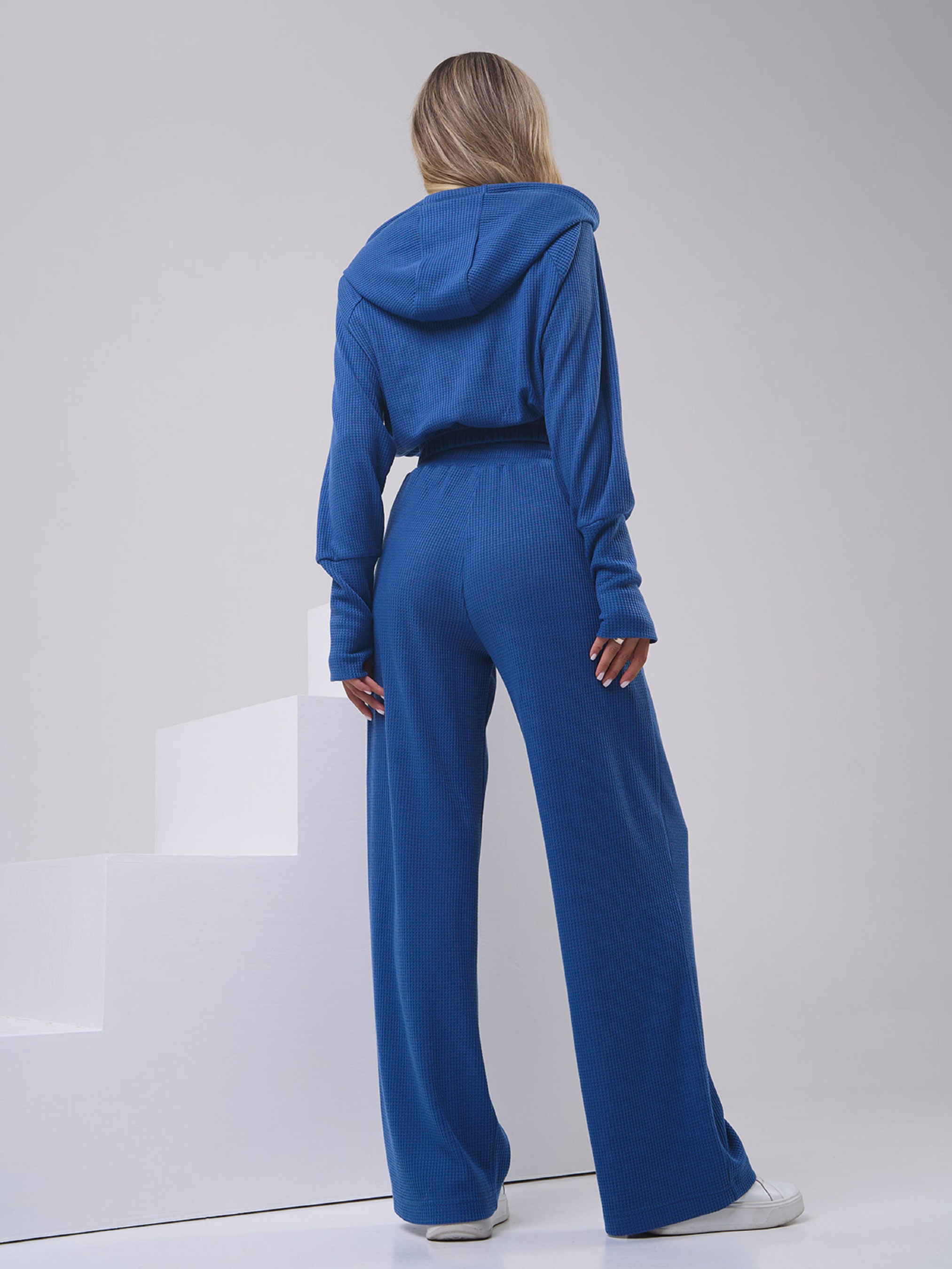 Синій молодіжний костюм із фактурного трикотажу з укороченою толстовкою на манжетах. Толстовка-худі на блискавці з довгими рукавами та захисним капюшоном. Високі штани з еластичною гумкою на талії, кишенями та широким прямим кроєм. Манжети толстовки з вирізами для великих пальців. Напівобхват: Кофта: Груди: S (49), M (51), L (53), XL (55), Довжина виробу - 46, Рукав - 58, Штани: Талія: S (30-40), M (32- 42), L (34-44), XL (36-46), Стегна: S (52), M (54), L (56), XL (58), Довжина виробу - 102, Довжина по внутрішньому шву - 73 , Тканина: Висока еластичність