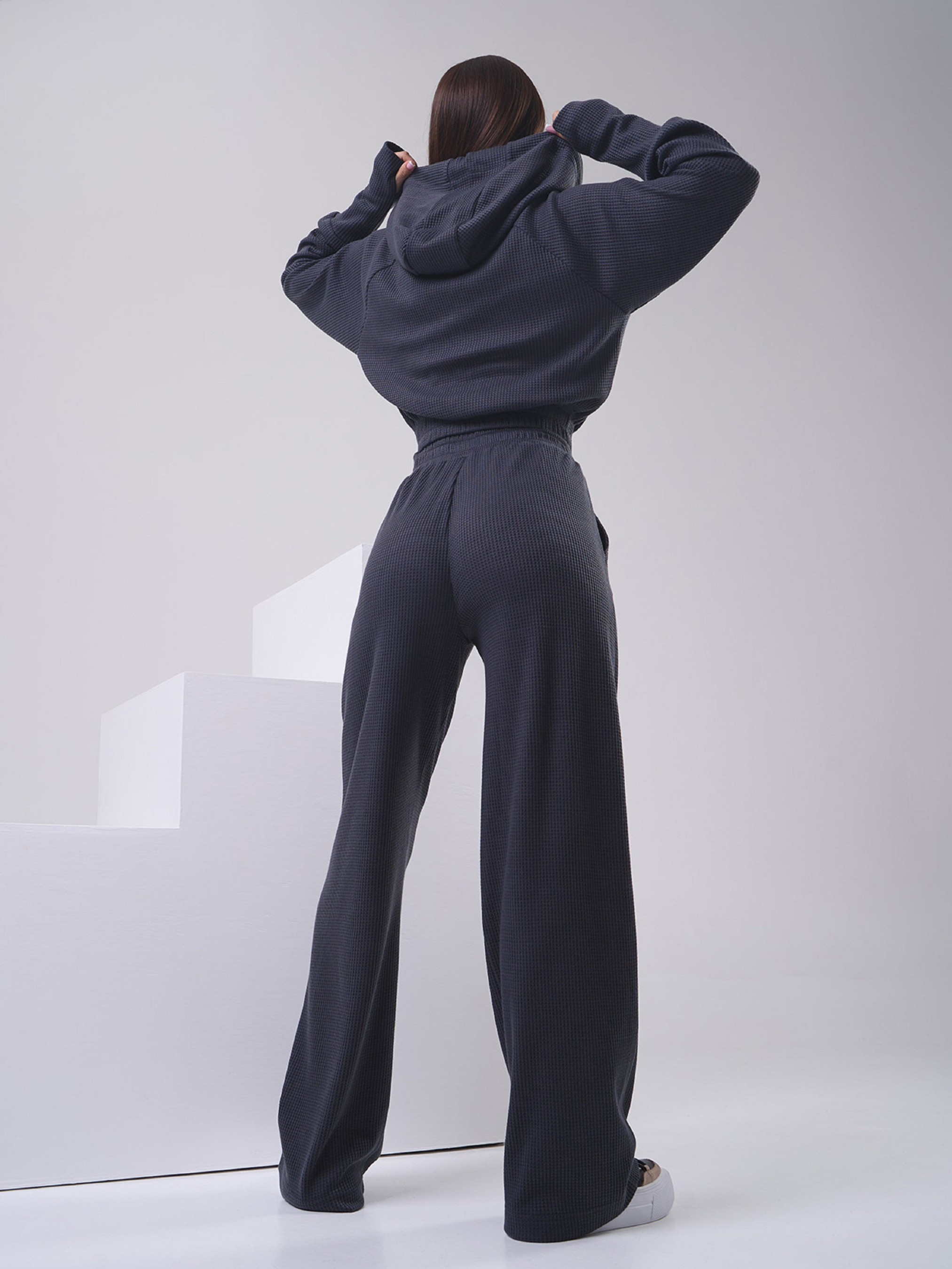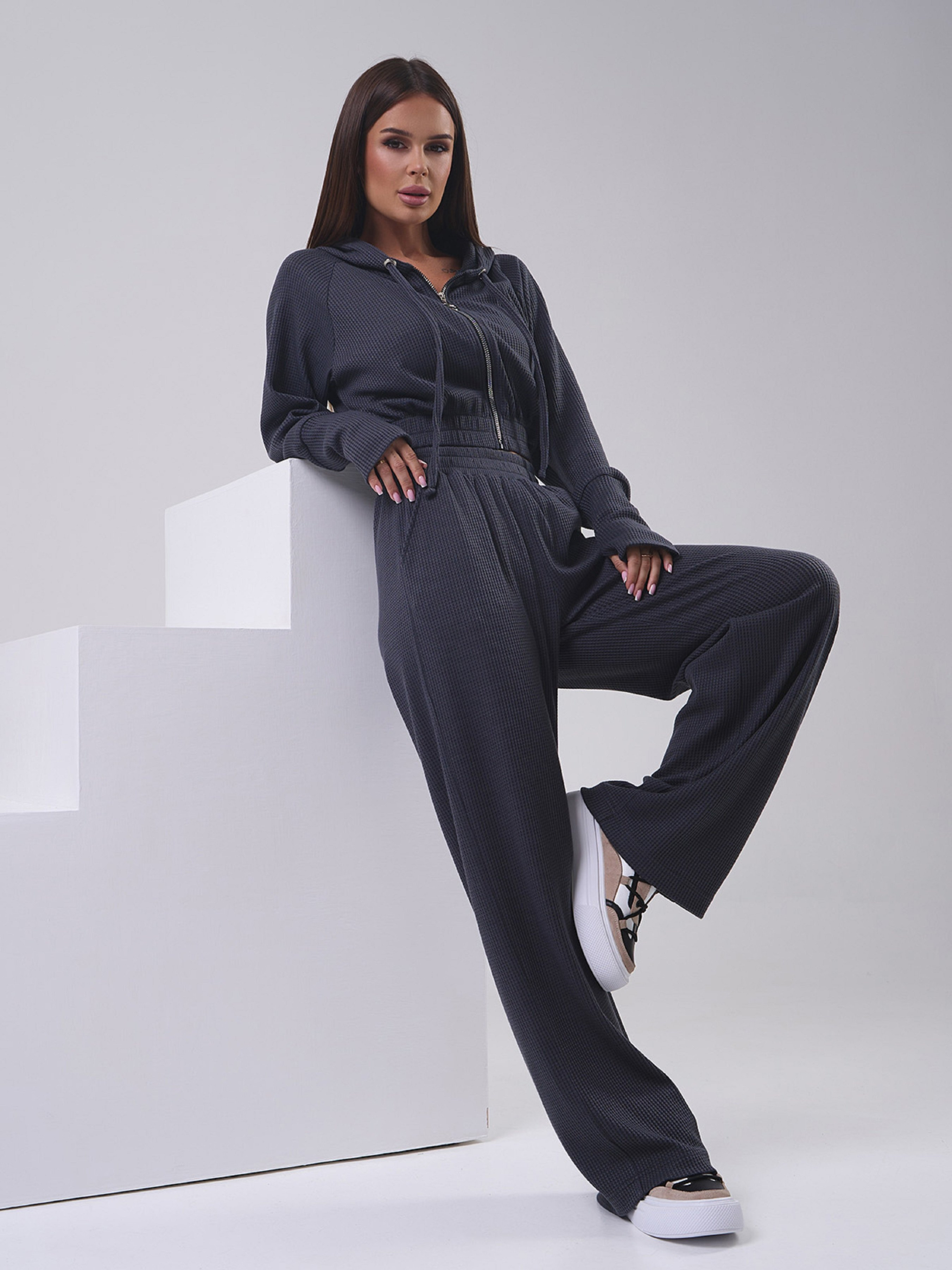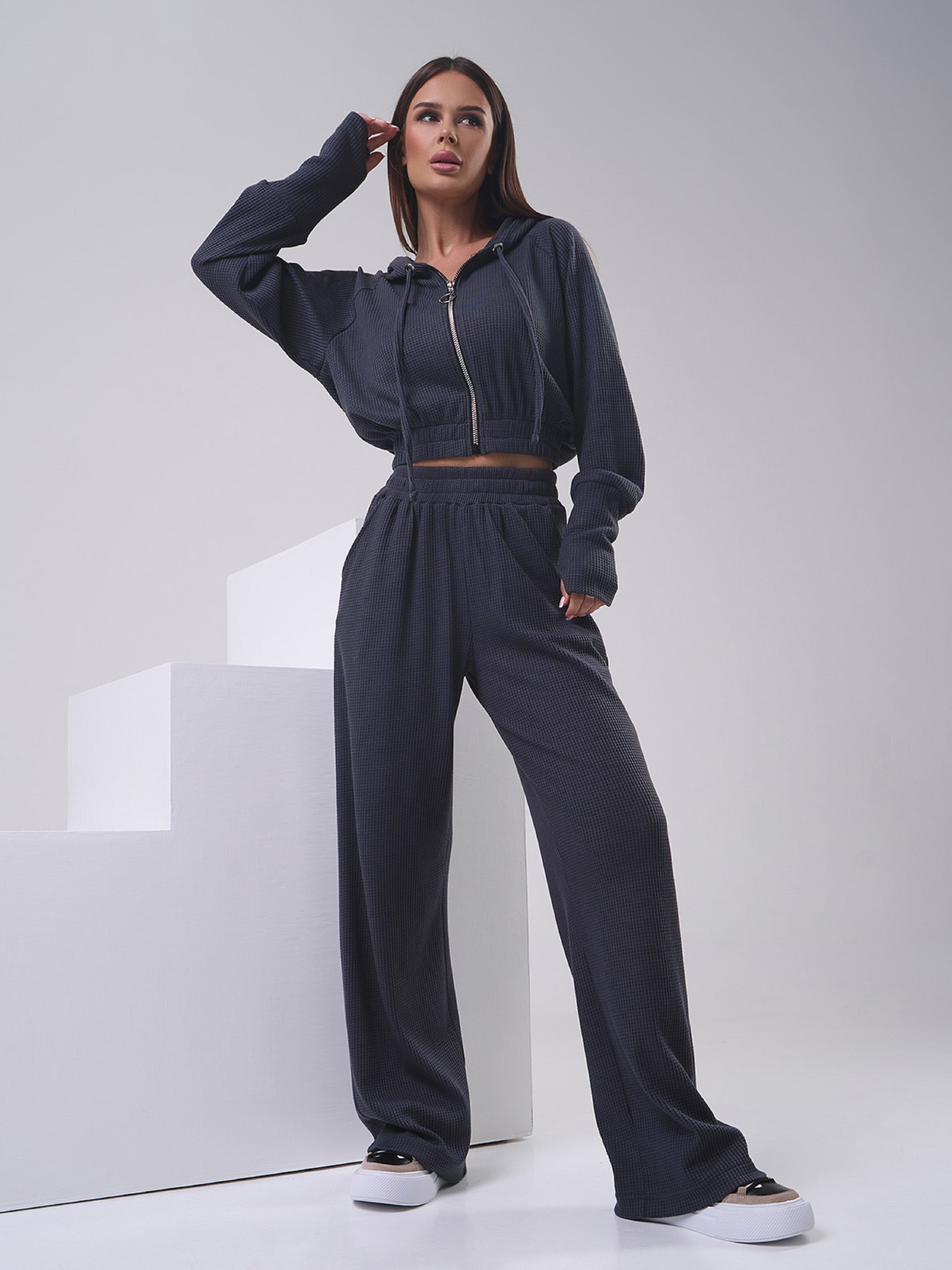 Темно-сірий костюм у спортивному стилі, виконаний з фактурного трикотажу. Толстовка-худі на блискавці з довгими рукавами та захисним капюшоном. Виріб короткої довжини з манжетами та вирізами для великих пальців. Штани з еластичною гумкою на талії, кишенями та широким прямим кроєм. Напівобхват: Кофта: Груди: S (49), M (51), L (53), XL (55), Довжина виробу - 46, Рукав - 58, Штани: Талія: S (30-40), M (32- 42), L (34-44), XL (36-46), Стегна: S (52), M (54), L (56), XL (58), Довжина виробу - 102, Довжина по внутрішньому шву - 73 , Тканина: Висока еластичність