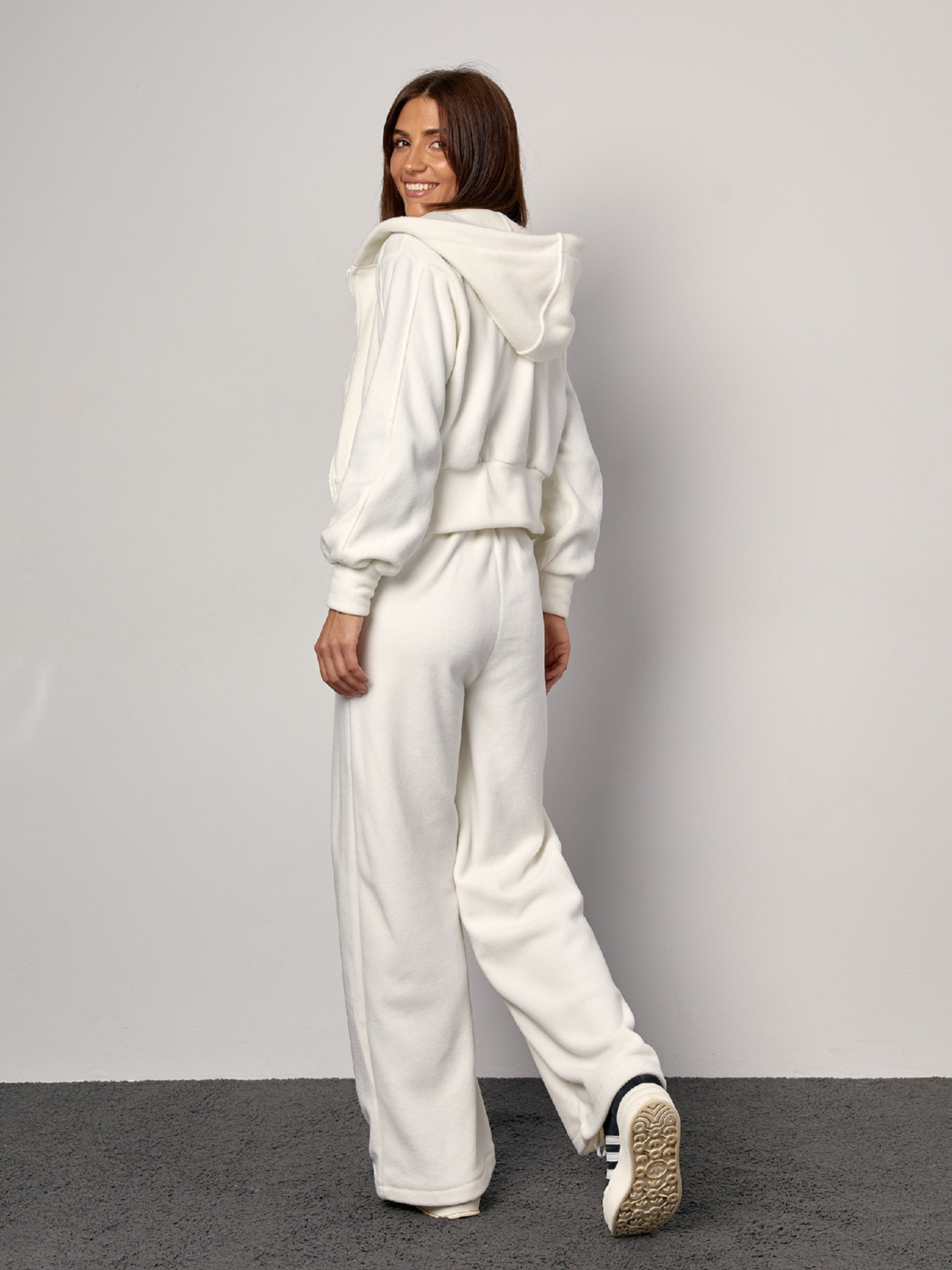 Утеплений костюм з однотонного молочного флісу з короткою толстовкою на блискавці. Толстовка з манжетами, капюшоном та довгими рукавами. Штани прямого крою з резинкою ззаду, фіксованими стрілками та декором з листочків та гульфіка. Штани з кишенями. Напівобхват: Кофта: Груди: S (50), M (52), L (54), XL (56), Довжина виробу - 49, Рукав - 56, Штани: Талія: S (33), M (35), L (37), XL (39), Стегна: S (48), M (50), L (52), XL (54), Довжина виробу - 106, Довжина по внутрішньому шву - 74, Тканина: Низька еластичність.