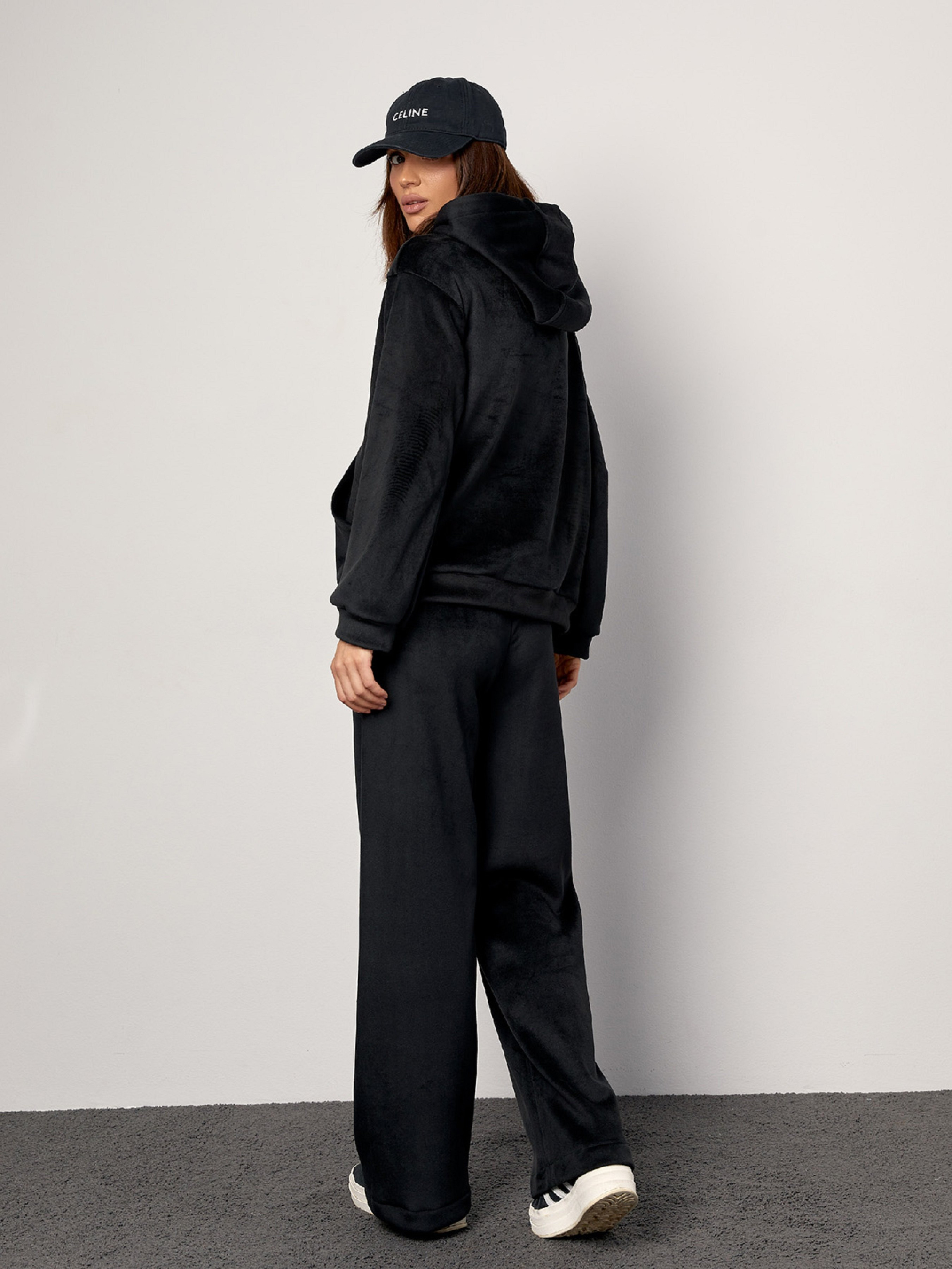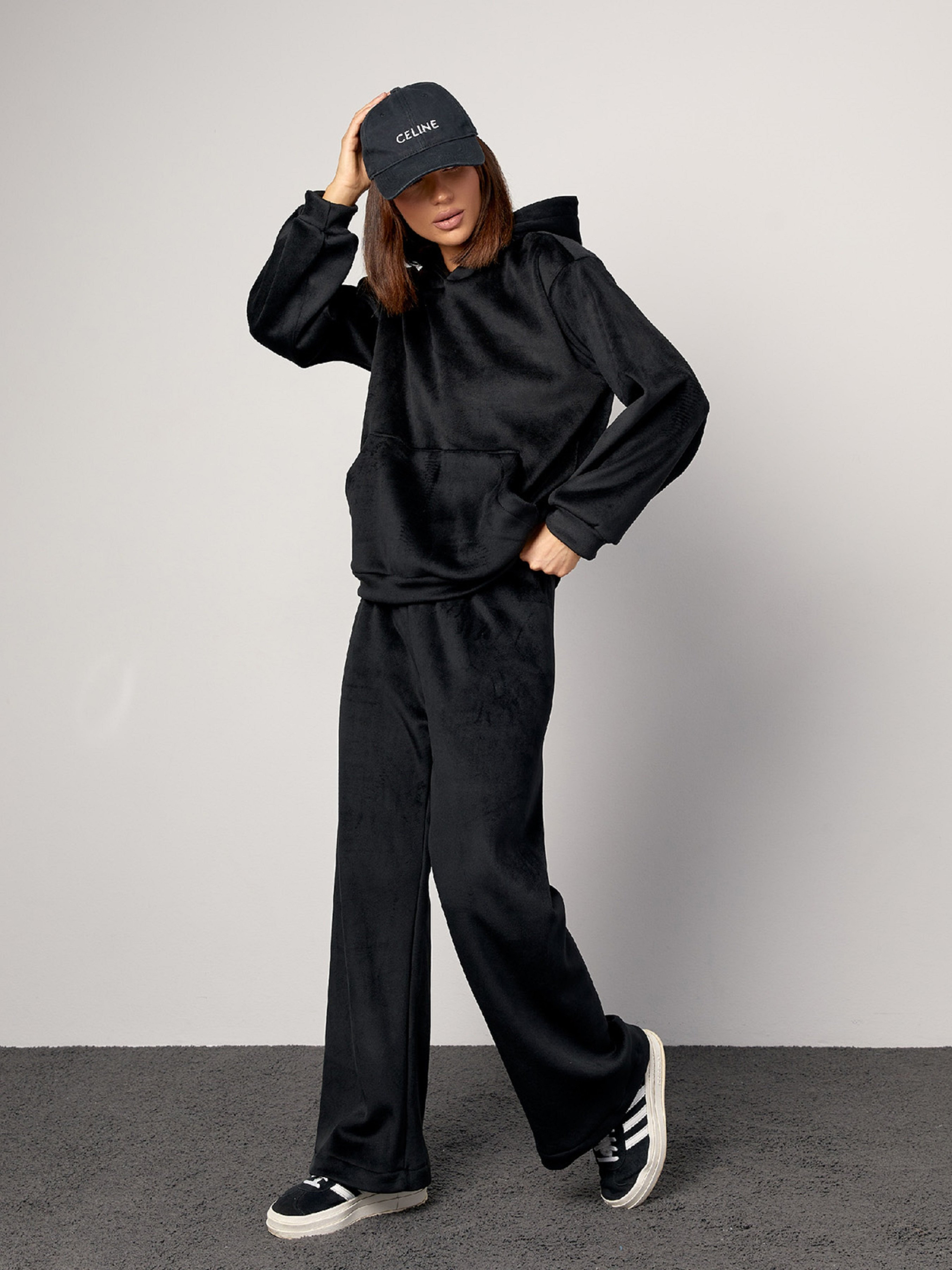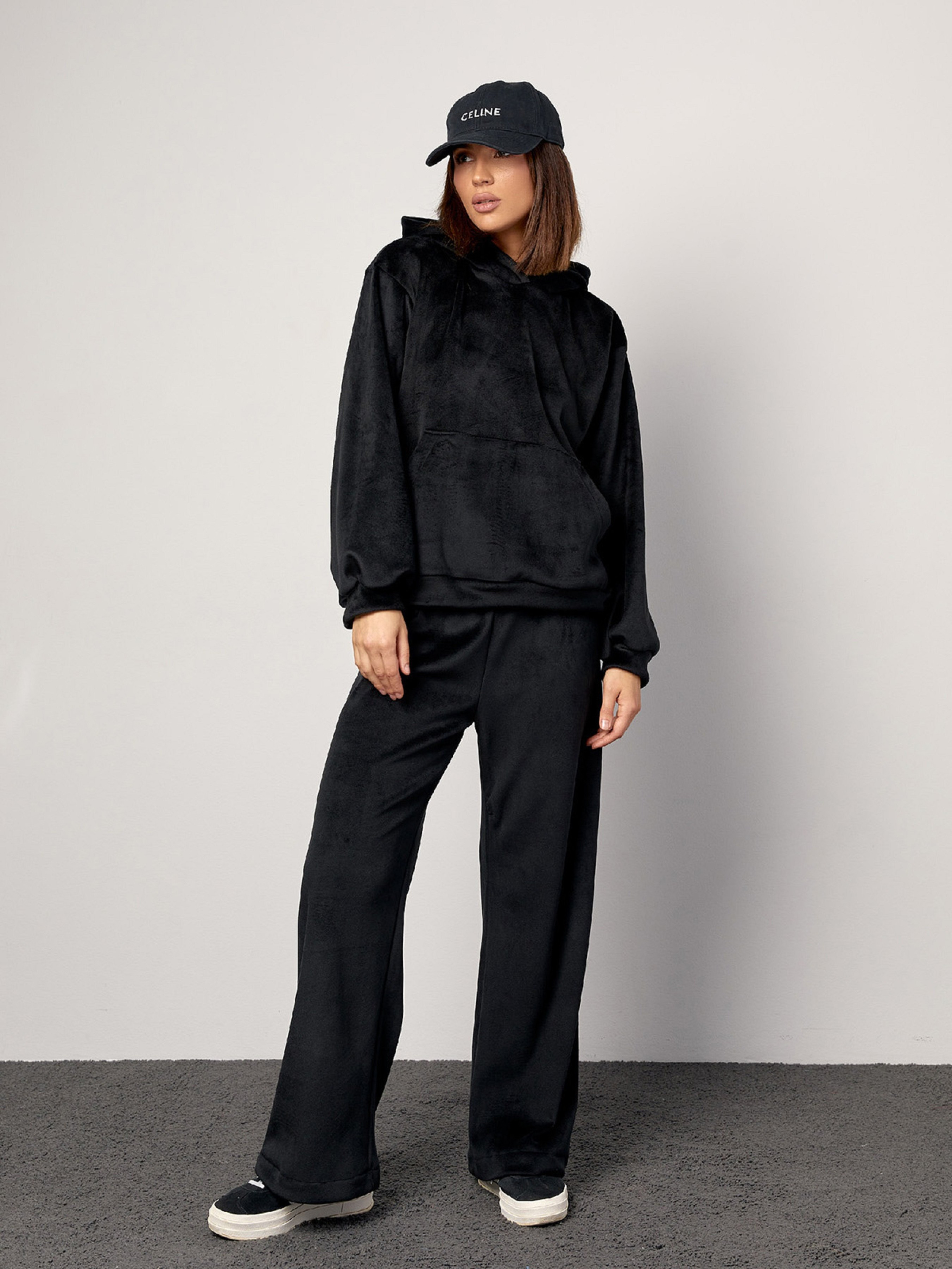 Молодіжний спортивний костюм вільного крою, виготовлений з двостороннього велюру чорного кольору. Толстовка з капюшоном, довгими рукавами, кишенею спереду та манжетами. Штани прямого крою з поясною гумкою. Напівобхват: Кофта: Груди: S (54), M (56), L (58), XL (60), Довжина виробу - 60, Рукав - 54, Штани: Талія: S (32-40), M (34- 42), L (36-44), XL (38-46), Стегна: S (50), M (52), L (54), XL (56), Довжина виробу - 103, Довжина по внутрішньому шву - 73 , Тканина: Висока еластичність.