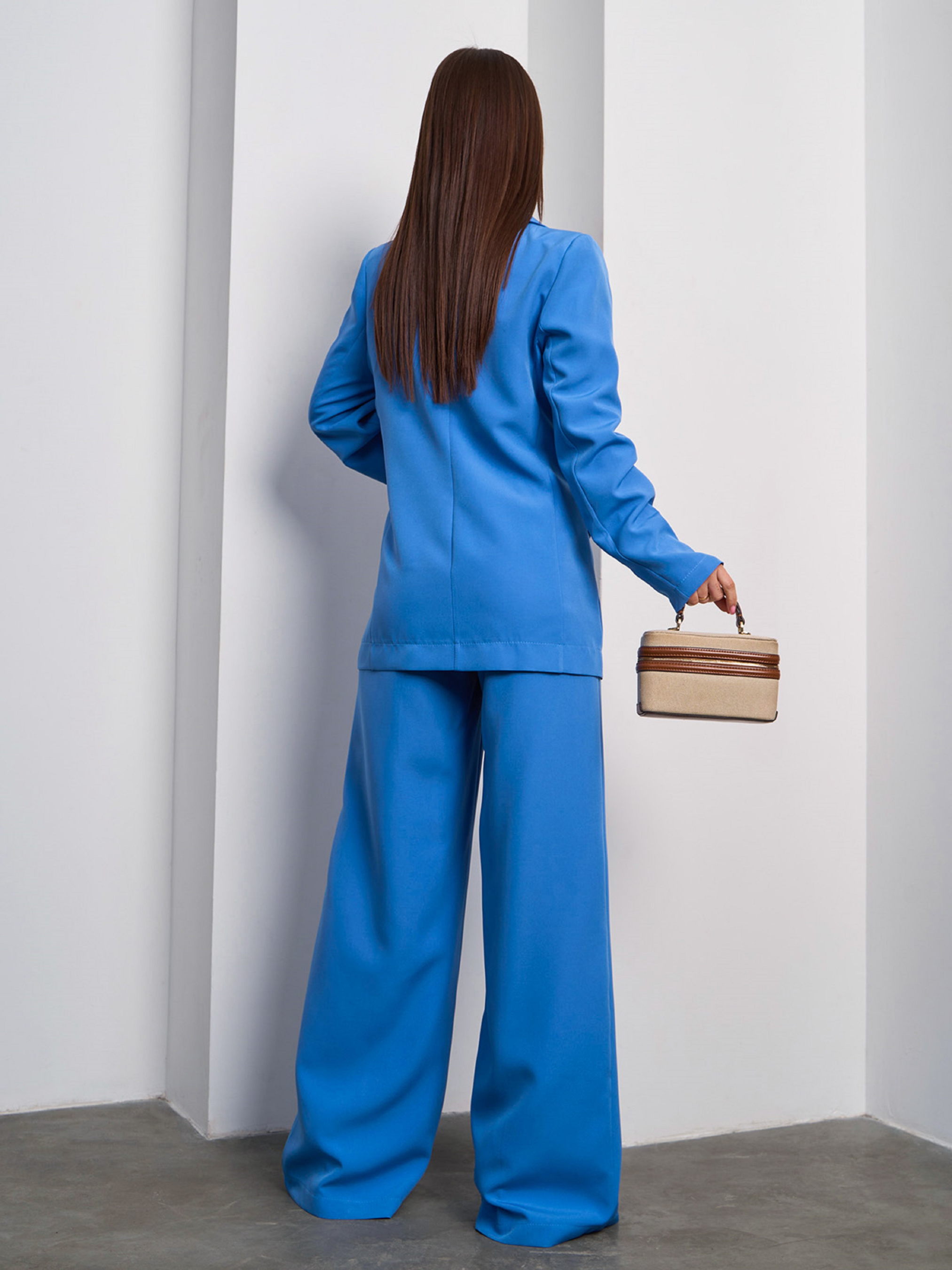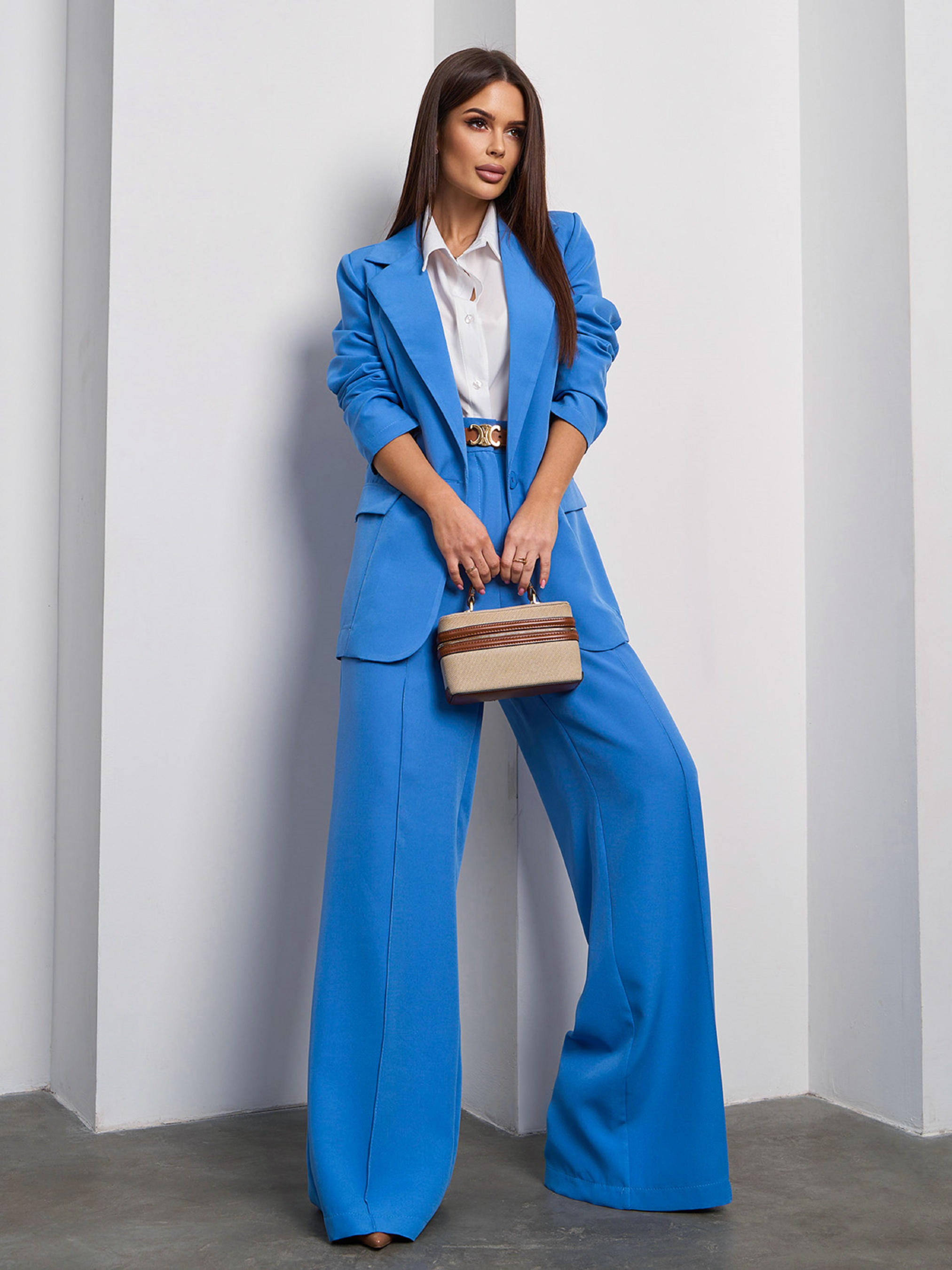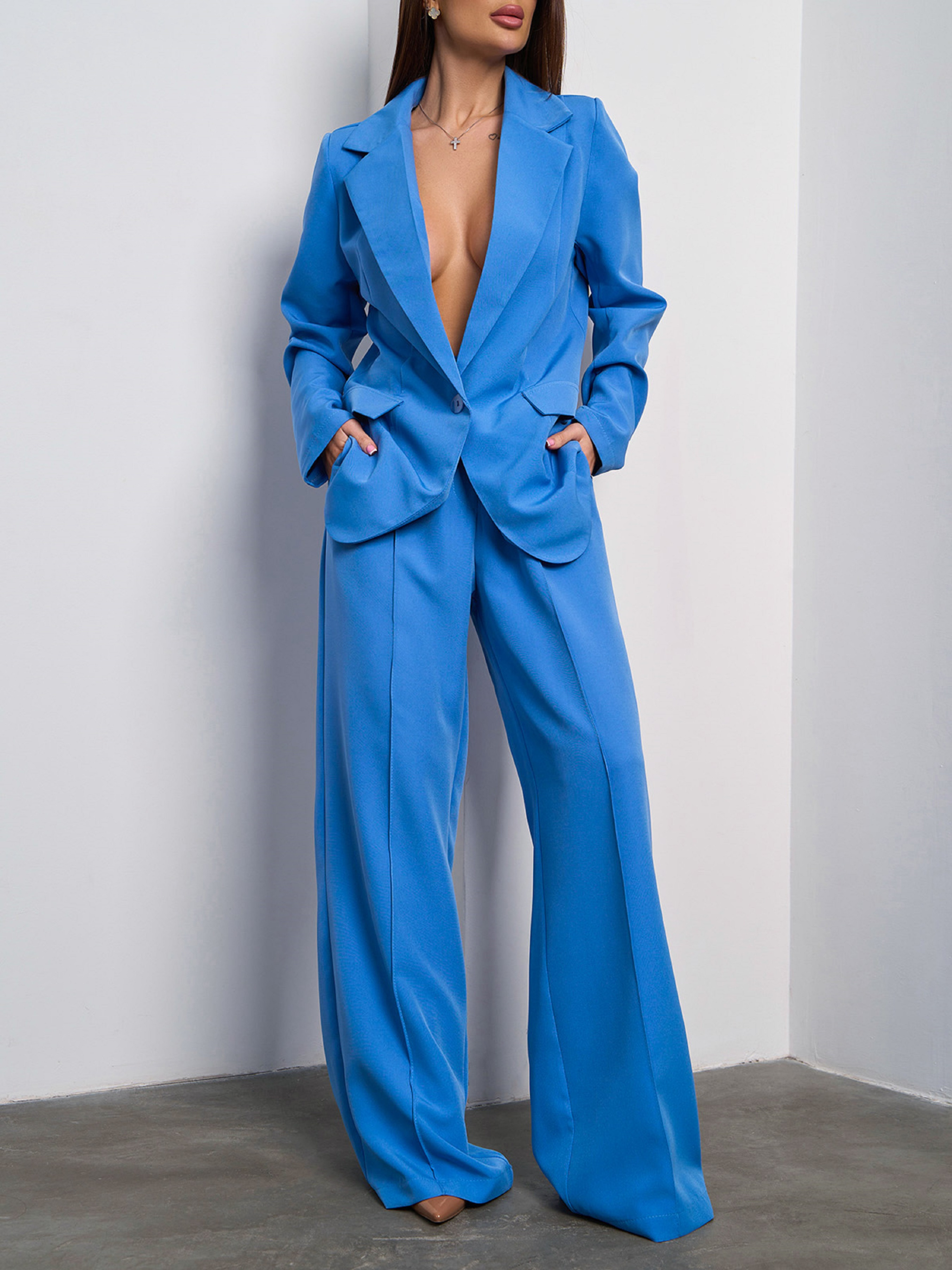 Класичний брючний костюм, виконаний з блакитної однотонної костюмної тканини. Піджак з довгими рукавами та декоративними клапанами оснащений підплічниками та англійським коміром. Штани вільного прямого крою зі стрілками та кишенями. Модель на гудзику та блискавці оснащена резинкою ззаду. Костюм без підкладу. Напівобхват: Піджак: Груди: S (47), M (51), L (52), XL (54); Довжина виробу - 73; Рукав - 63. Штани: Талія: S (31), M (33), L (36), XL (38); Стегна: S (53), M (56), L (55-59*), XL (56); Довжина виробу - 111; Довжина по внутрішньому шву - 82. Тканина: Низької еластичності. Склад: 59% поліестер, 21% еластан, 20% бавовна