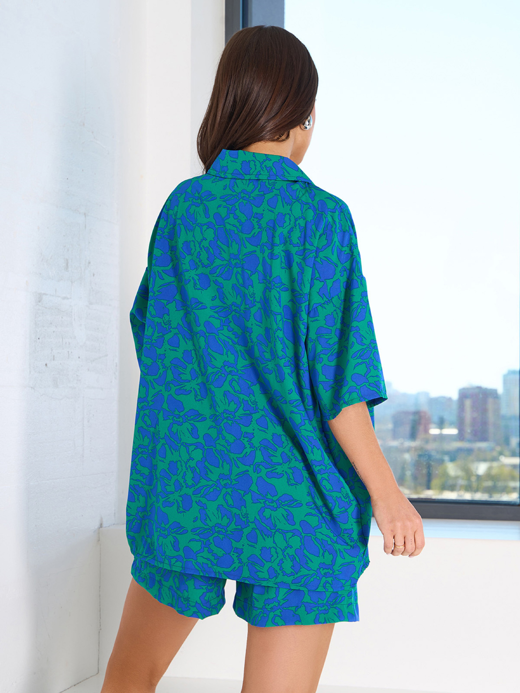 Зелено-синій квітковий костюм із софту із шортами та подовженою вільною сорочкою. Сорочка на гудзиках з рукавами до ліктів та англійським коміром. Шорти високої посадки з нашивкою на широкій резинці. Шорти з кишенями та декоративними гудзиками. Напівобхват: Сорочка: Груди: S (62), M (64), L (66), XL (68), Довжина виробу - 72, Рукав - 24, Шорти: Талія: S (32-42), M (34-44), L (36-46), XL (38-48), Стегна: S (56), M (58), L (60), XL (62), Довжина виробу - 42, Тканина: Низької еластичності. Склад: 59% поліестер, 21% еластан, 20% бавовна