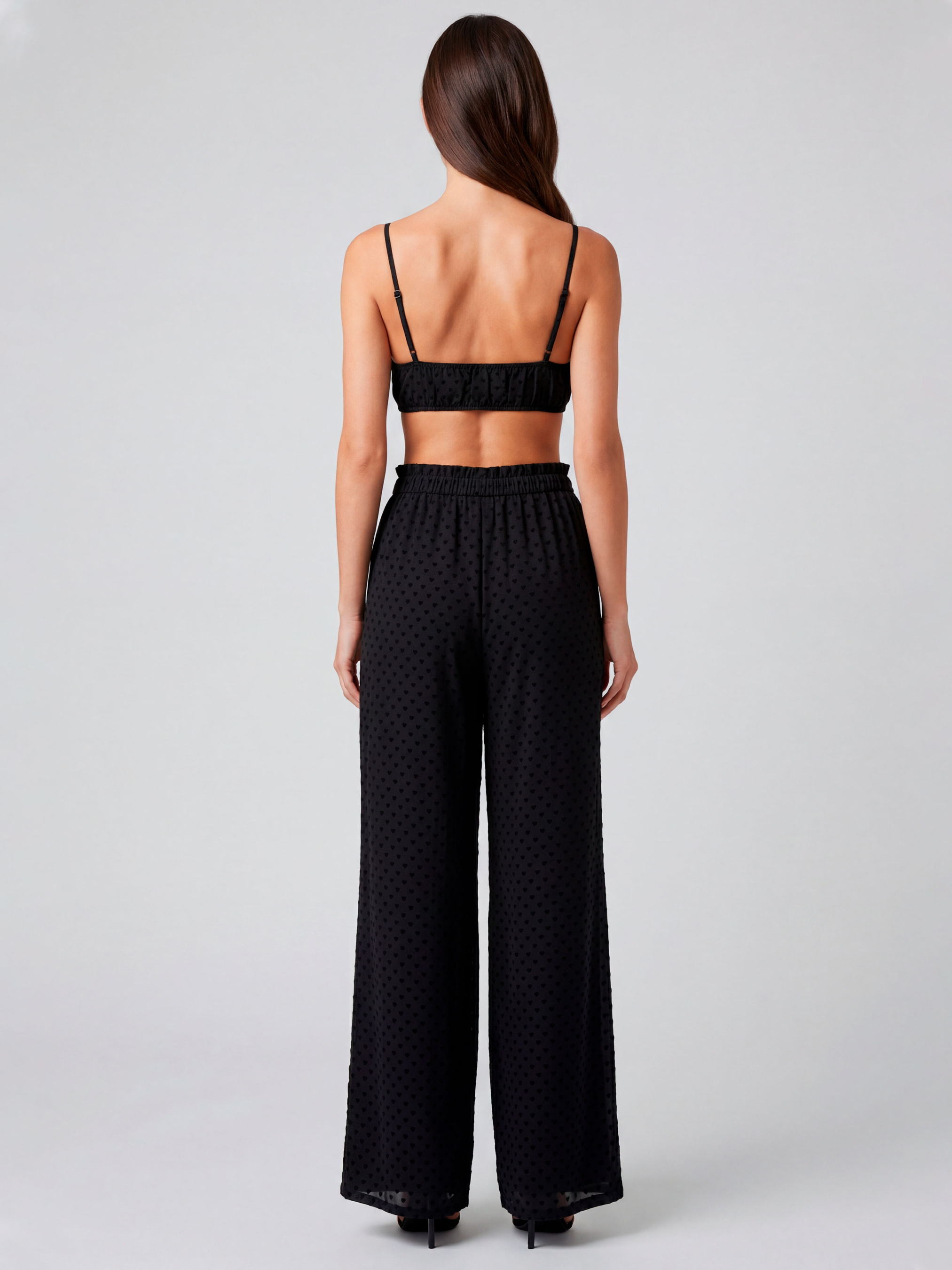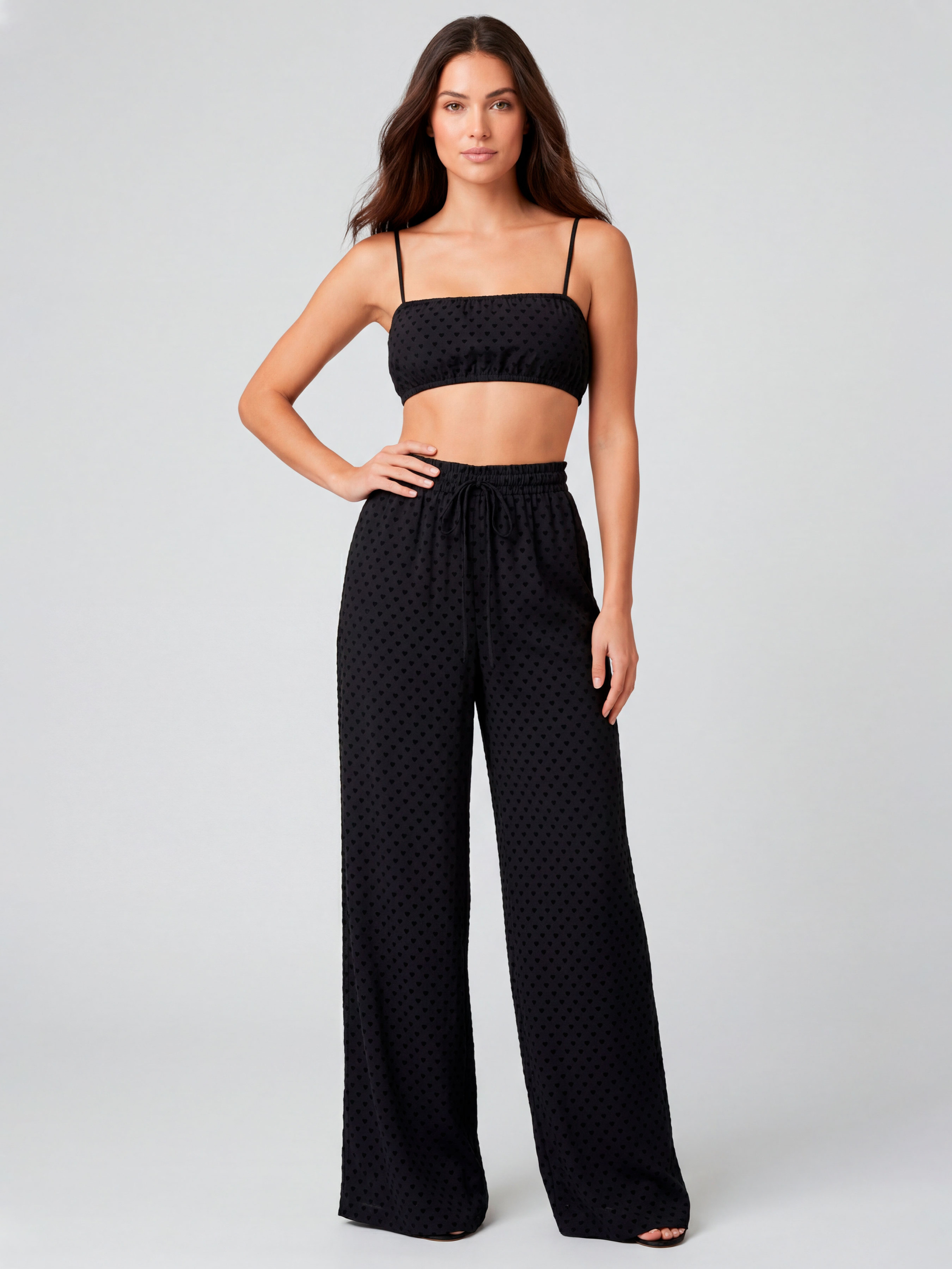 64% rayon 36% viscose. Жіночий чорний комплект з віскози − це про настрій тиші та впевненості, коли образ виглядає лаконічно, але з характером. Короткий топ на тонких бретелях формує відкриту лінію плечей і підкреслює силует, а м’яка посадка з еластичною куліскою акуратно фіксує його по фігурі. Лаконічний крій без зайвих деталей робить модель сучасною та легкою для поєднання. Широкі штани з високою посадкою додають балансу та створюють витягнутий силует. Пояс на резинці зі шнурком дозволяє регулювати об’єм і забезпечує комфорт протягом дня. Дрібний принт у вигляді сердечок на глибокому чорному фоні виглядає делікатно й ненав’язливо, додаючи образу грайливої жіночності без надмірної яскравості. Тканина м’яко лягає по тілу, красиво рухається та дарує відчуття свободи. Такий жіночий комплект із сердечками доречний для домашнього відпочинку, повільних ранків і камерних вечорів, а за бажанням легко інтегрується в міський стиль. Оберіть свій розмір і дозвольте собі цю глибину настрою: комплект можна купити та замовити онлайн. Відтінок тканини та принт можуть мати незначні відмінності від зображення на фото через особливості освітлення під час зйомки або індивідуальні налаштування екрана вашого пристрою.