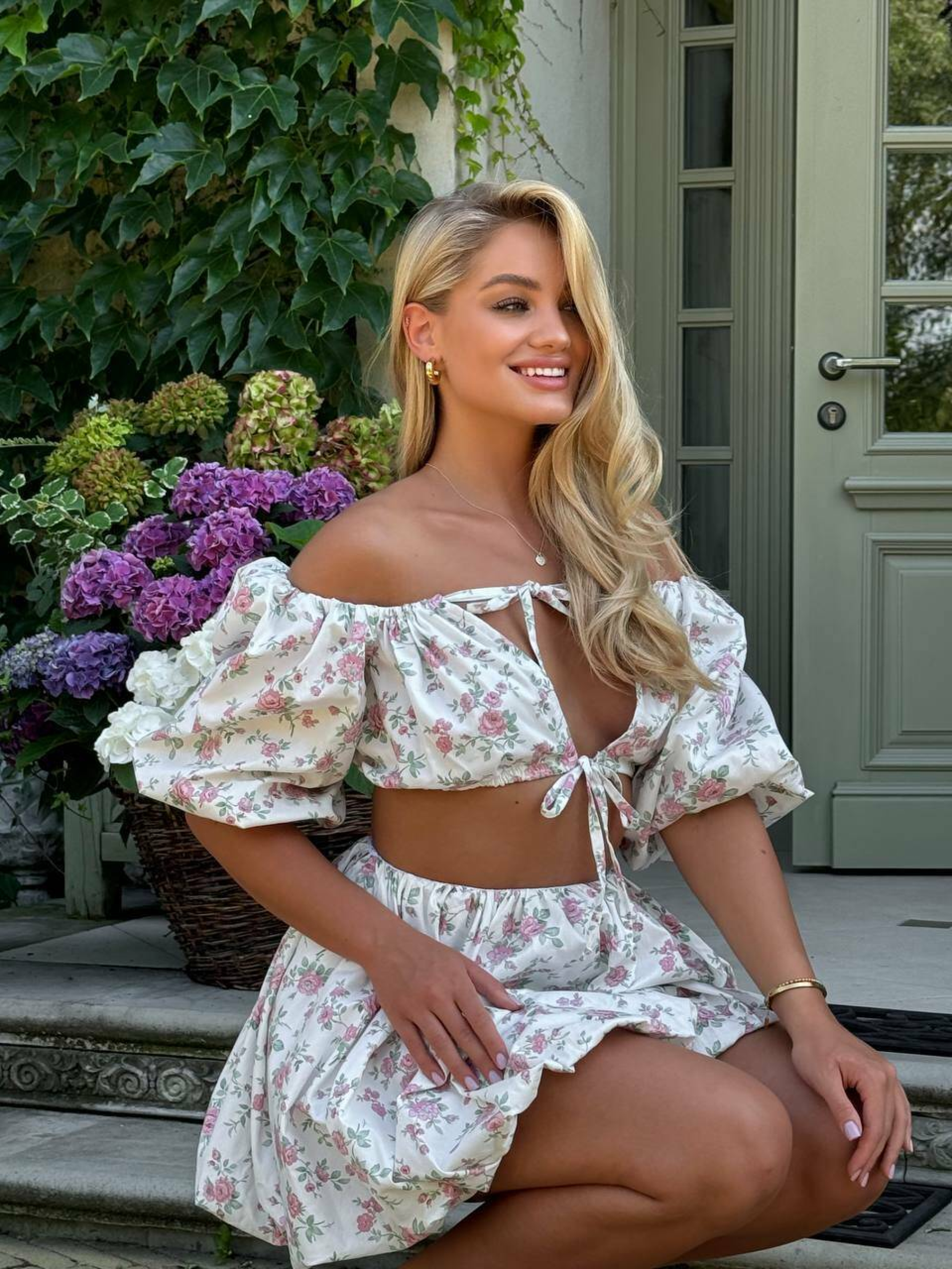 Характеристики: Тип: костюм (топ + спідниця) Сезон: літо Матеріал: 100% бавовна Довжина спідниці: міні Тип верху: ліф-топ із зав’язками Посадка спідниці: середня, на резинці Догляд: ручне або делікатне машинне прання при температурі до 30 °C прасування при температурі до 150 °C не відбілювати не піддавати хімічній чистці сушити у розкладеному вигляді, уникати прямого сонячного світла Особливості та переваги: топ має зручні зав’язки, що дозволяють регулювати об’єм та висоту посадки; спідниця-парашют вільного крою забезпечує комфорт і свободу рухів; натуральна бавовна приємна до тіла, не парить і не викликає подразнень; квітковий принт створює святковий, романтичний настрій; костюм легко комбінується з босоніжками, сандалями або кедами. Легкий та невагомий літній костюм Стефа створений для яскравих, сонячних днів. Комплект складається з лаконічного ліфа-топа та вільної міні-спідниці з ефектом “парашют”. Завдяки легкій бавовняній тканині костюм забезпечує комфорт навіть у спекотну погоду, а насичений квітковий принт додає образу свіжості та грайливості.